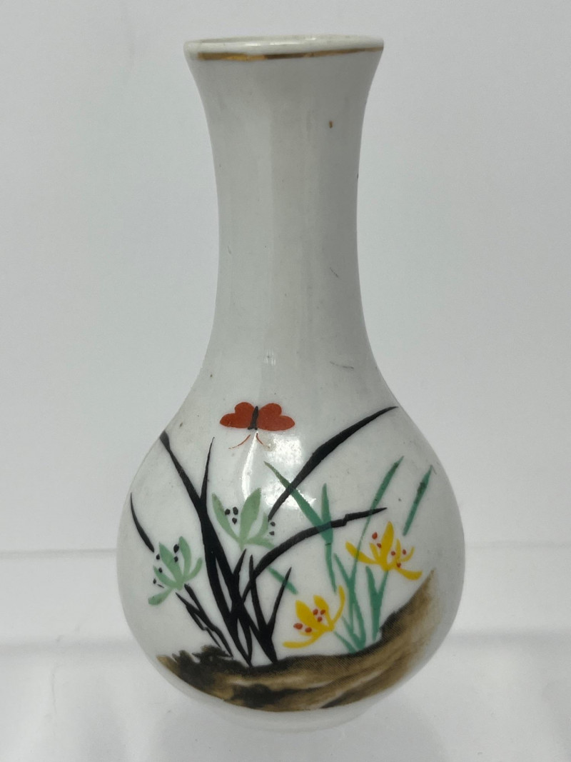 A curated grouping of three small Asian decorative items, each offering its own distinct style and craftsmanship. Cloisonné Mini Vase: Traditional enamelwork with fine wire detailing and rich color. Classic decorative form with the expected surface variation typical of cloisonné. White Floral Vase (Marked Made in China): Smooth glazed porcelain with a delicate floral motif. Underside bears a clear Made in China mark. Clean presentation with no noted structural issues. White Horse‑Shaped Bell: Bell‑form figure shaped as a stylized horse, decorated with an Asian motif on the body. Light wear consistent with age and handling. A cohesive small lot suitable for collectors of Asian decorative arts, shelf displays, or mixed‑media vignette arrangements. All pieces present well with no major condition concerns noted.
