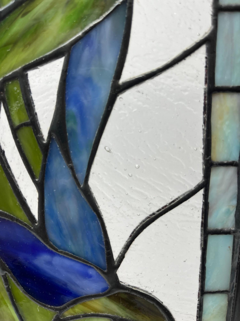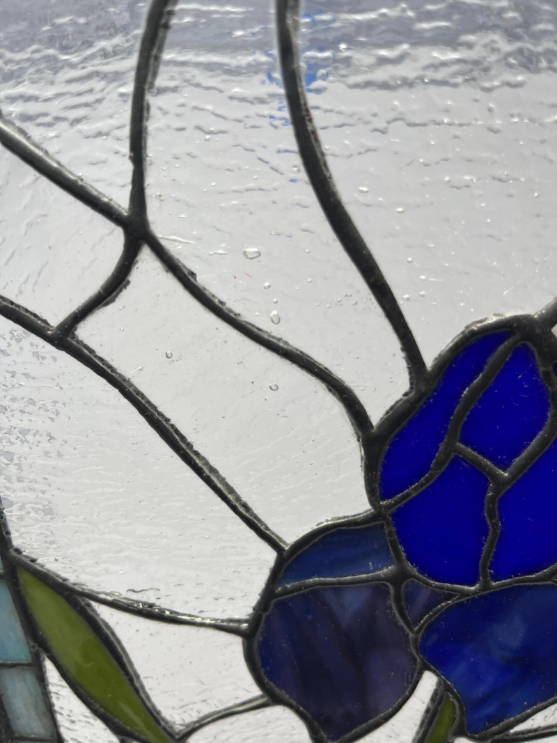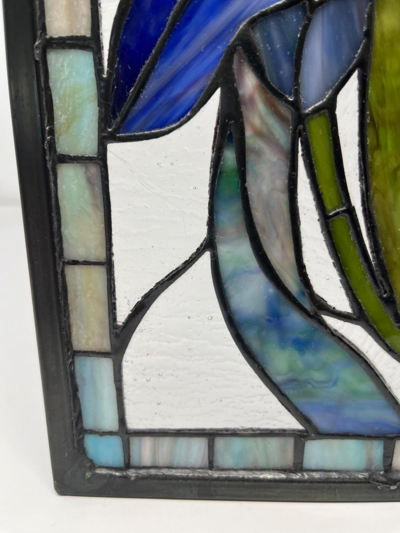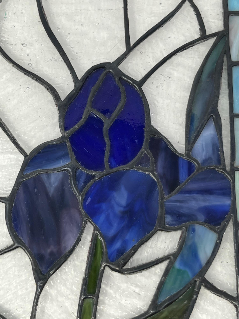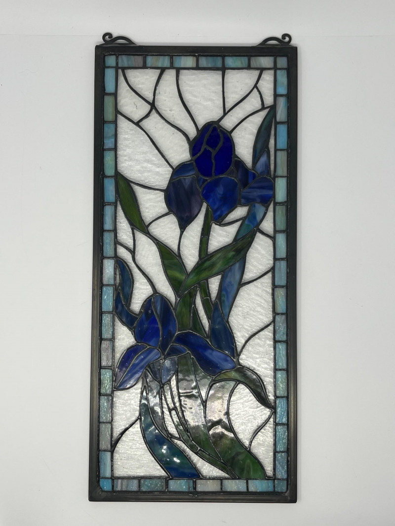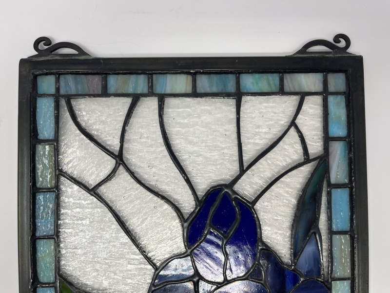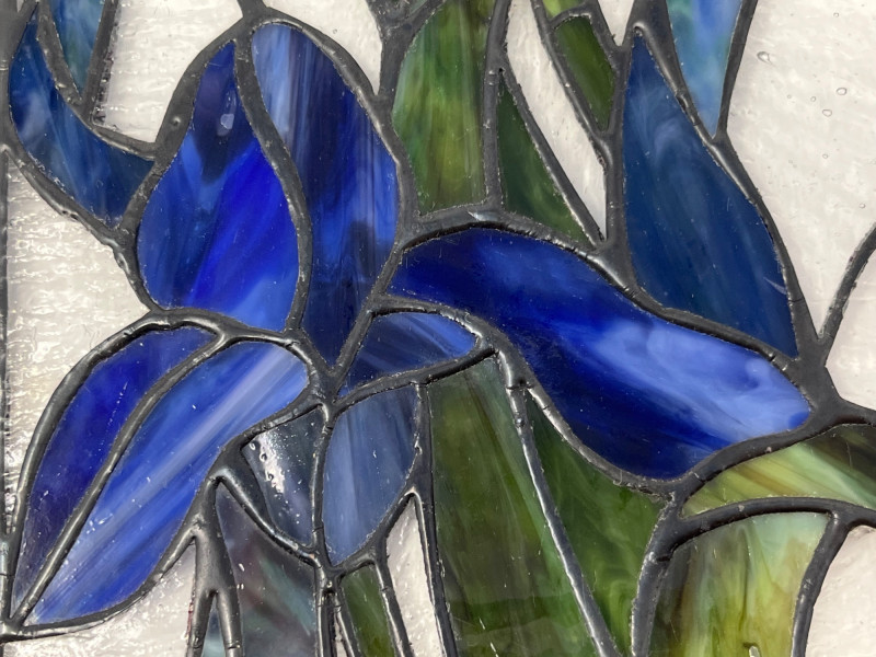 Handcrafted stained glass panel featuring a stylized iris motif in rich blues, greens, and complementary tones. The piece is assembled using traditional leaded construction, creating defined lines and a classic window‑panel look. Color transitions show well when backlit, making it suitable for display in a window, lightbox, or as a decorative wall element. Glass surfaces show natural variations consistent with handmade work. Lead came appears intact with no noted separation. A decorative piece suited for collectors of stained glass, floral art, or traditional craftwork.