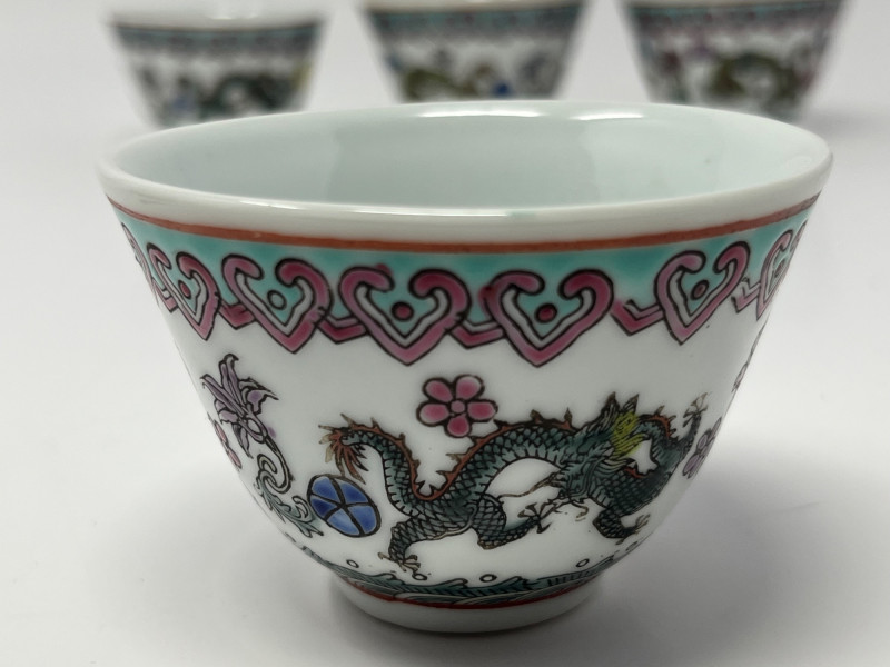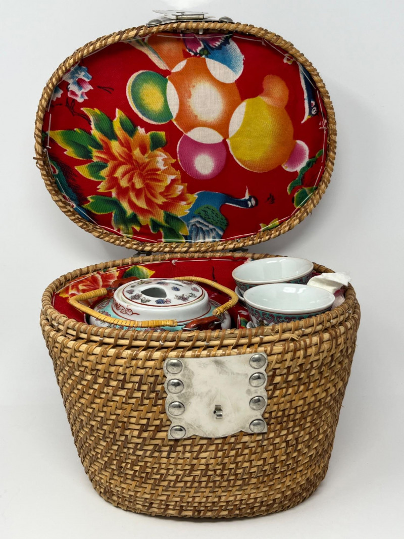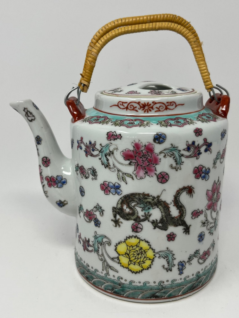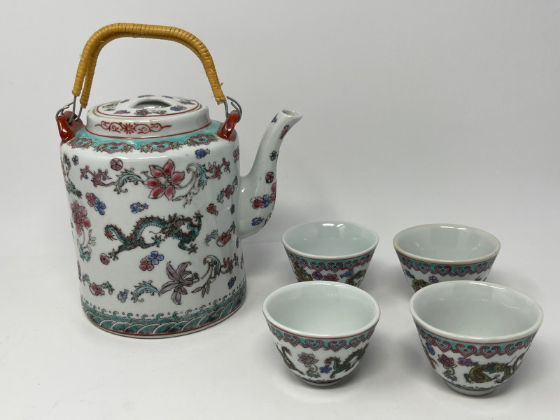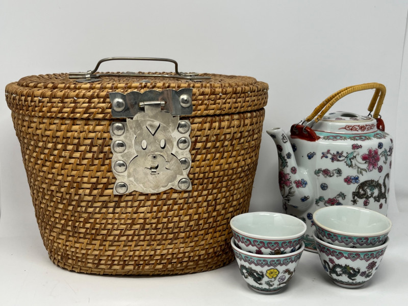 Lot # 85 - Chinese Export Dragon Teapot & Teacup Set with Lined Basket