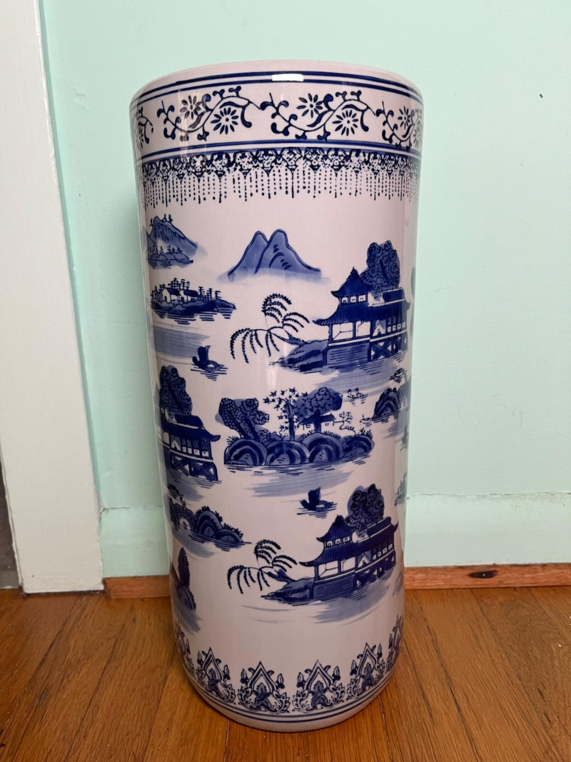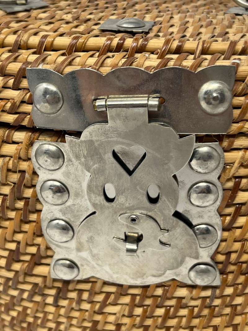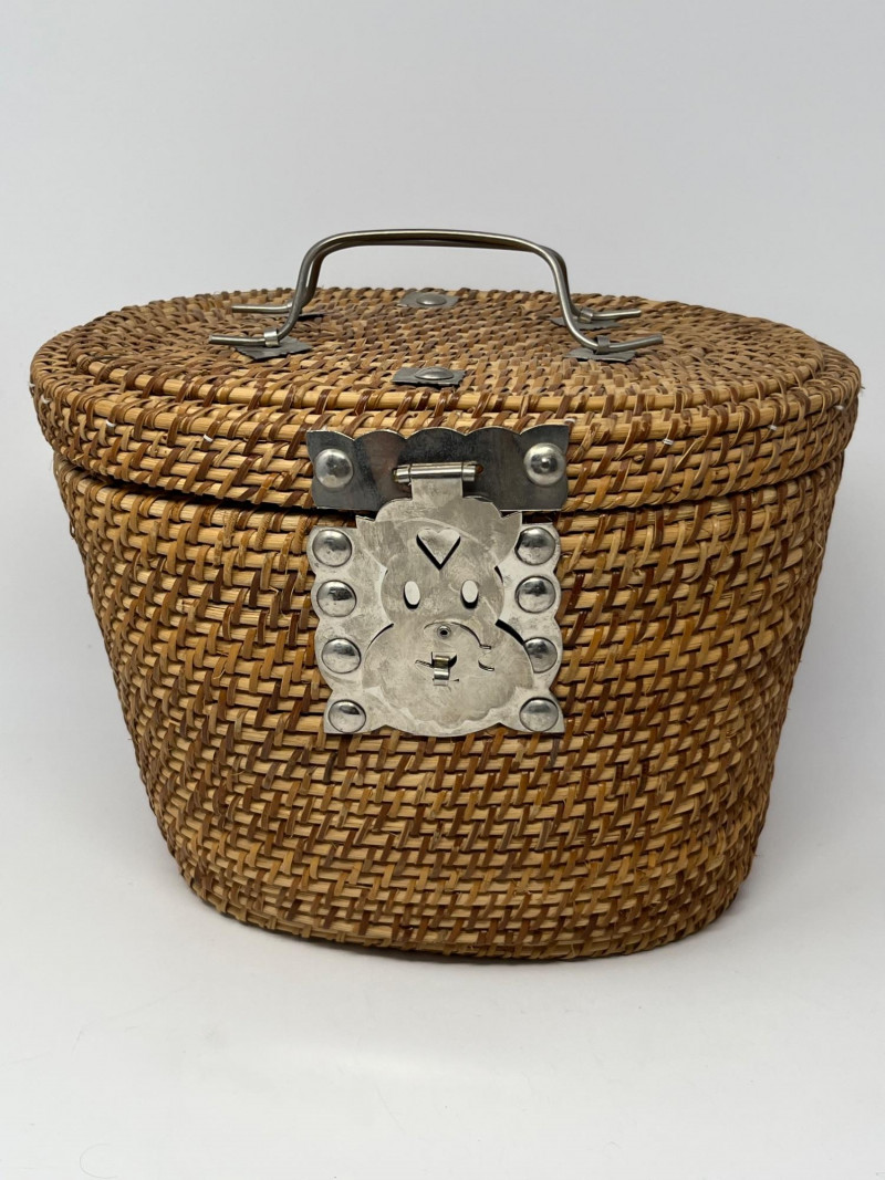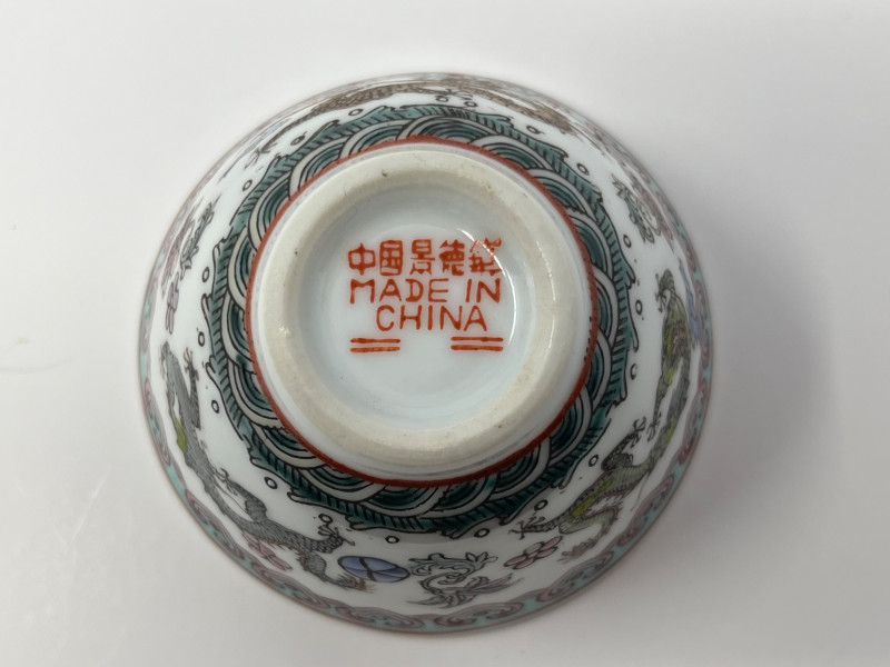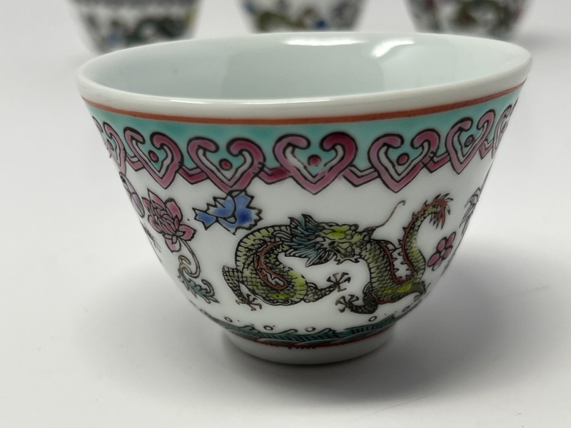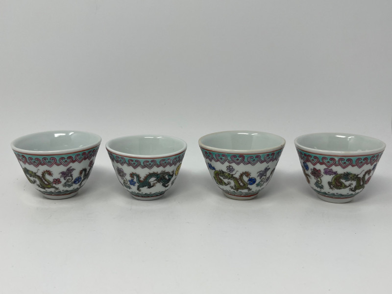 A vintage Chinese tea set consisting of a lidded teapot and four matching teacups, all housed in a fitted, fabric‑lined carrying basket. Each ceramic piece is marked Made in China on the underside and features traditional Asian‑inspired dragon motifs, a classic decorative theme associated with mid‑century export ware. The lined basket provides an attractive presentation and secure storage, making the set suitable for display, gifting, or functional use. Condition is consistent with age and prior handling, with no notable issues observed during intake. A charming addition for collectors of Chinese ceramics, tea culture items, or decorative household pieces.