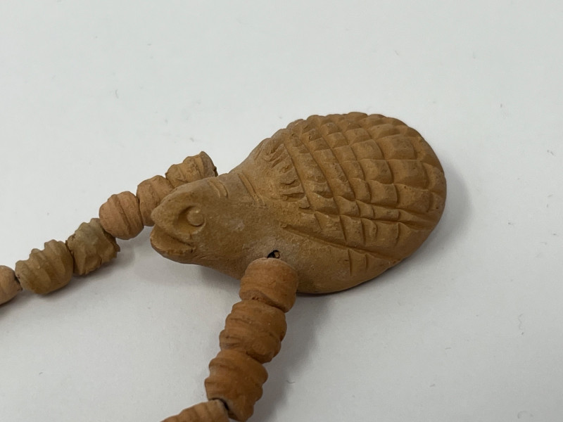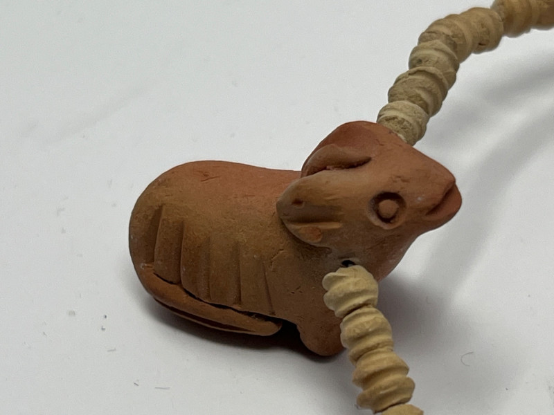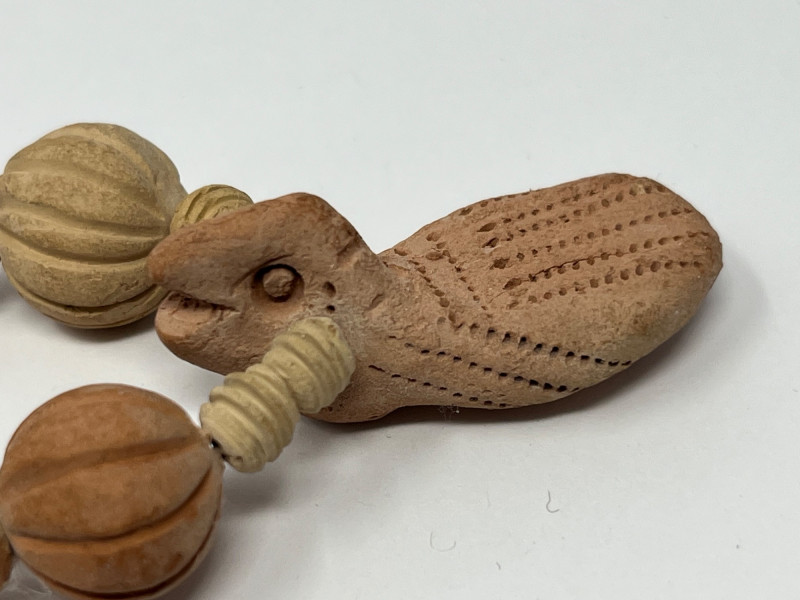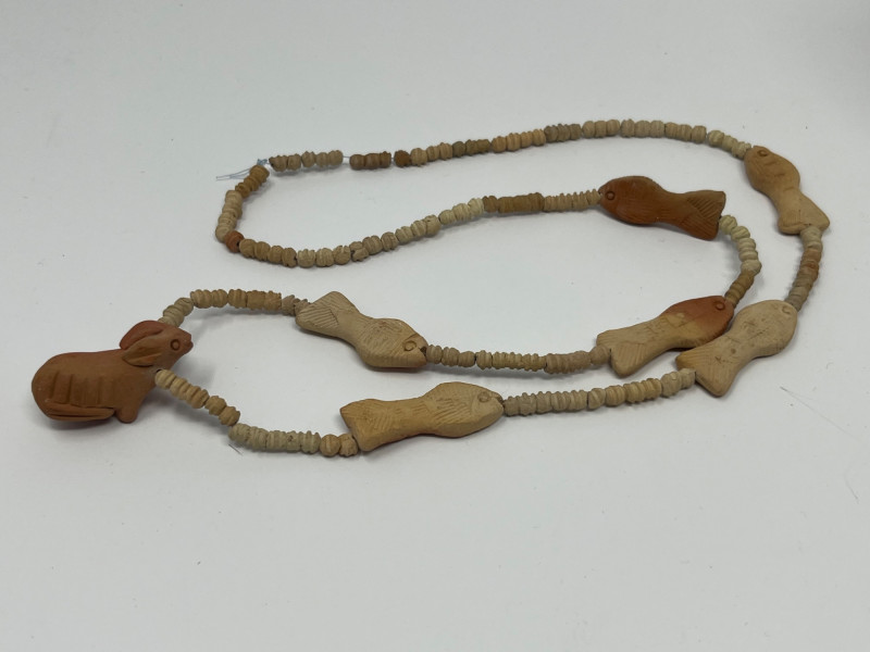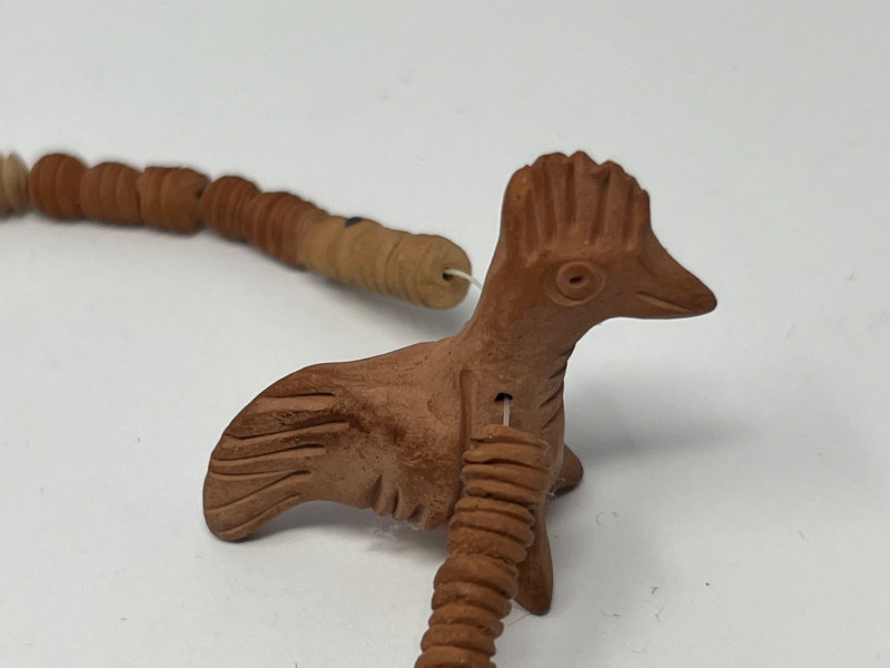 Lot of five handcrafted necklaces from Mexico featuring traditional clay beadwork and molded clay animal figures. Designs include stylized birds, fish, and other folk‑art motifs, each formed in natural clay with hand‑painted or burnished surface details. Strands include assorted clay beads and individually crafted animal components, reflecting regional craft traditions and small‑studio production. Necklaces are approximately 16–18 inches in length. All pieces are offered as found from the estate. Suitable for collectors of Mexican folk art, handmade jewelry, artisan beadwork, or those seeking unique decorative or wearable pieces.