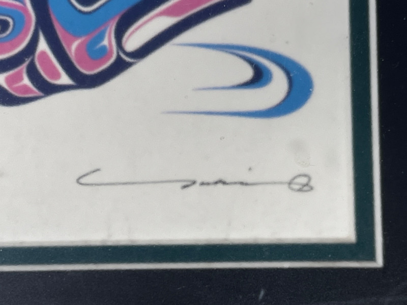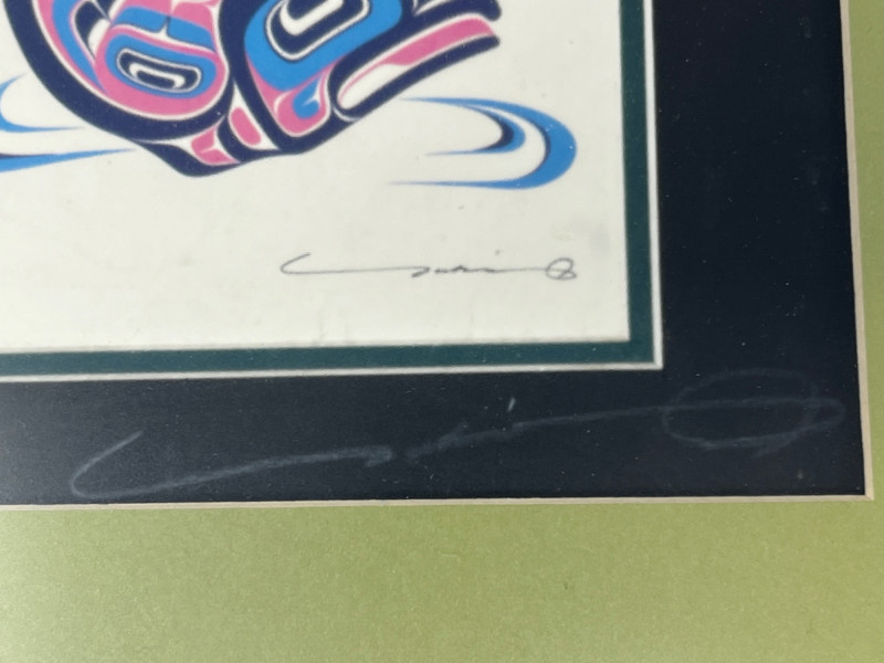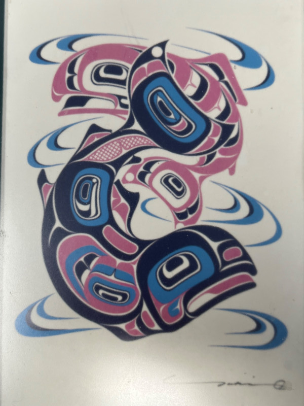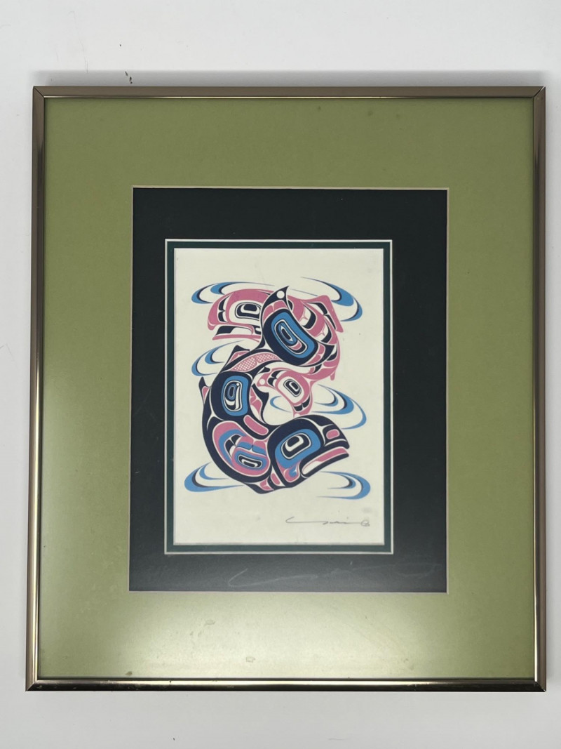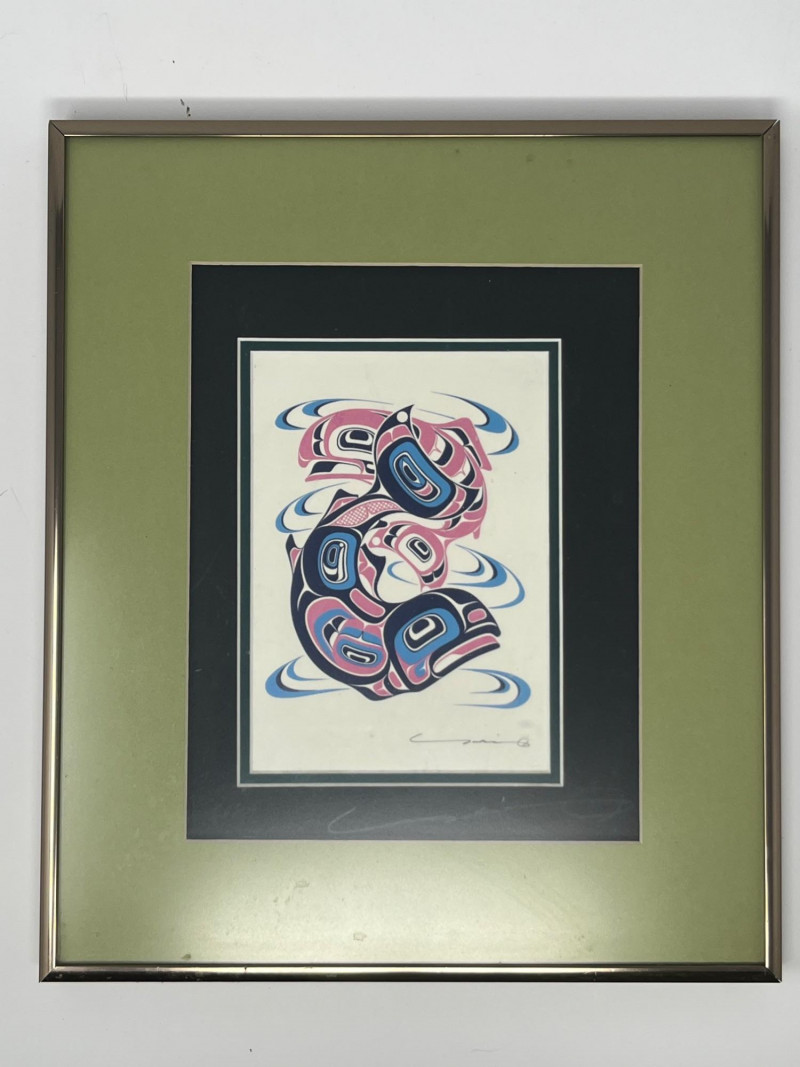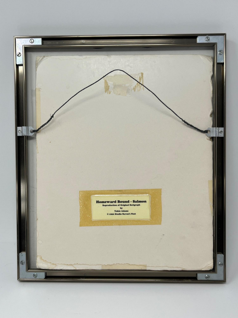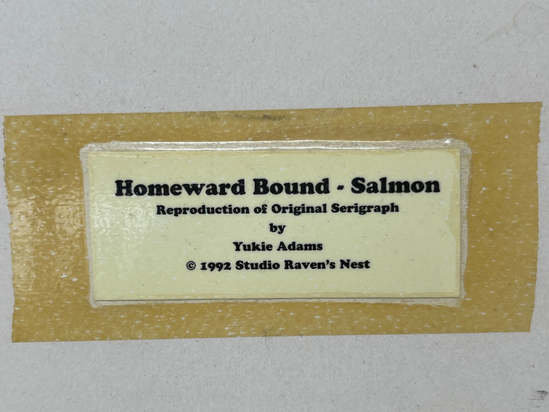 Reproduction of the original 1992 serigraph by Yukie Adams, presenting a dynamic Northwest salmon motif rendered in the artist’s signature stylized form. The imagery emphasizes movement and return, with layered color fields and crisp graphic contours characteristic of Adams’ work. This reproduction includes the artist’s signature on both the artwork and the matting. Colors remain strong, and the piece displays well overall. Framed and matted presentation suitable for display. A striking example of Pacific Northwest–themed contemporary printwork, reflecting the region’s longstanding visual traditions and cultural relationship with salmon.