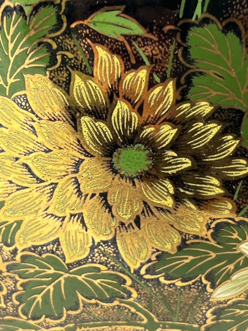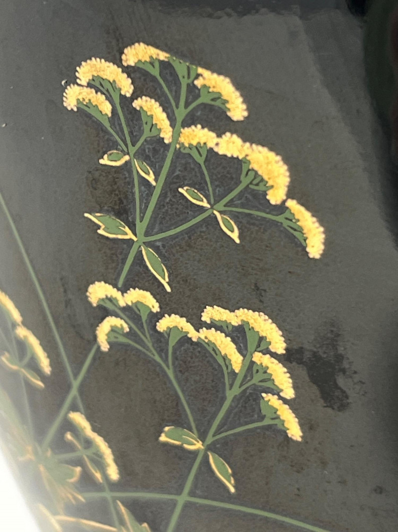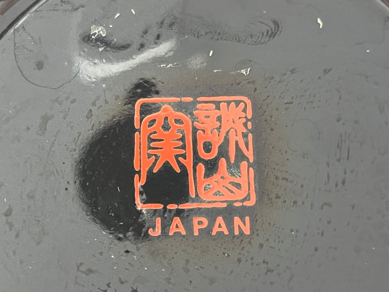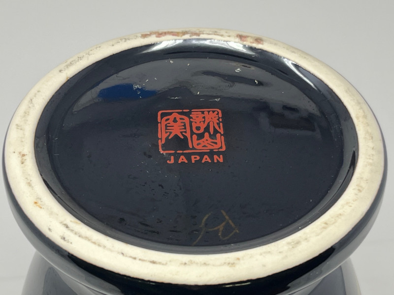A vintage Japanese black porcelain vase featuring a deep, high‑gloss glaze and a traditional, understated form. The glaze shows subtle tonal variation characteristic of mid‑century studio production. The underside bears a “Japan” stamp accompanied by Japanese characters, consistent with export‑era marking practices. The characters are present but not translated. Sourced from a long‑established Seattle estate known for collecting Asian ceramics. No additional maker’s mark observed. The piece presents well with no noted structural concerns and offers strong appeal for collectors, decorators, and those interested in mid‑century Japanese porcelain.