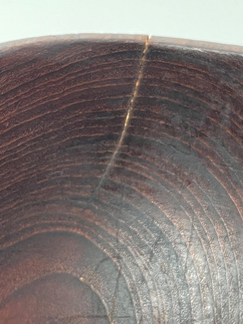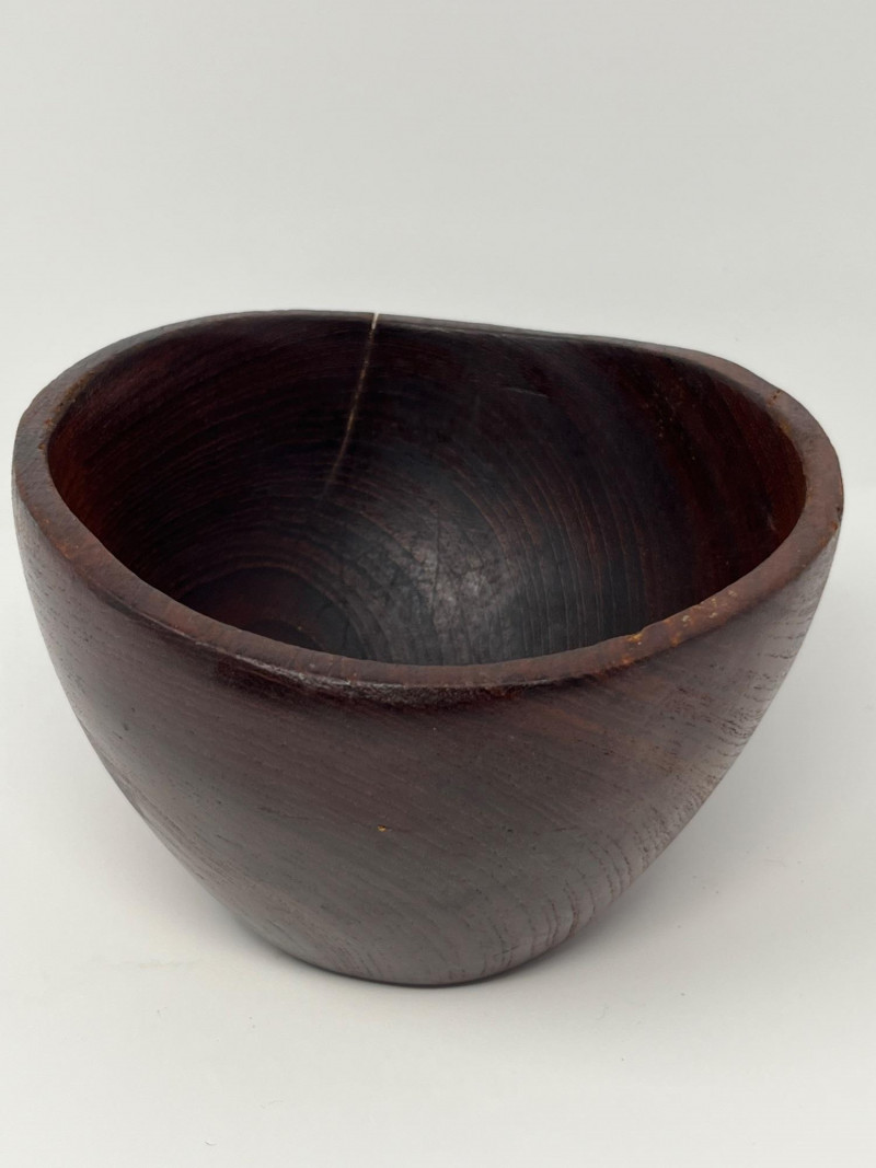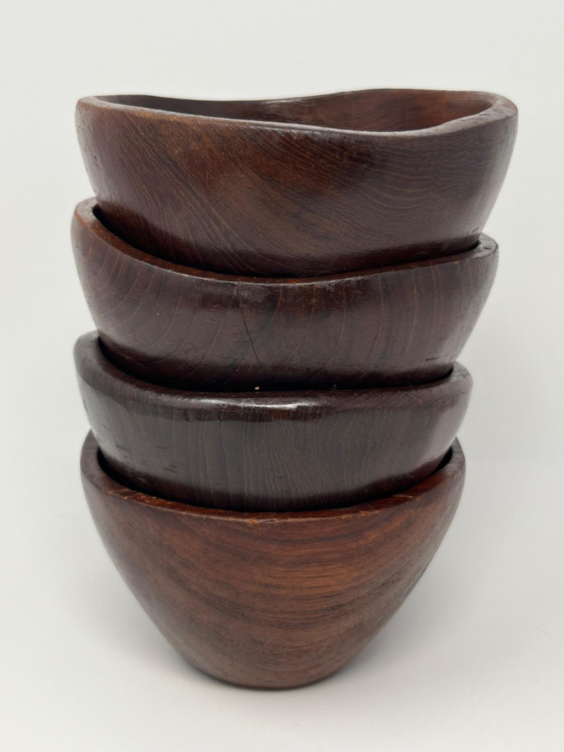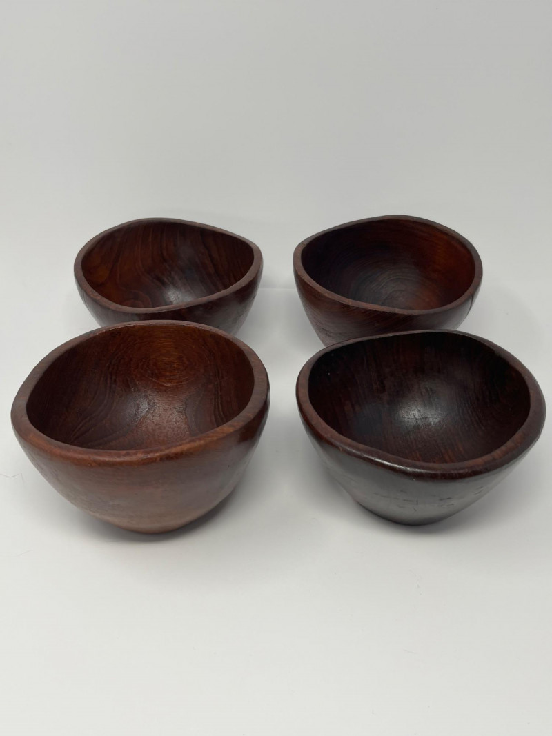 A cohesive set of hand‑carved teak bowls with the warm grain, sculptural shaping, and organic modern lines prized in mid‑century interiors. Each piece shows the subtle asymmetry and tool‑carved character typical of artisan teakwork from the period, making them equally suitable for display or functional use. Surfaces show light, age‑appropriate wear. One bowl has a small photographed crack; it remains stable and fully usable for dry or non‑liquid contents. The set presents beautifully together, with rich tonal variation and a clean, understated profile that complements MCM, Scandinavian, and natural‑material design schemes. Ideal for collectors, stylists, and anyone building a warm, textural mid‑century vignette.