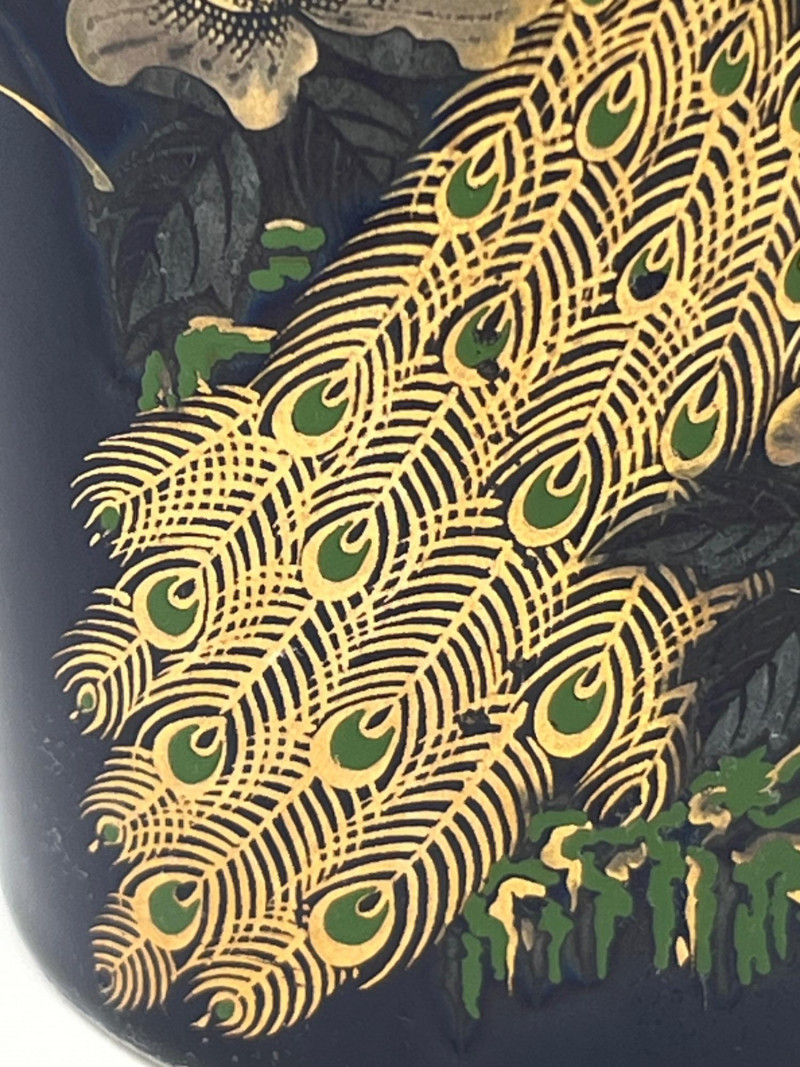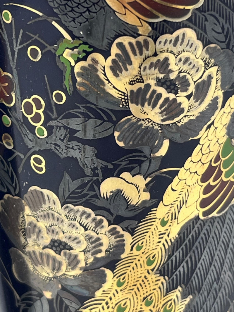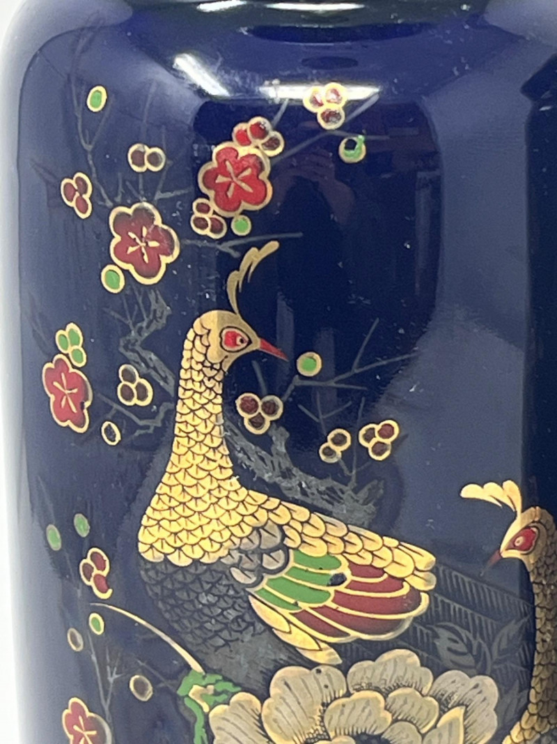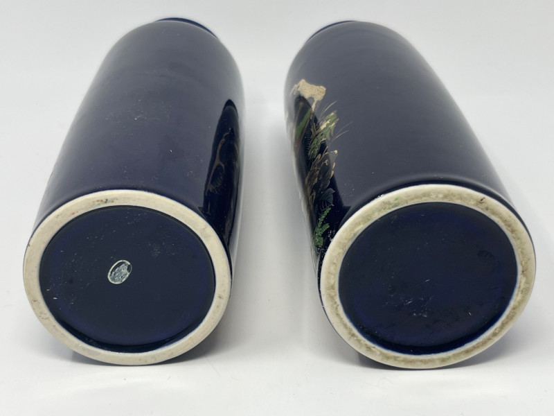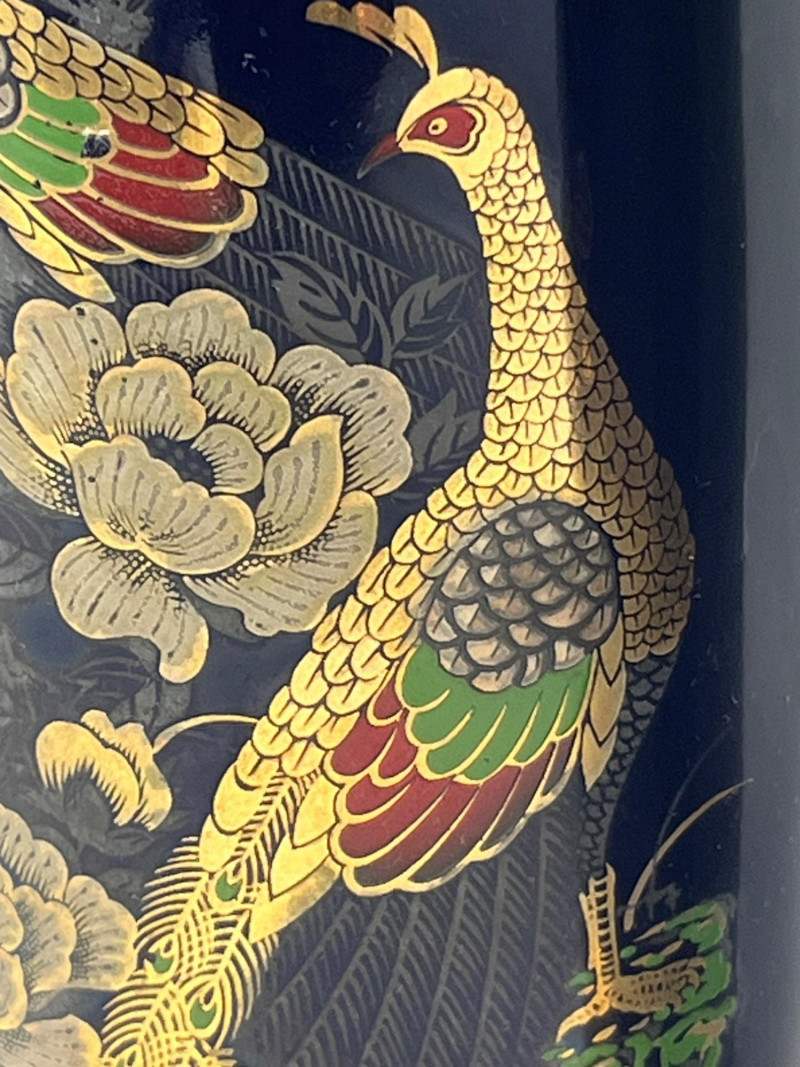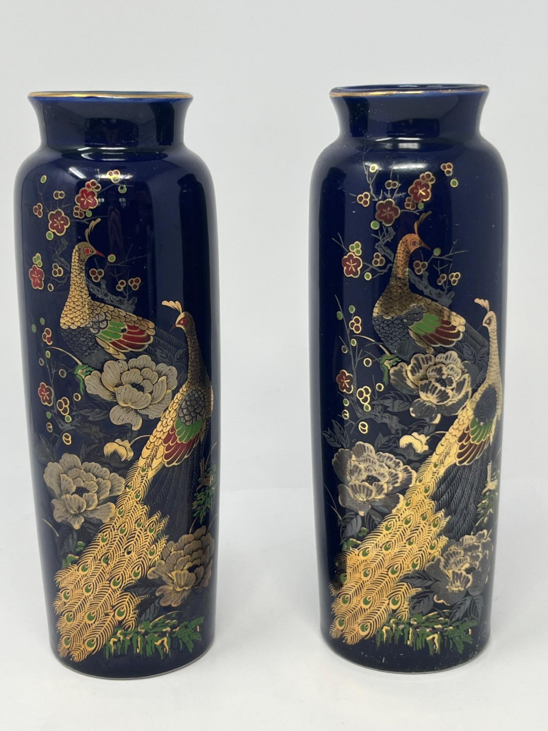 Pair of tall cylindrical ceramic vases featuring a deep blue ground with ornate hand‑applied peacock and floral decoration in gold, red, green, and white. Each vase displays mirrored compositions with detailed plumage and stylized botanical elements. Glossy finish throughout. Bases show unmarked undersides consistent with studio or decorative production. Sourced from a local estate with a collection of global and ornamental ceramics. Condition: