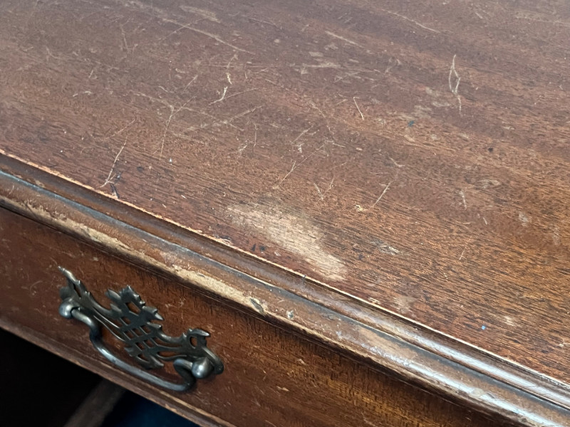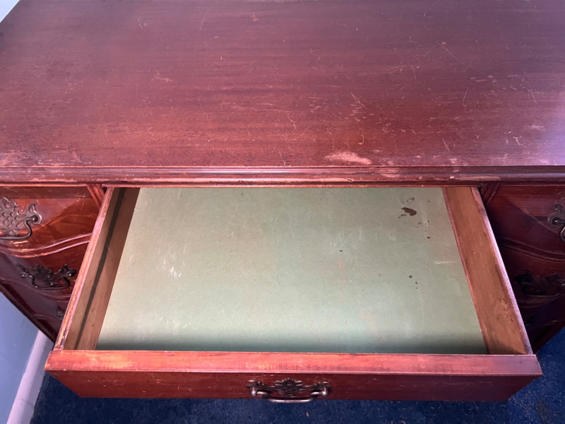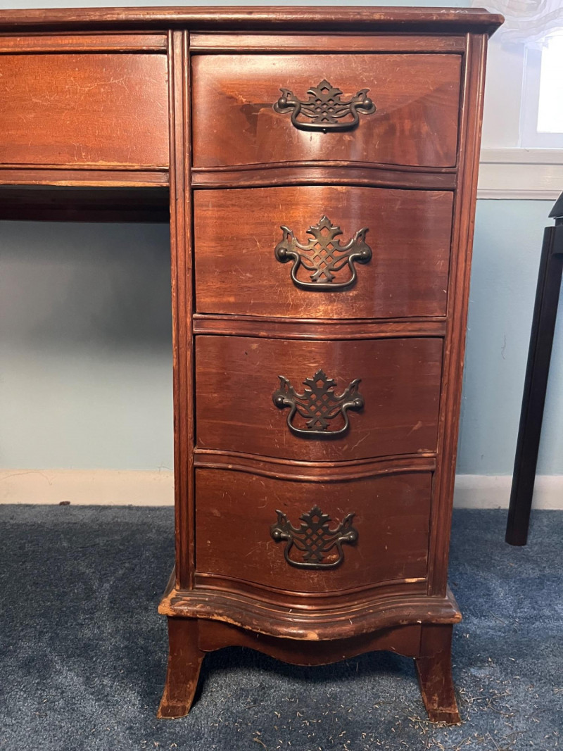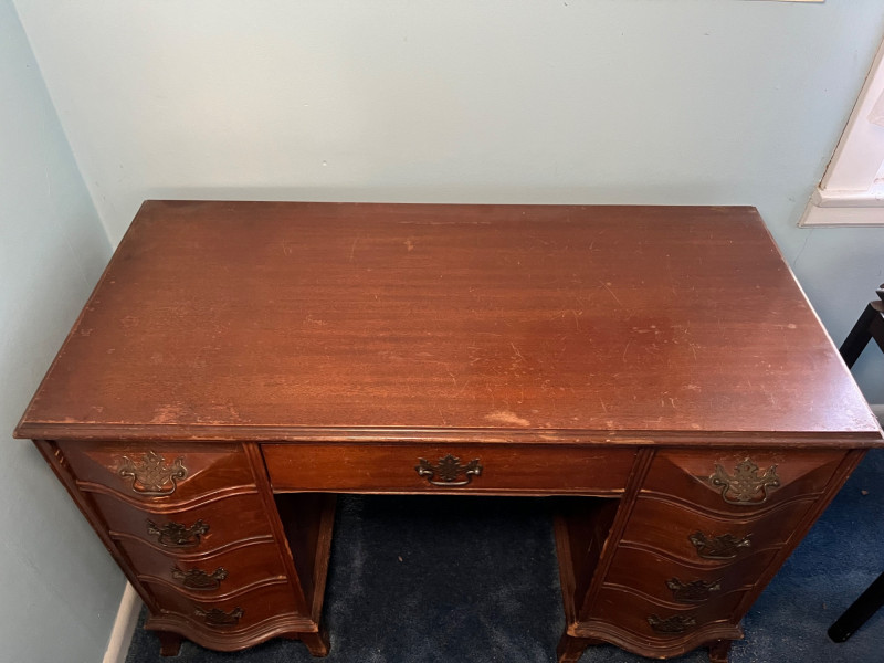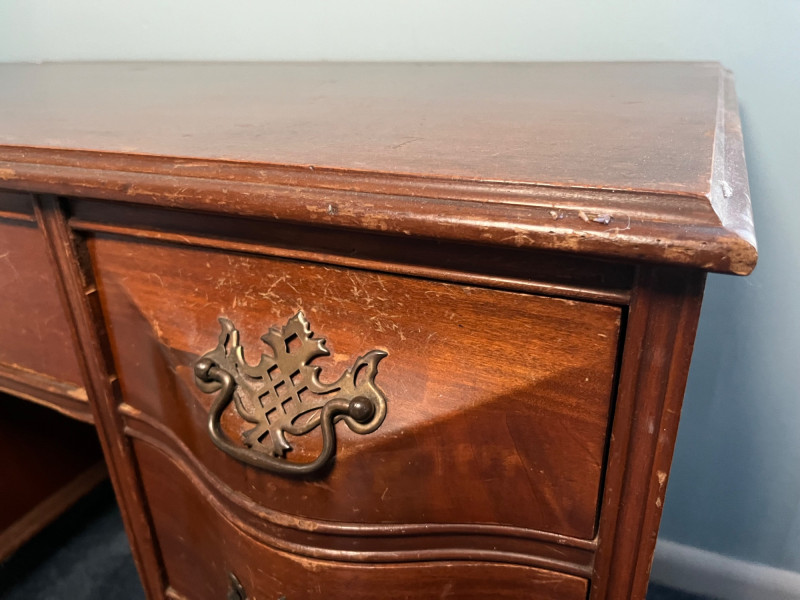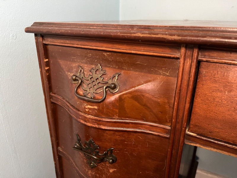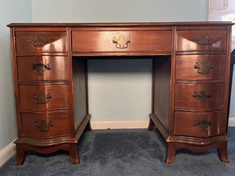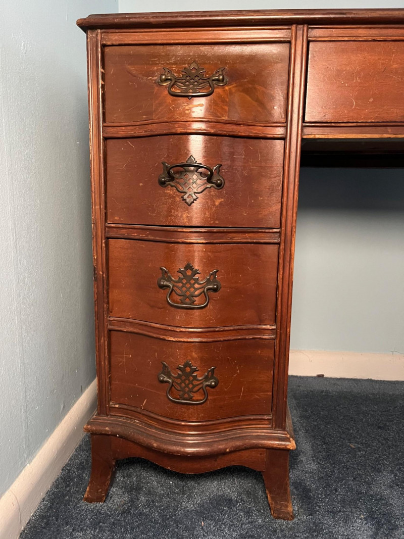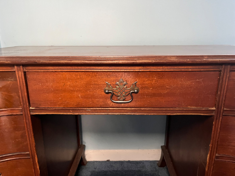 Classic vintage wooden executive desk featuring a warm reddish‑brown finish, dual pedestal drawer configuration, and ornate brass pulls. The desk presents traditional styling with curved legs, decorative drawer fronts, and a spacious work surface. Surface wear, scratches, and finish loss are visible across the top, consistent with age and use. Drawers appear intact with matching hardware and smooth operation based on visual inspection. Side panels and front apron show expected wear for a vintage piece. A substantial, decor‑forward desk suitable for restoration, office staging, or use as a statement workspace.
