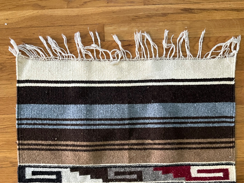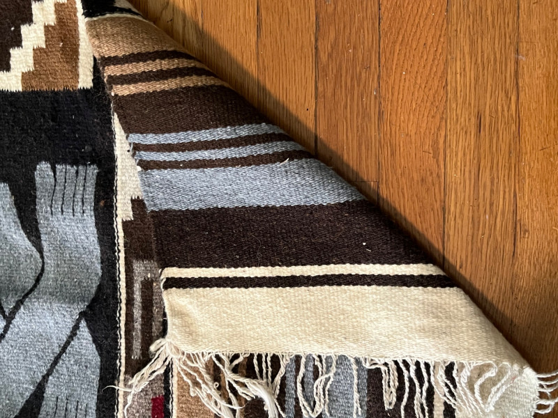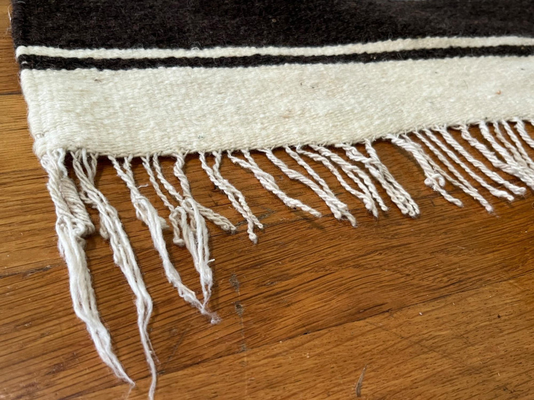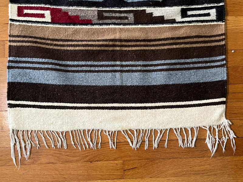 Woven textile featuring a bold central pictorial figure rendered in gray tones, seated cross‑legged and holding an object in one hand. The figure is framed by a strong geometric border in black, white, brown, and red. Upper and lower sections include horizontal bands in earth‑tone stripes with traditional fringe at both ends. The weaving shows intentional patterning, balanced color placement, and clear definition in the central motif. Close‑up images highlight the texture, fiber variation, and handwoven character. Age‑appropriate wear is visible, including minor surface irregularities and areas of loose or uneven fringe. Notes: