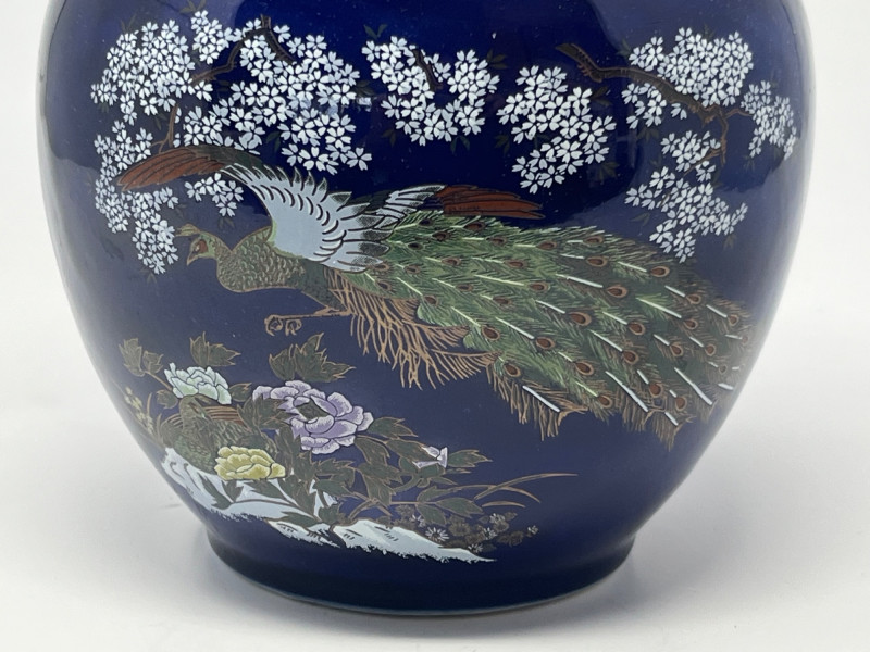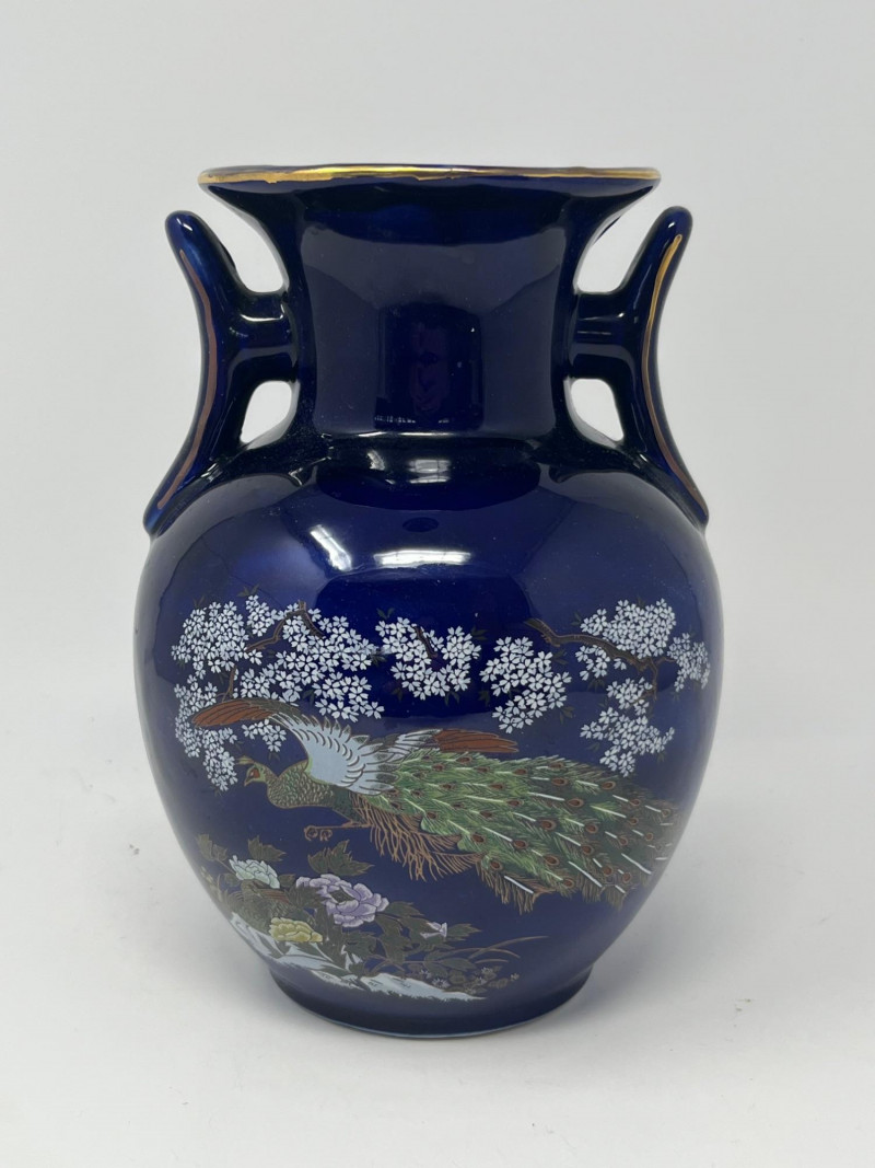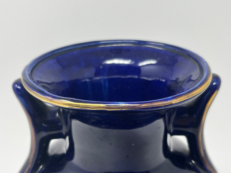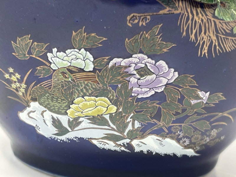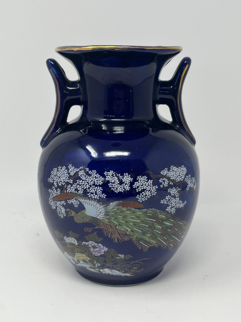 Elegant dark blue ceramic vase featuring detailed hand‑painted decoration in gold, white, green, and purple tones. The design includes perched birds among flowering branches, rendered with fine linework and layered color. Decorative handles frame the upper body, adding sculptural interest and balance to the form. The surface shows a glossy finish that enhances the depth of the painted motifs. Close inspection reveals careful brushwork and intentional detailing throughout the floral and avian elements. The underside displays a clean, unmarked base. A striking decorative piece suitable for display in traditional, eclectic, or collector‑focused interiors. Condition