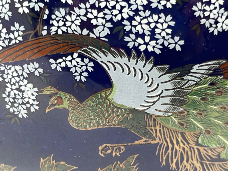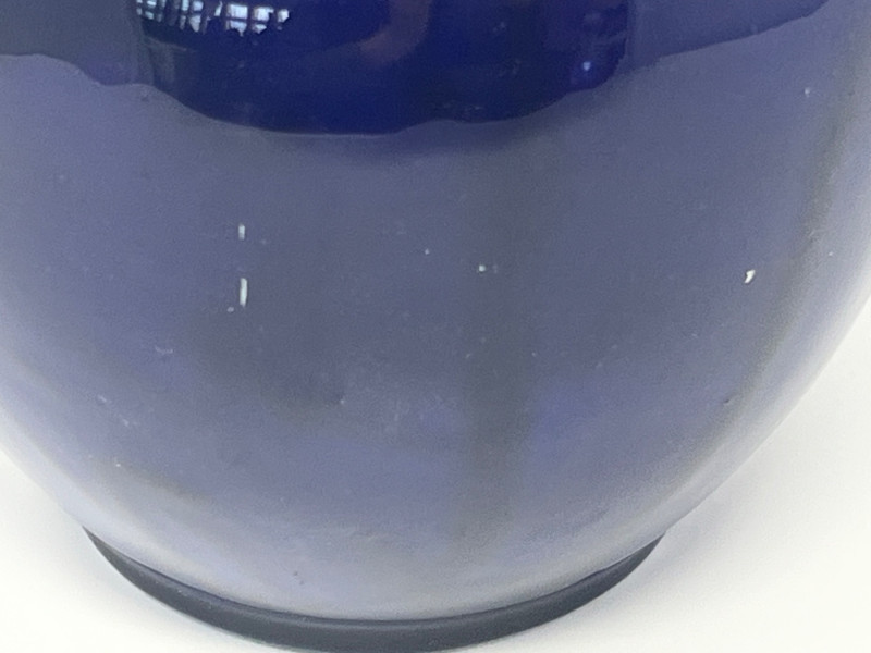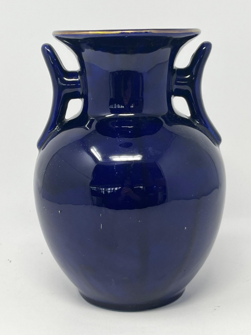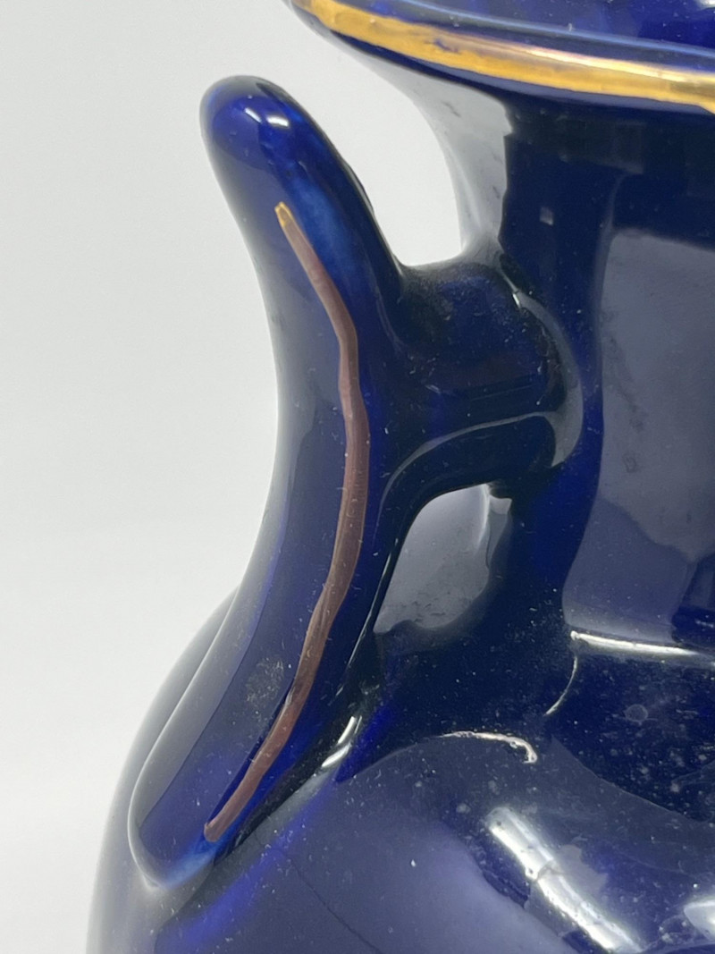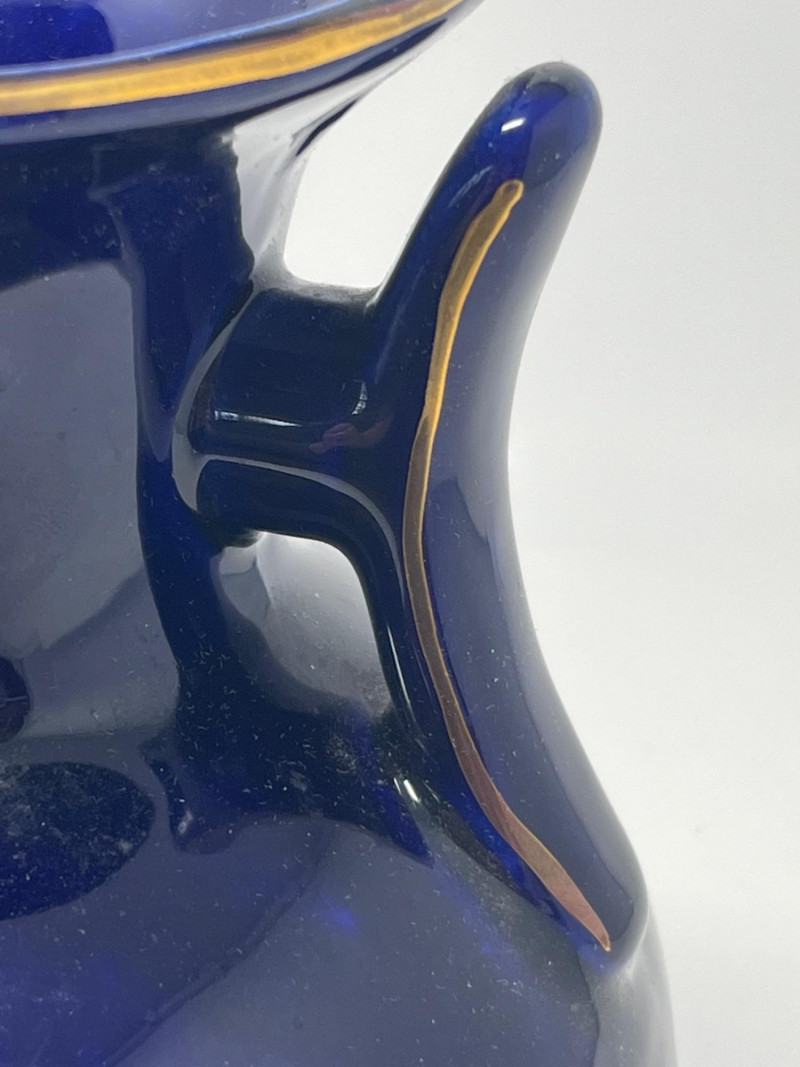 Elegant dark blue ceramic vase featuring detailed hand‑painted decoration in gold, white, green, and purple tones. The design includes perched birds among flowering branches, rendered with fine linework and layered color. Decorative handles frame the upper body, adding sculptural interest and balance to the form. The surface shows a glossy finish that enhances the depth of the painted motifs. Close inspection reveals careful brushwork and intentional detailing throughout the floral and avian elements. The underside displays a clean, unmarked base. A striking decorative piece suitable for display in traditional, eclectic, or collector‑focused interiors. Condition