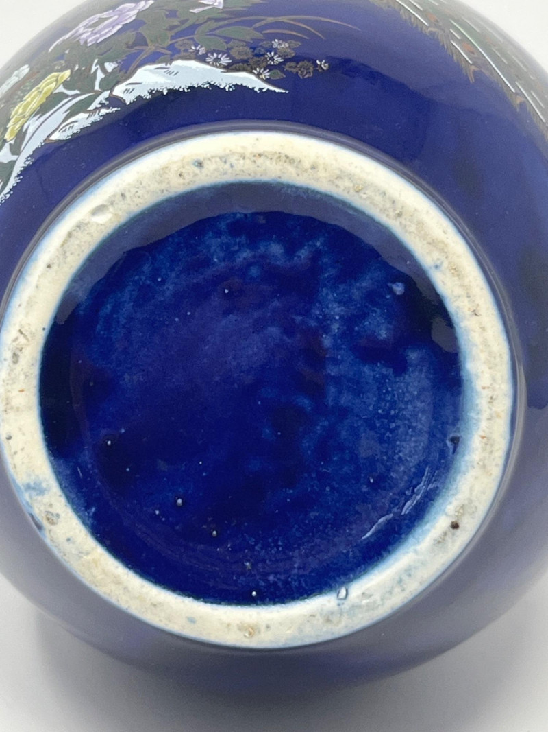 Lot # 110 - Hand‑Painted Blue Ceramic Vase with Birds, Florals, and Gilt Accents
