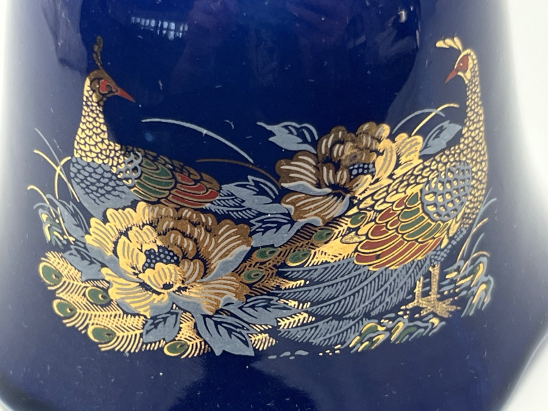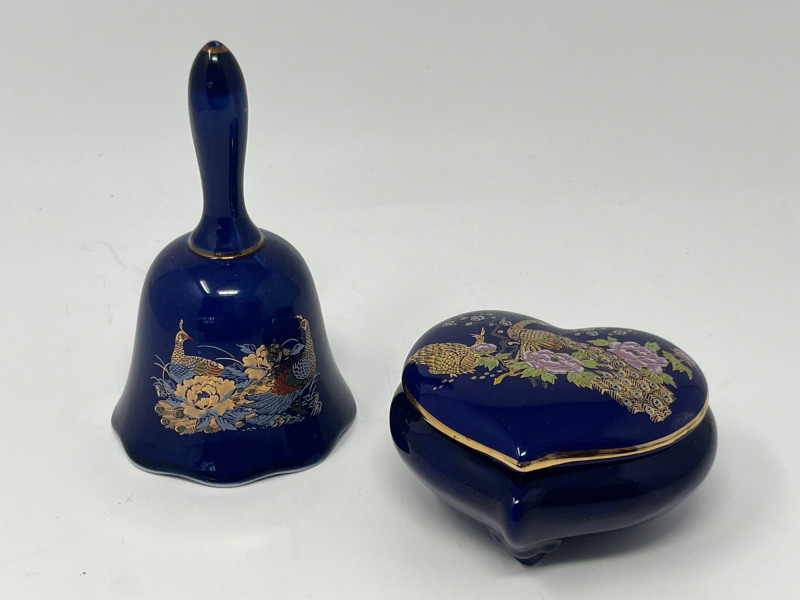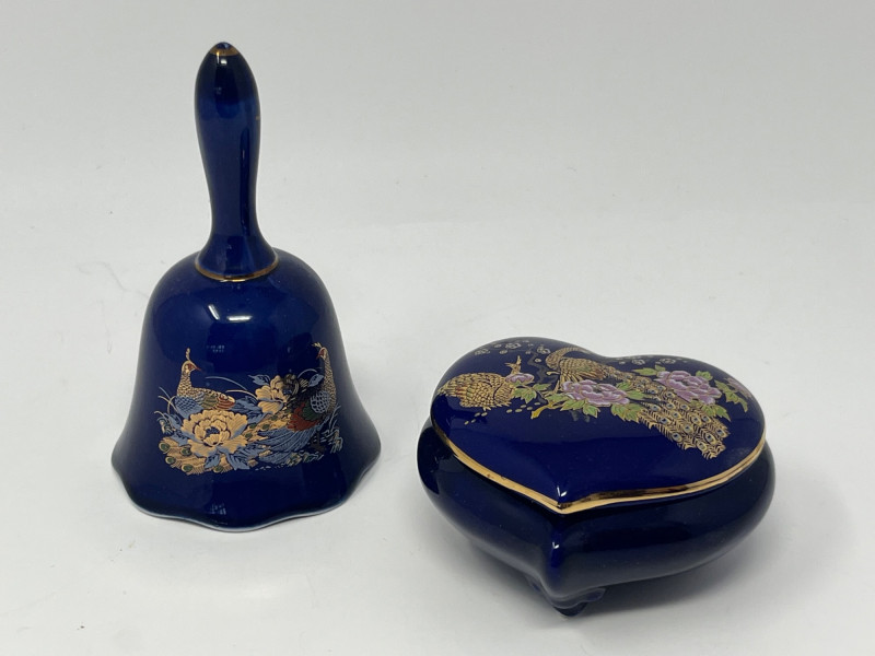 Pair of decorative cobalt blue porcelain pieces featuring intricate gilt and multicolor designs. The lot includes a small bell with a white ceramic clapper and a lidded heart‑shaped trinket box. Both pieces display detailed peacock and chrysanthemum-style decoration with bright gold accents. Underside mark on the box reads Japan, consistent with mid‑ to late‑20th‑century export porcelain. Surfaces show crisp, well-preserved artwork with vibrant color and reflective gilt. No noted chips or cracks. Suitable for collectors of Japanese export porcelain, cobalt decorative ware, or small vanity and display pieces. Includes