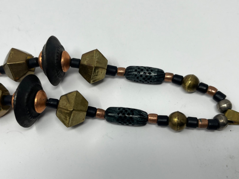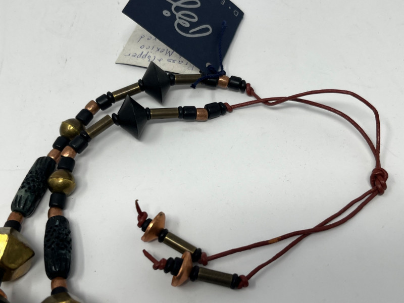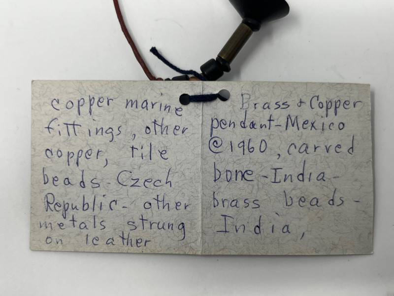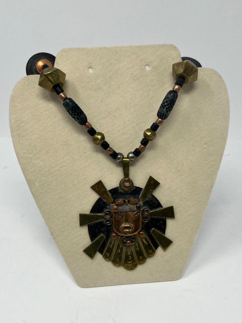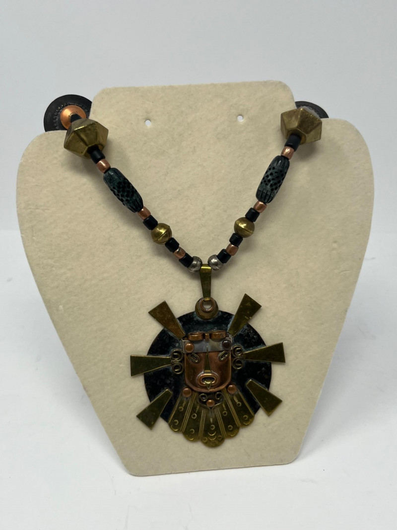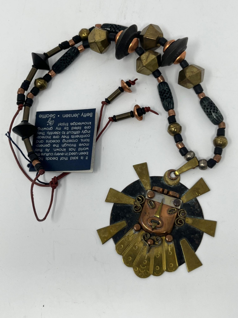 A sculptural mixed‑media necklace blending global materials with the distinctive design sensibility of Seattle artist Betty Jensen. The strand features copper marine fittings, additional copper elements, Czech Republic tile beads, and other metal components, all arranged on leather for a textured, artisan‑made presentation. The necklace is adjustable in length. The focal pendant combines brass and copper from Mexico with carved bone and brass beads from India, forming a bold mid‑century statement element with a stylized face motif and radiating geometric details. Materials & Notes