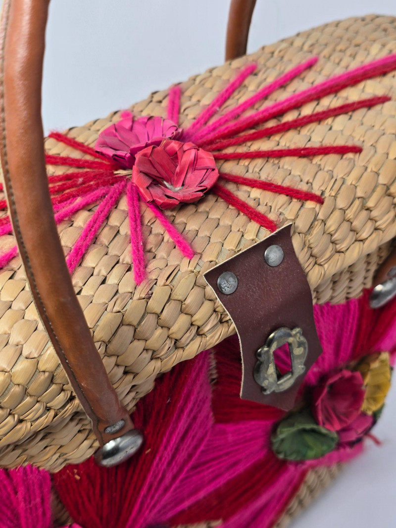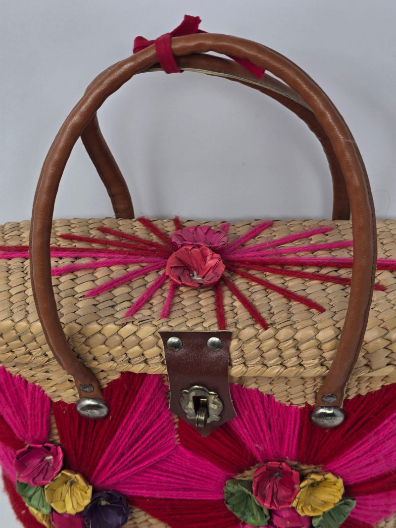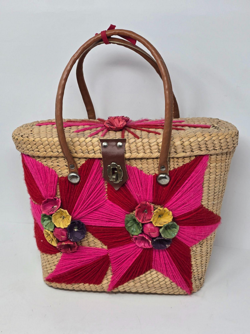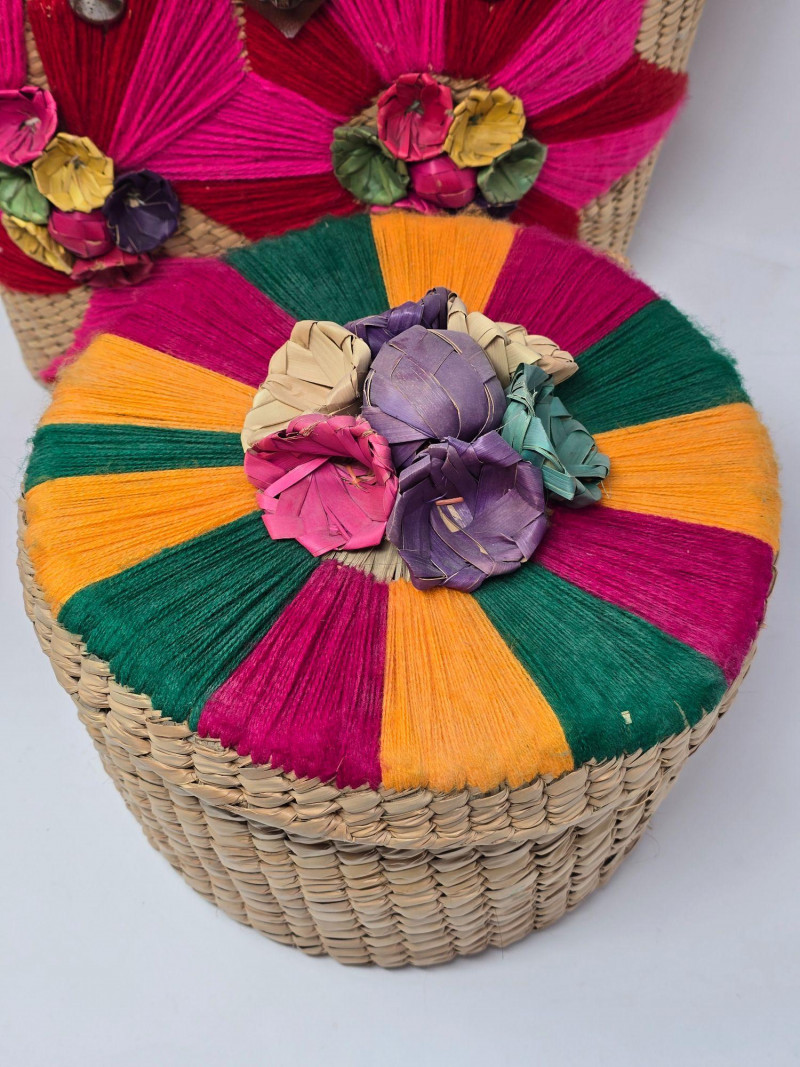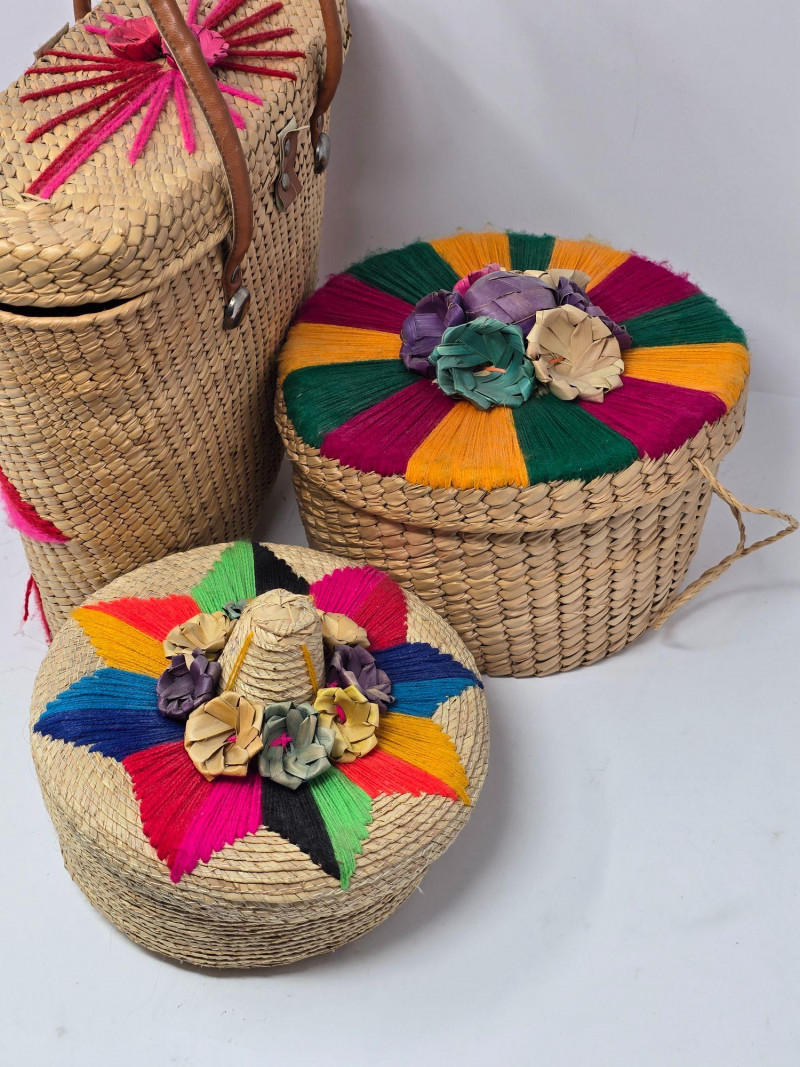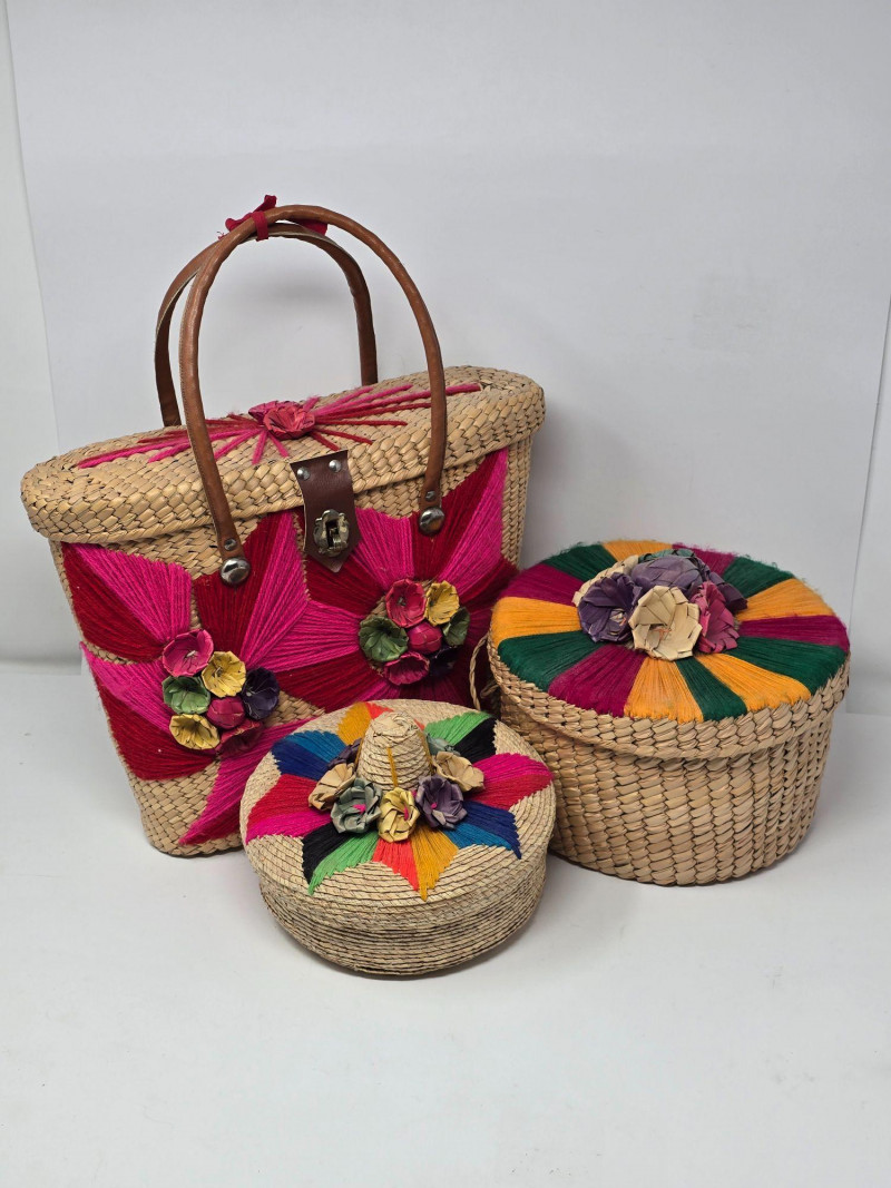 Charming lot of vintage Mexican folk craft, featuring a woven handbag with latch‑top closure and two round baskets. Each piece is constructed in traditional woven fiber and decorated with colorful yarn accents and folded paper flowers, a hallmark of mid‑century regional artisan work. The handbag presents a tall, structured form with an arched handle, while the two baskets offer classic round silhouettes with matching mixed‑media embellishment. The set reflects the vibrant palette, hand‑assembled detailing, and folk‑art character valued by collectors of Mexican craft traditions. Condition consistent with age and use. Please review all photos for the most accurate representation. Notes