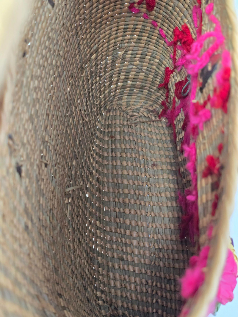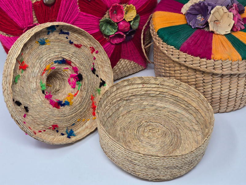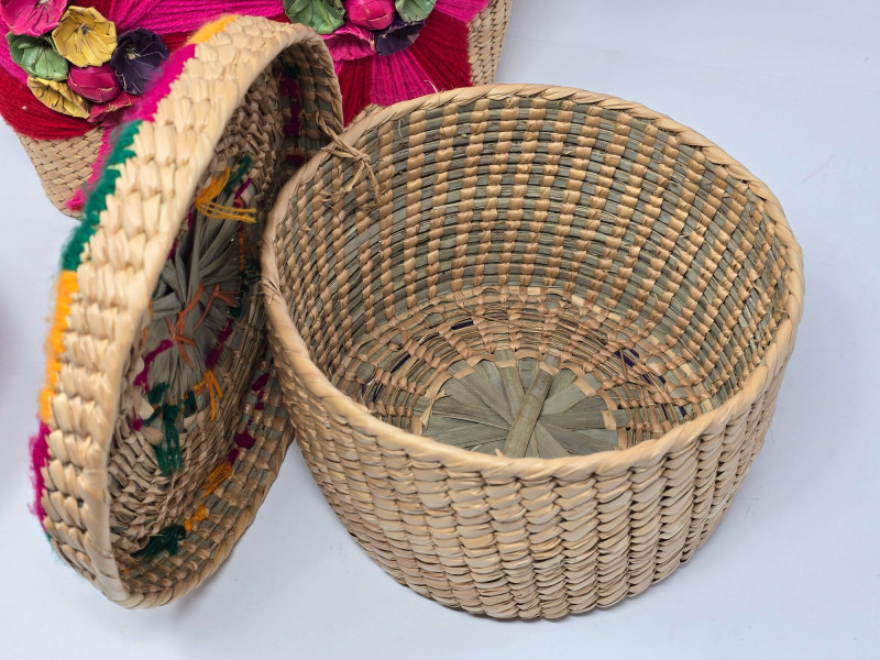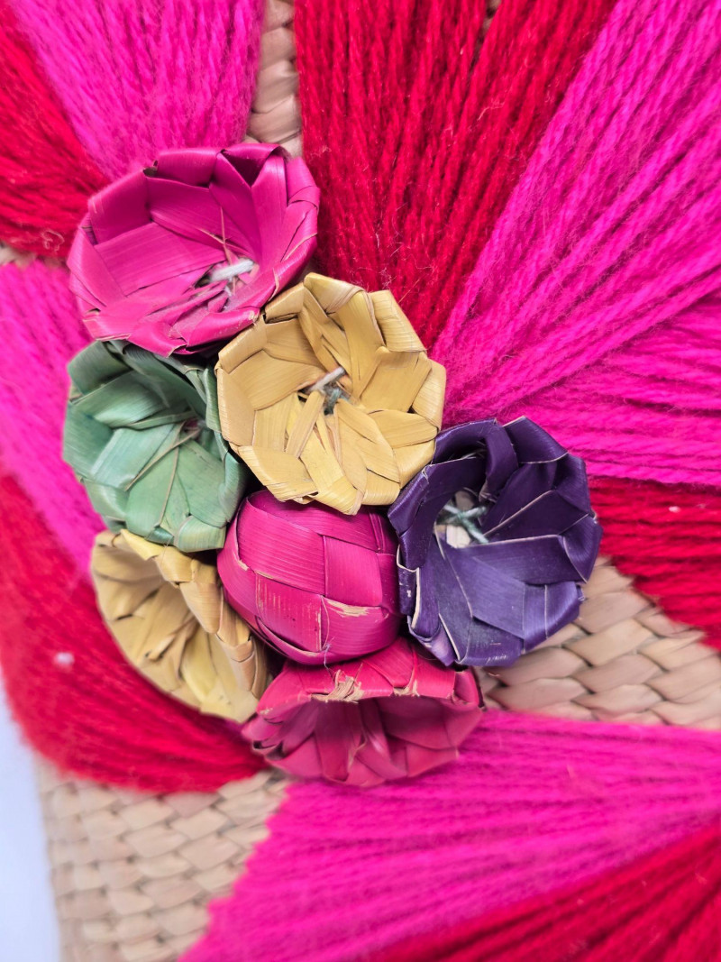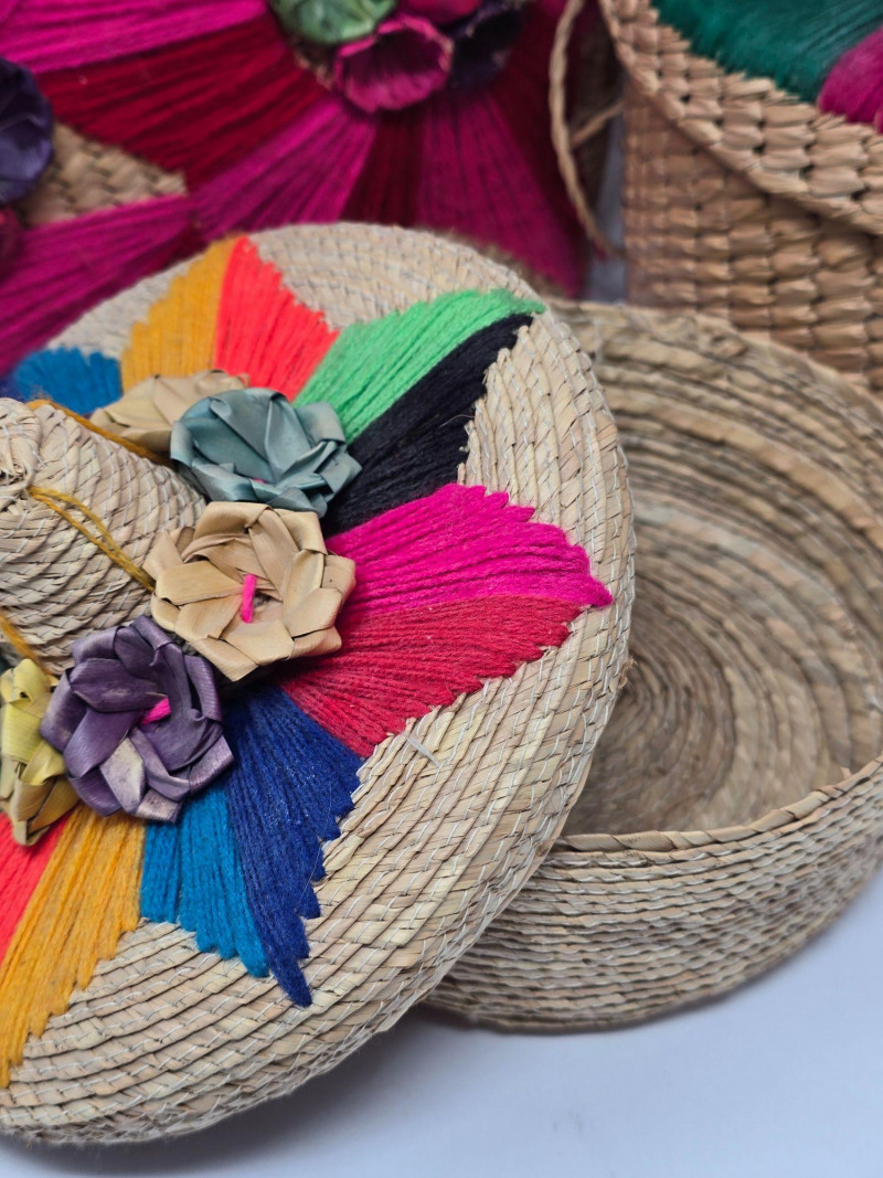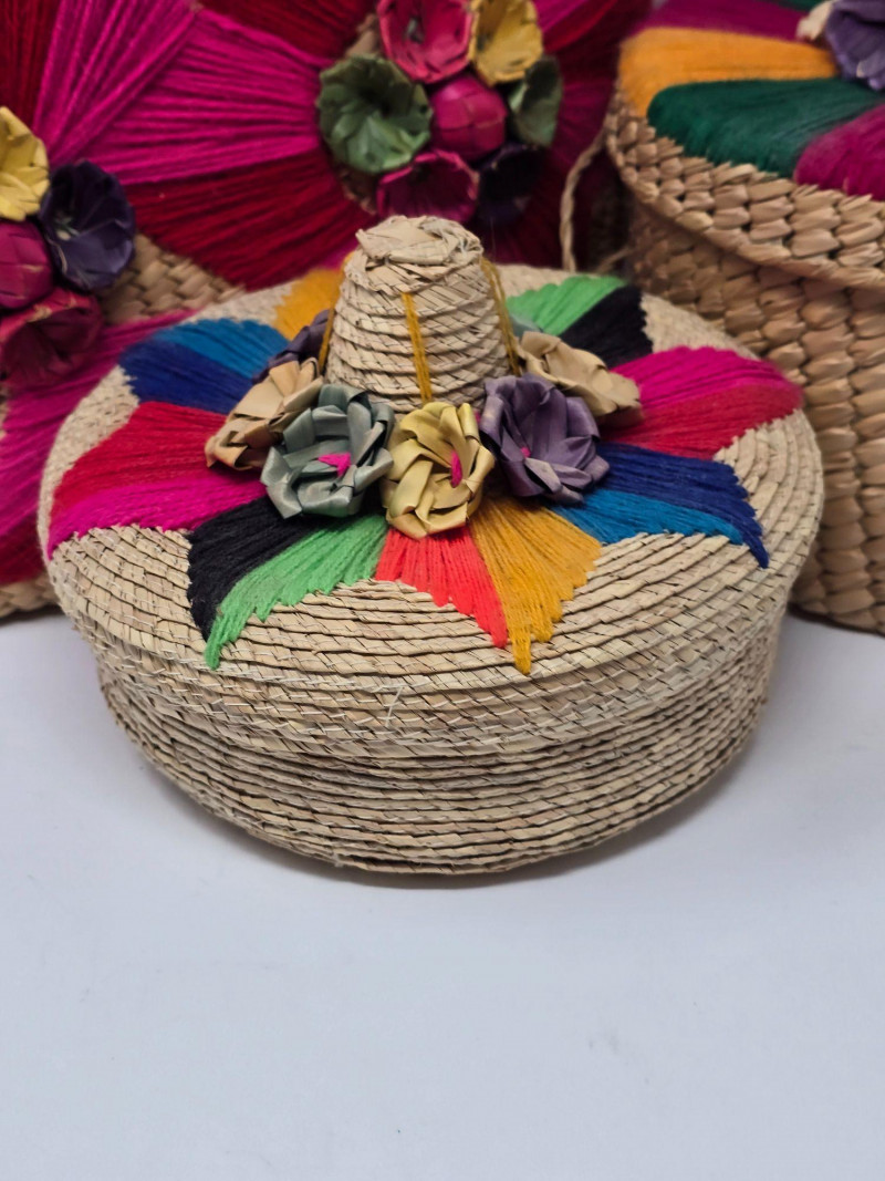 Charming lot of vintage Mexican folk craft, featuring a woven handbag with latch‑top closure and two round baskets. Each piece is constructed in traditional woven fiber and decorated with colorful yarn accents and folded paper flowers, a hallmark of mid‑century regional artisan work. The handbag presents a tall, structured form with an arched handle, while the two baskets offer classic round silhouettes with matching mixed‑media embellishment. The set reflects the vibrant palette, hand‑assembled detailing, and folk‑art character valued by collectors of Mexican craft traditions. Condition consistent with age and use. Please review all photos for the most accurate representation. Notes