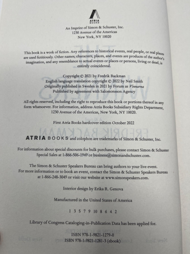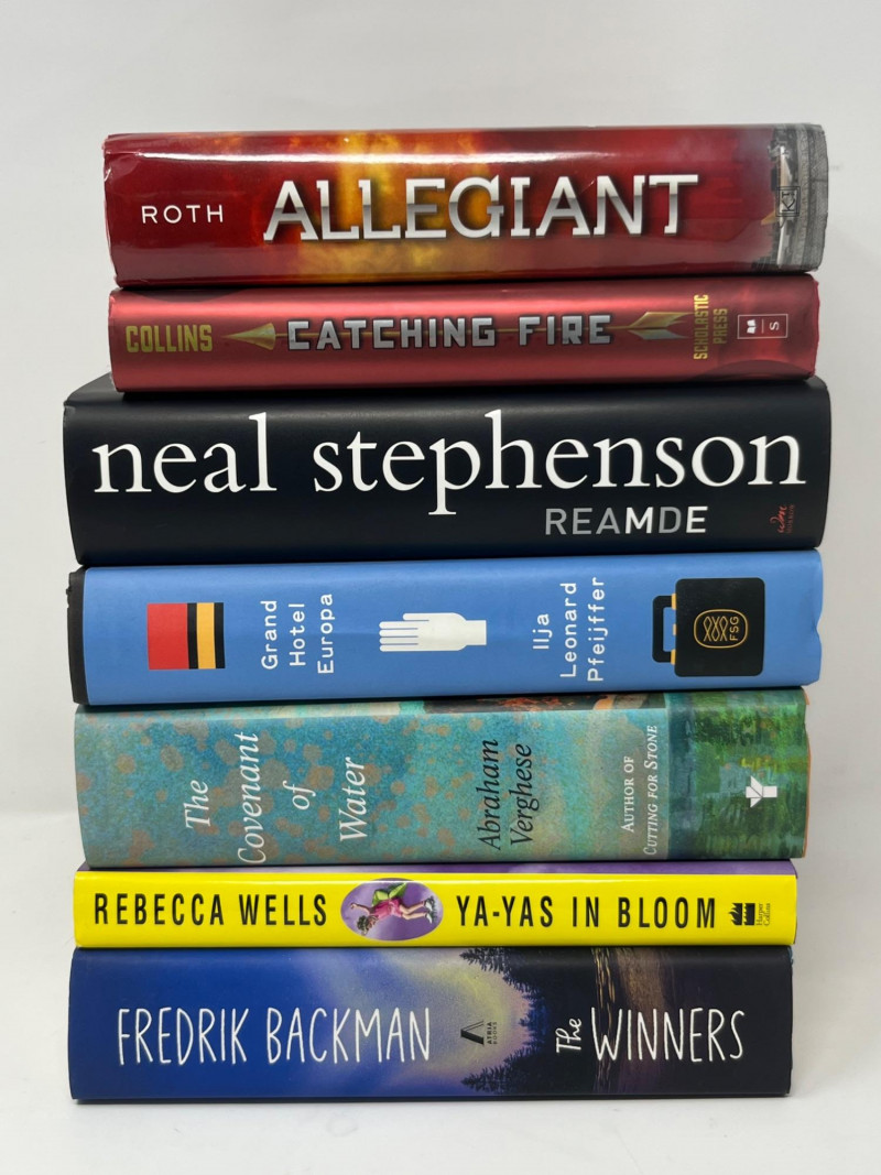 A curated selection of seven first edition hardcover novels by bestselling and internationally recognized authors. Each volume includes an intact copyright page confirming first edition status. Light handling and shelf wear consistent with personal library use. Included Titles: Allegiant by Veronica Roth — First Edition, Katherine Tegen Books (2013) Catching Fire by Suzanne Collins — First Edition, Scholastic Press (2009) Reamde by Neal Stephenson — First Edition, William Morrow (2011) Ya‑Yas in Bloom by Rebecca Wells — First Edition, HarperCollins (2005) Grand Hotel Europa by Ilja Leonard Pfeijffer, translated by Michele Hutchison — First U.S. Edition, 2022 The Covenant of Water by Abraham Verghese — First Edition, Grove Press (2023) The Winners by Fredrik Backman, translated by Neil Smith — First U.S. Edition, Atria Books (2022) Notes: