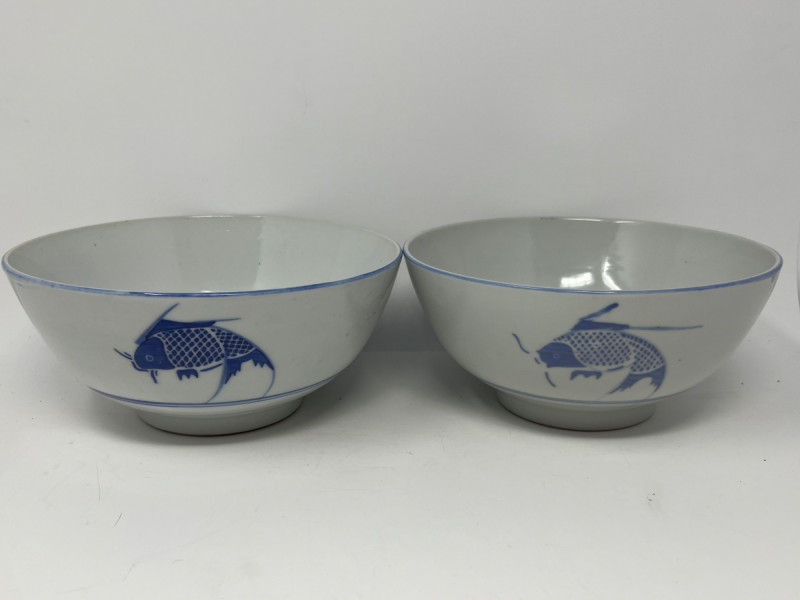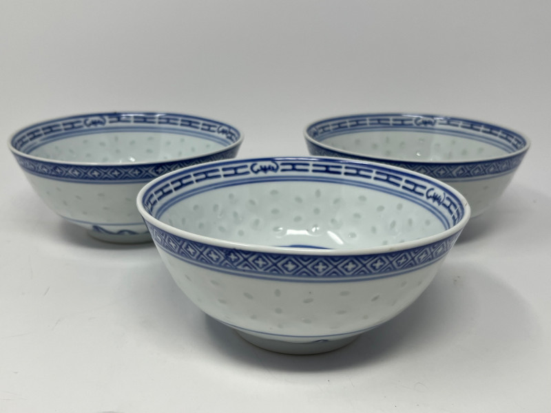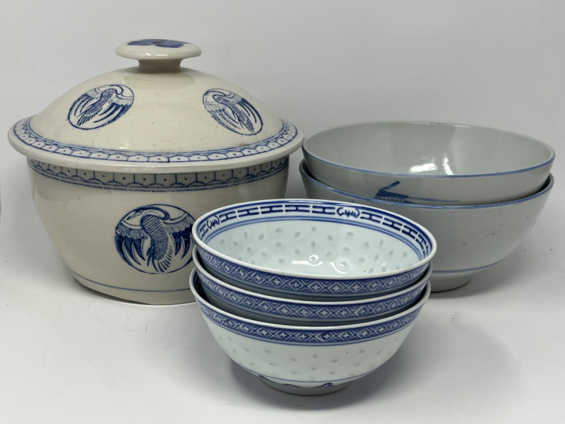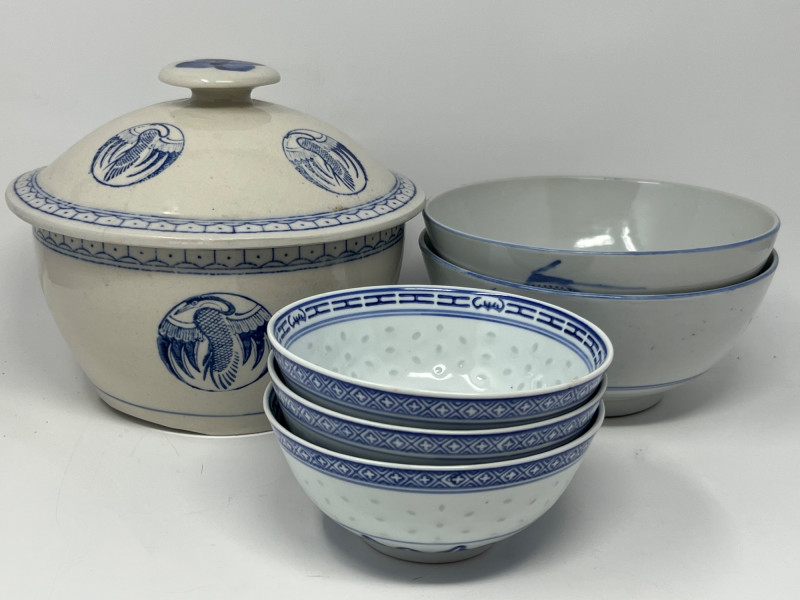 Lot # 133 - Traditional Blue and White Chinese Porcelain Bowls and Covered Vessel