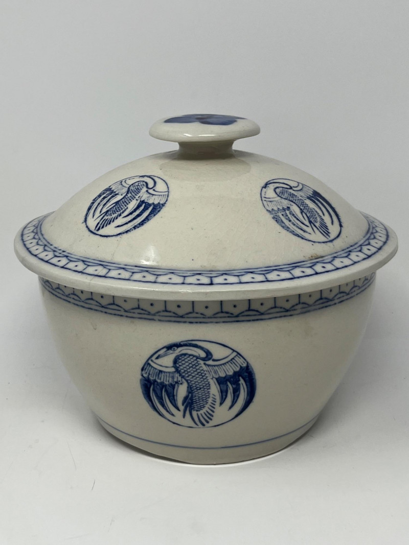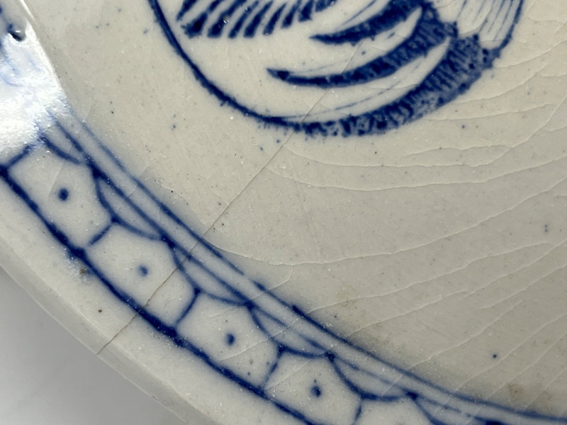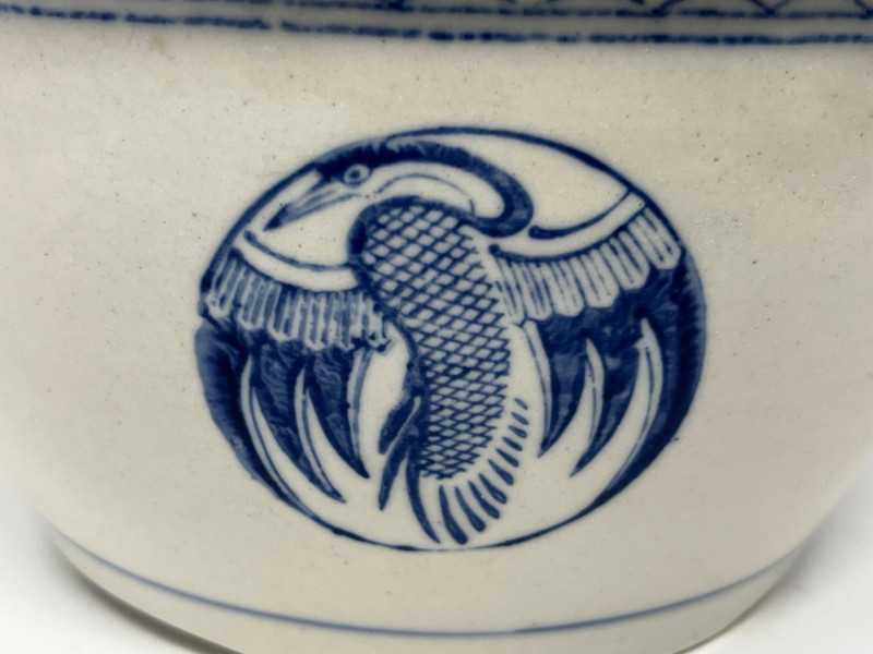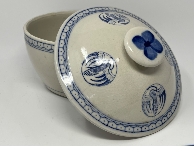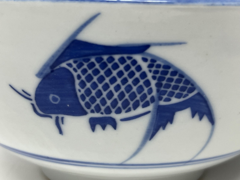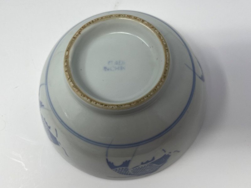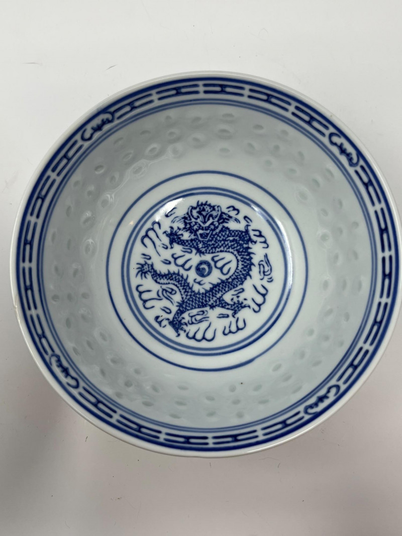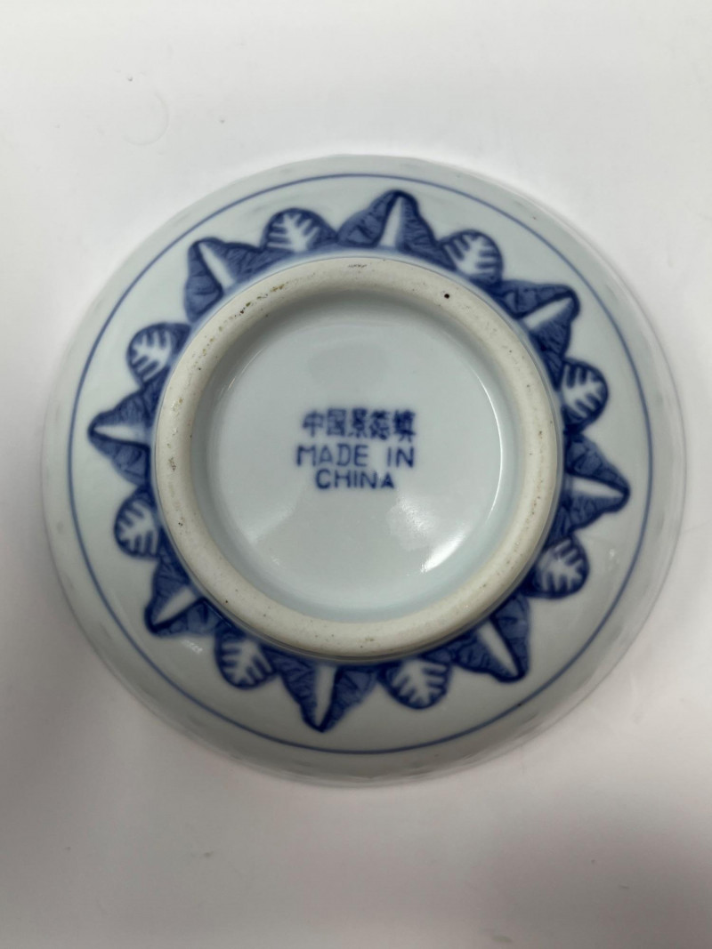 Grouping of traditional blue and white Chinese porcelain, consisting of three small bowls, two larger bowls, and one lidded container. The larger bowls measure approximately 9 x 2.5 inches and 8 x 3.5 inches, and the lidded container is approximately 8 x 8.5 inches. Each piece features hand‑painted cobalt decoration with stylized birds, geometric borders, and floral or abstract motifs. Brushwork shows natural variation consistent with hand‑applied designs. Bases include printed and stamped marks, including “Made in China” and Chinese characters. This coordinated lot presents well for display, collection, or decorative use in traditional, global, or eclectic interiors. Condition