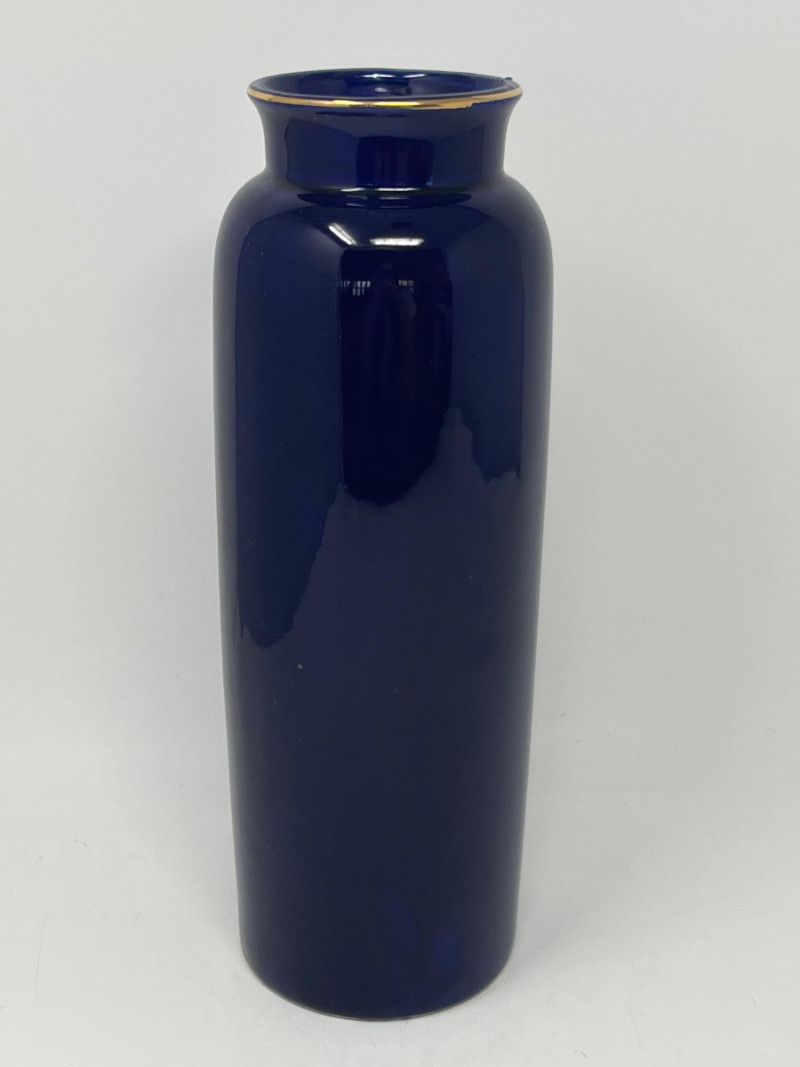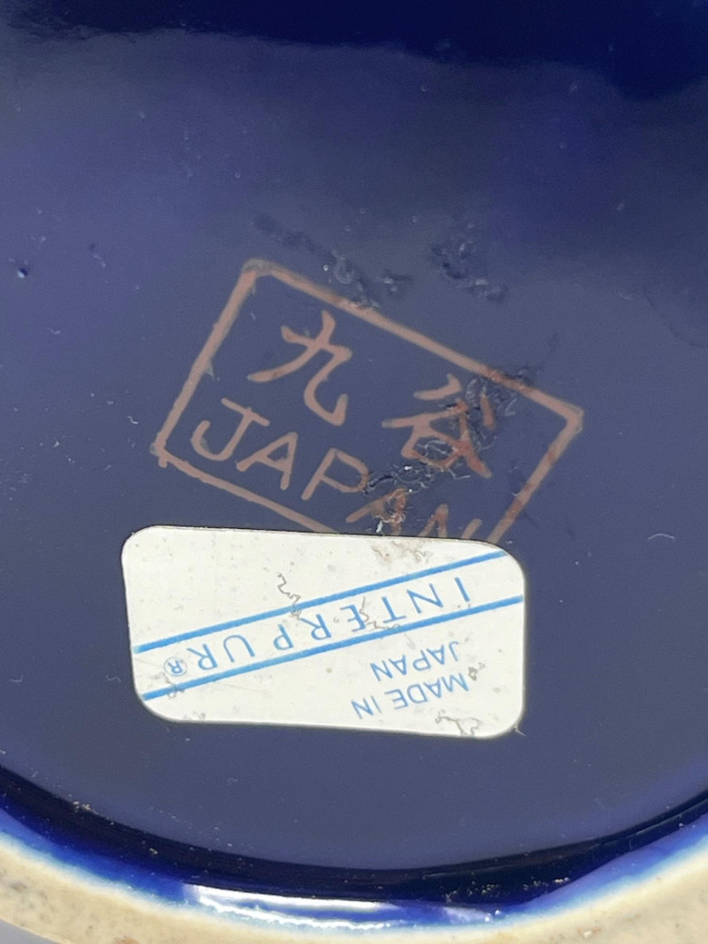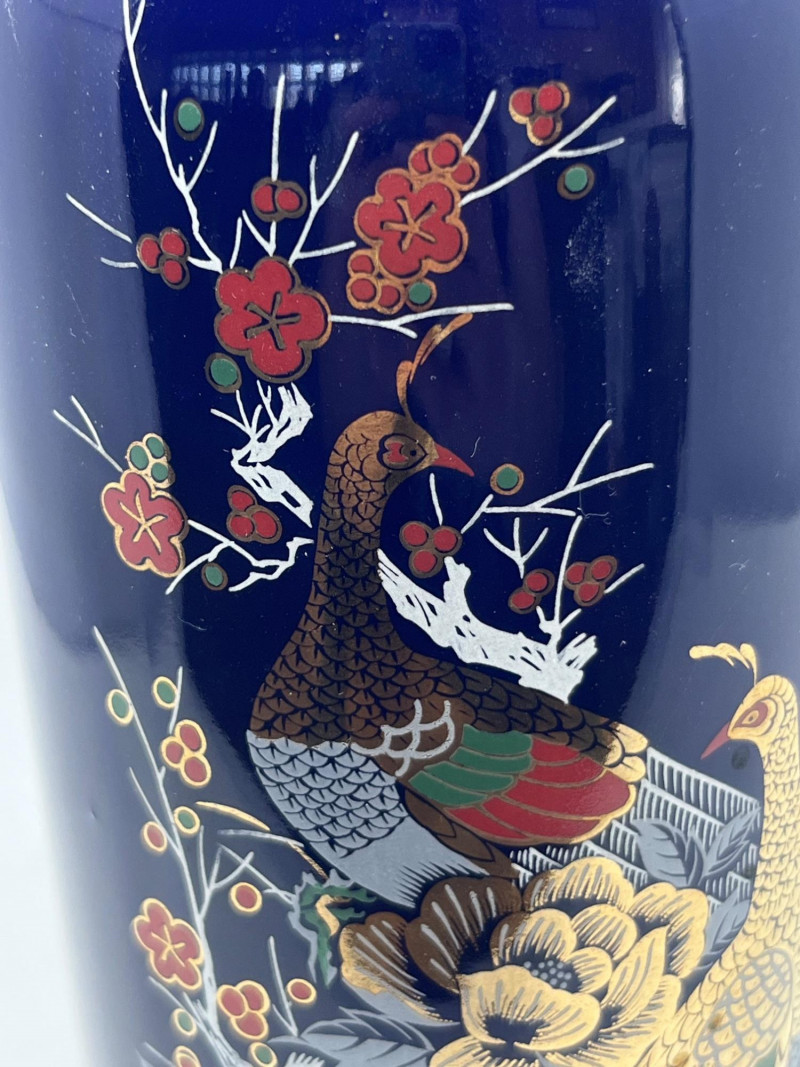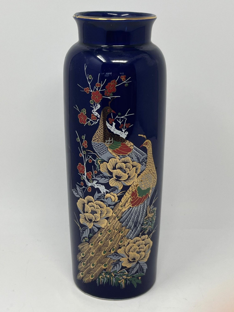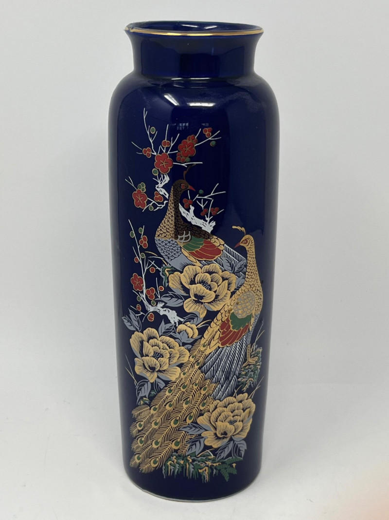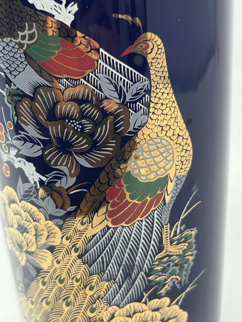 One hand‑painted Japanese cobalt blue vase with peacock and floral motif.