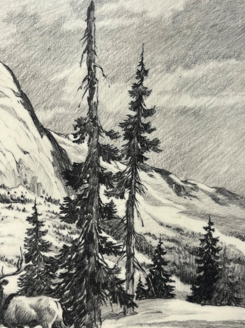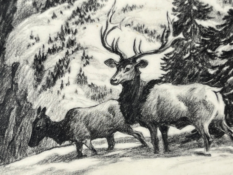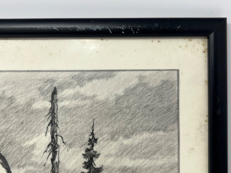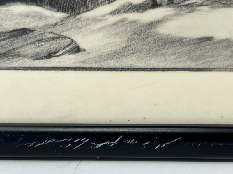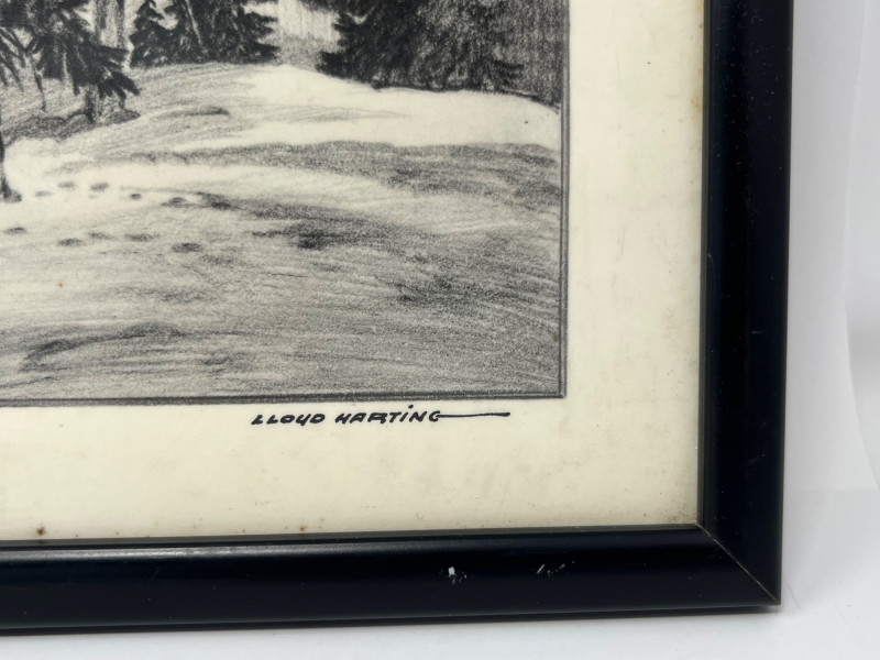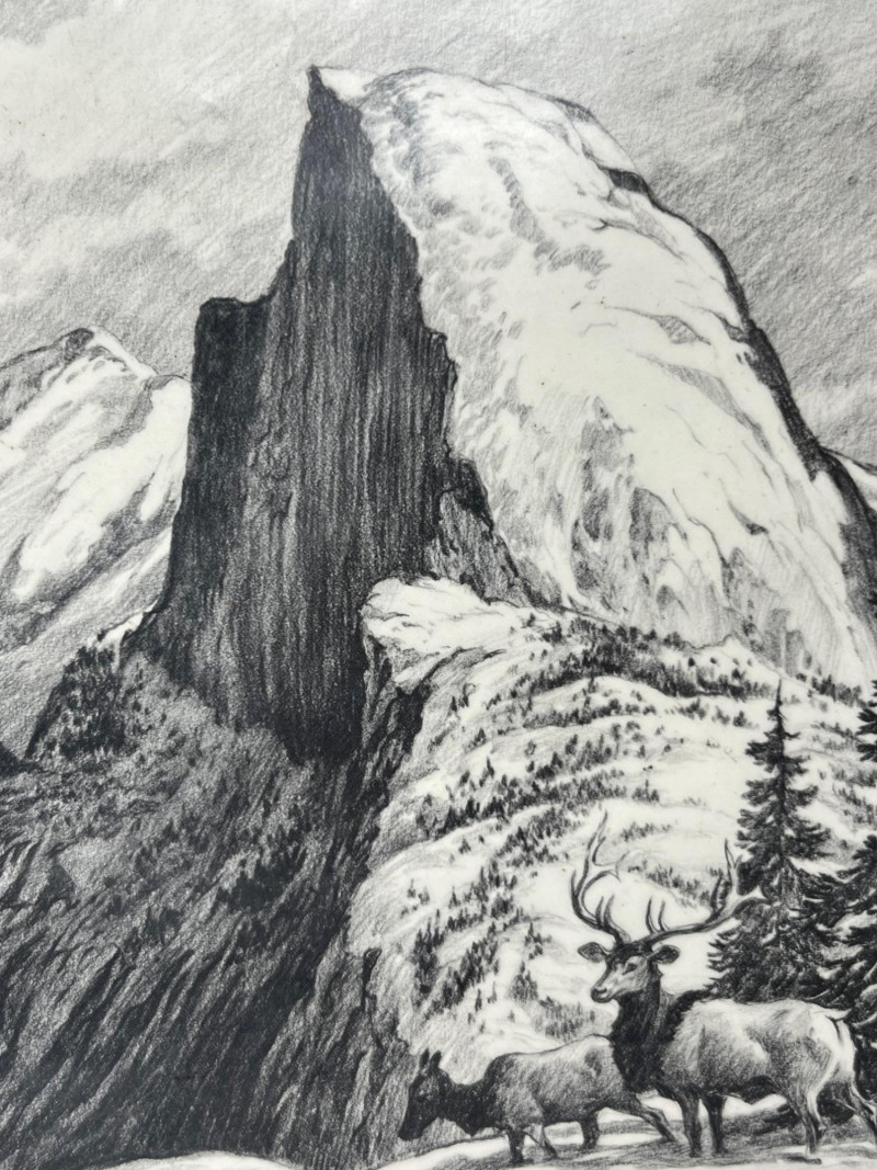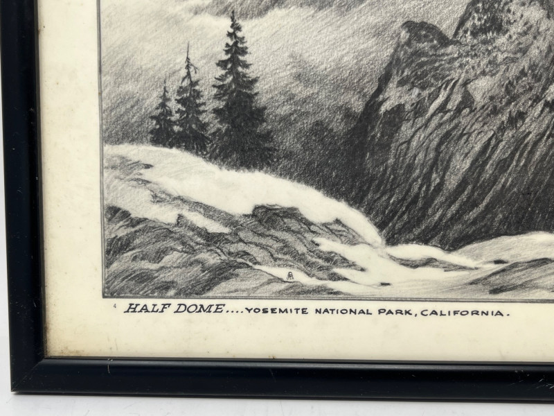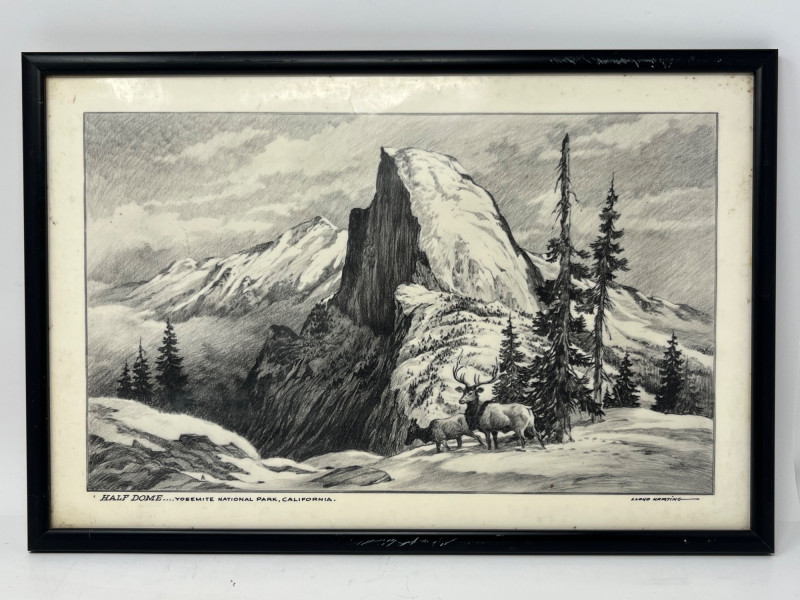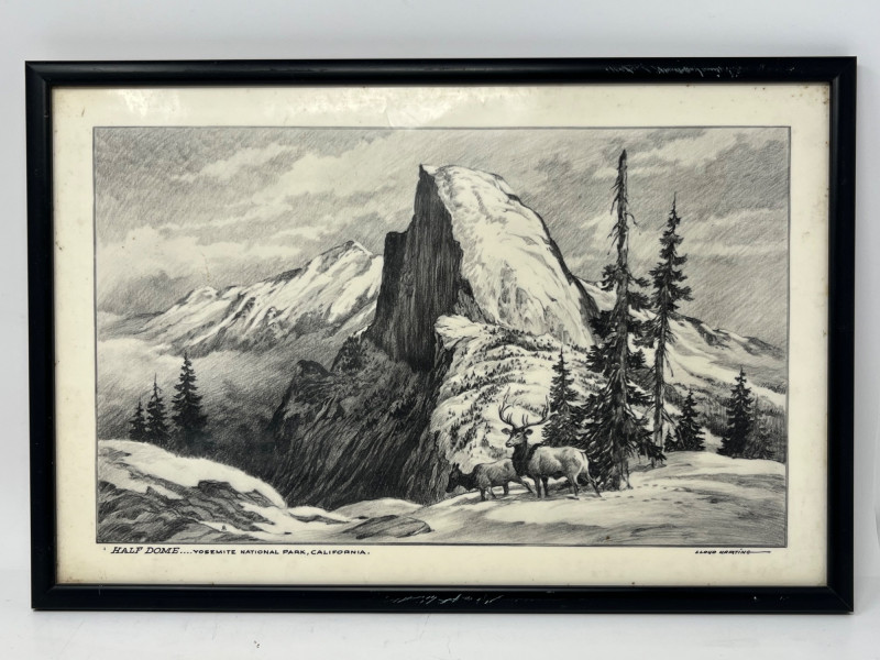 Striking black‑and‑white landscape print by Lloyd Harting, featuring Yosemite’s iconic Half Dome with two deer positioned in the foreground. The scene includes detailed evergreens, snow‑covered terrain, and strong tonal shading characteristic of Harting’s illustrative style. The work is titled “Half Dome — Yosemite National Park, California” and marked “Camp Curry,” referencing the historic Yosemite lodging area known for its early 20th‑century artistic and travel ephemera. Presented in a wood‑tone frame with a neutral mat that complements the rustic, nature‑focused subject matter. The artwork appears well‑preserved with no visible discoloration. Frame shows light, expected wear consistent with age. A classic piece for lodge décor, National Park collectors, or those drawn to traditional wildlife and landscape imagery.