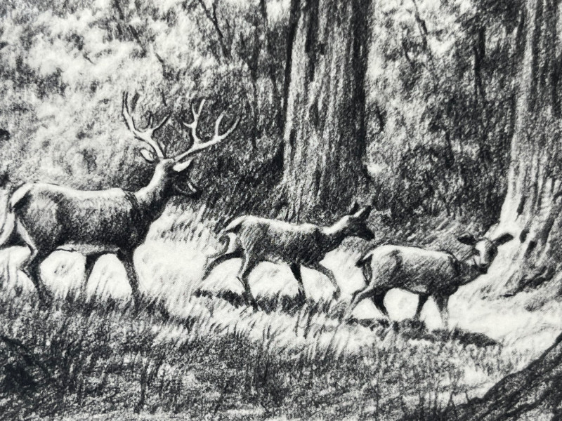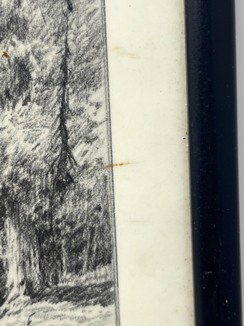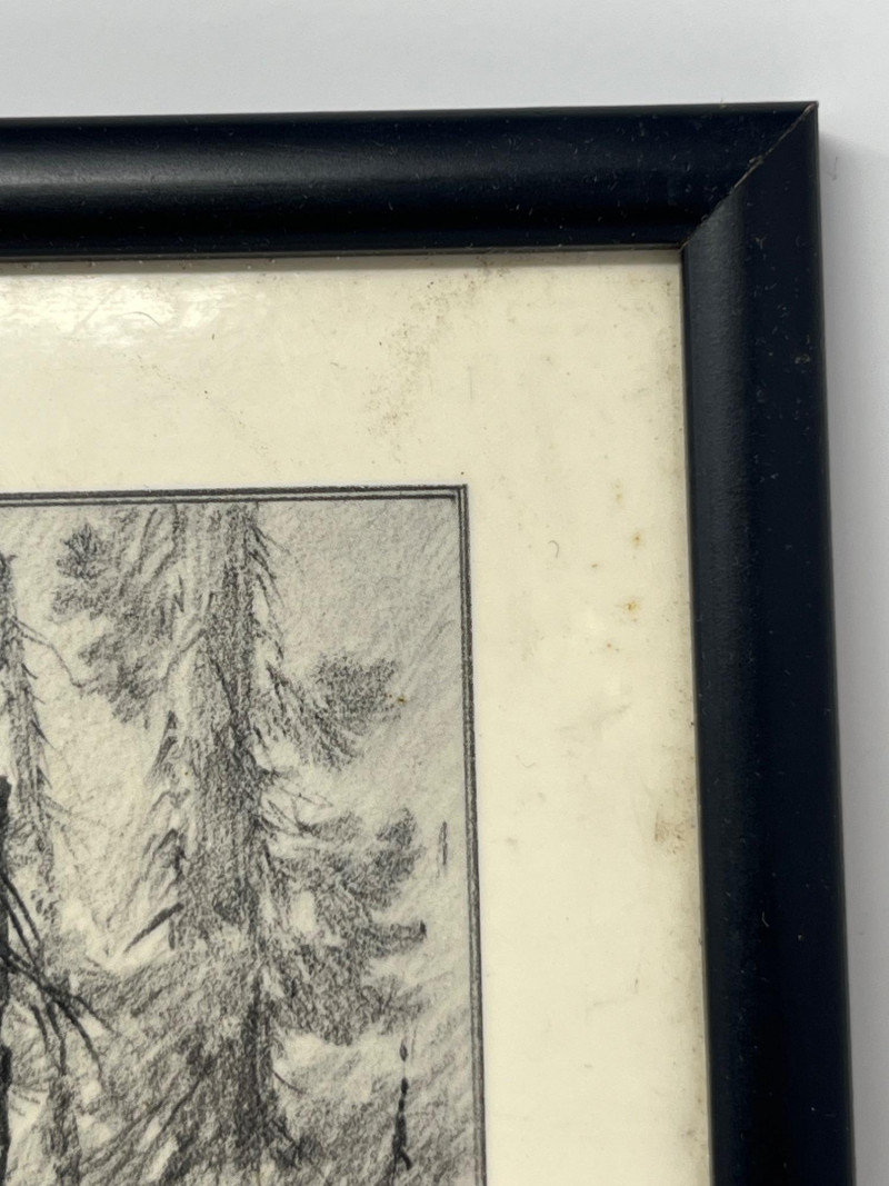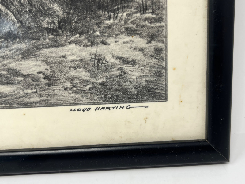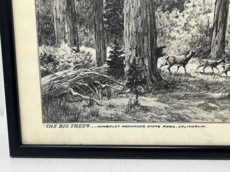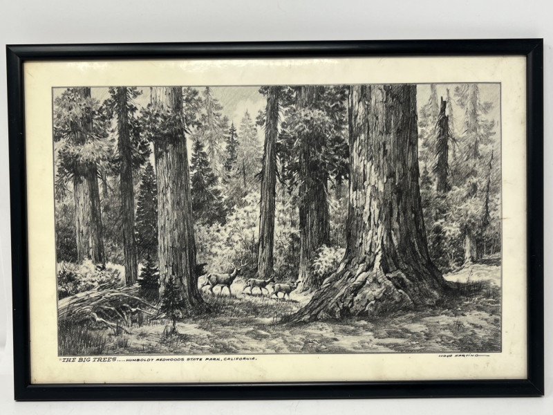 Framed black‑and‑white print by Lloyd Harting depicting the iconic redwoods of Mariposa Grove in Yosemite National Park. The composition features detailed tree forms, forest undergrowth, and a small group of deer integrated into the scene. Strong line work and tonal shading highlight Harting’s illustrative style and the depth of the landscape. The print is presented in a simple black frame with glazing. Backing and hardware appear intact. Artwork and frame show light, expected wear consistent with age and display. A classic Yosemite subject rendered by a noted mid‑century illustrator, suitable for rustic, lodge, cabin, or nature‑themed interiors.
