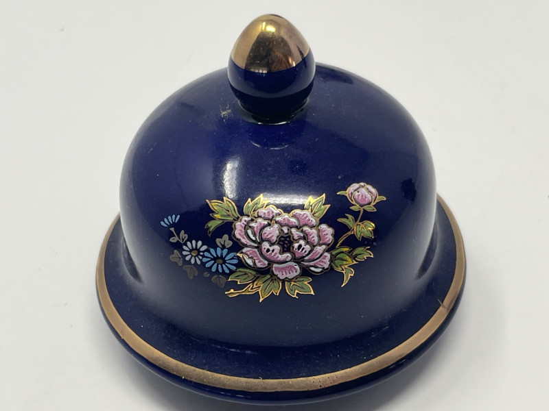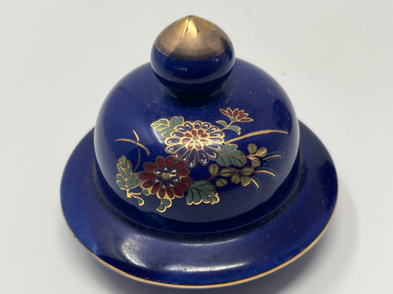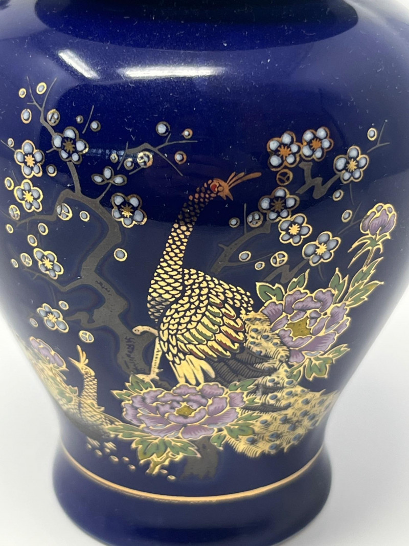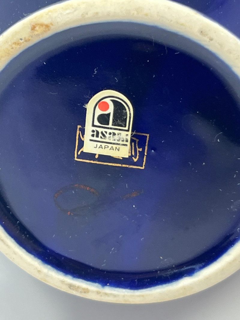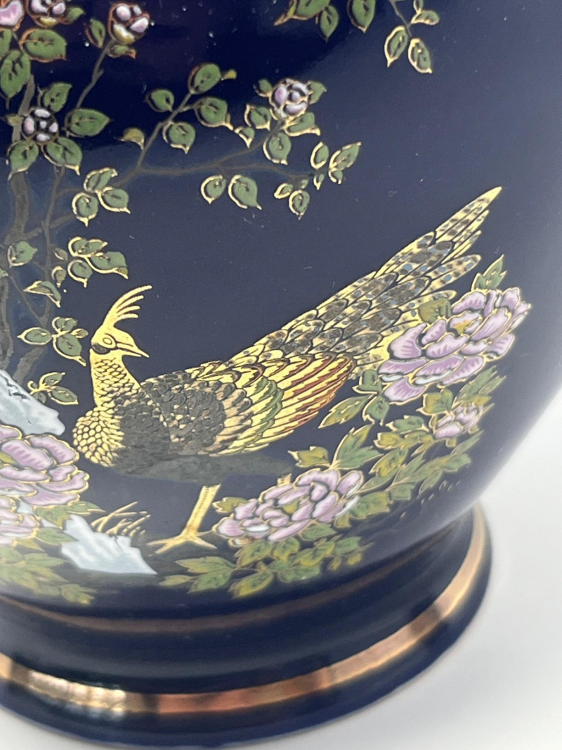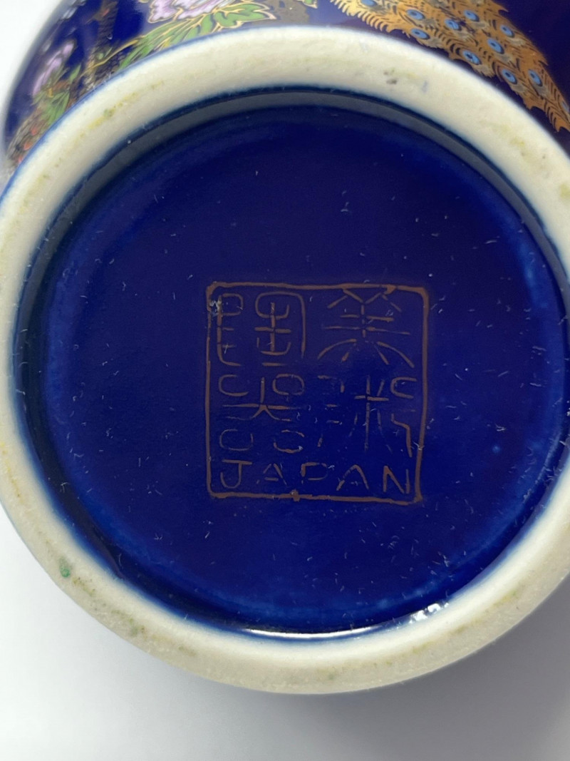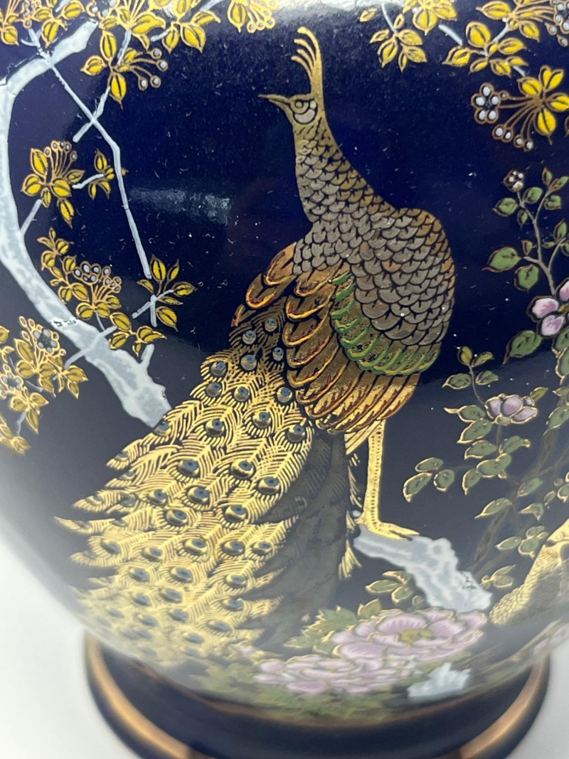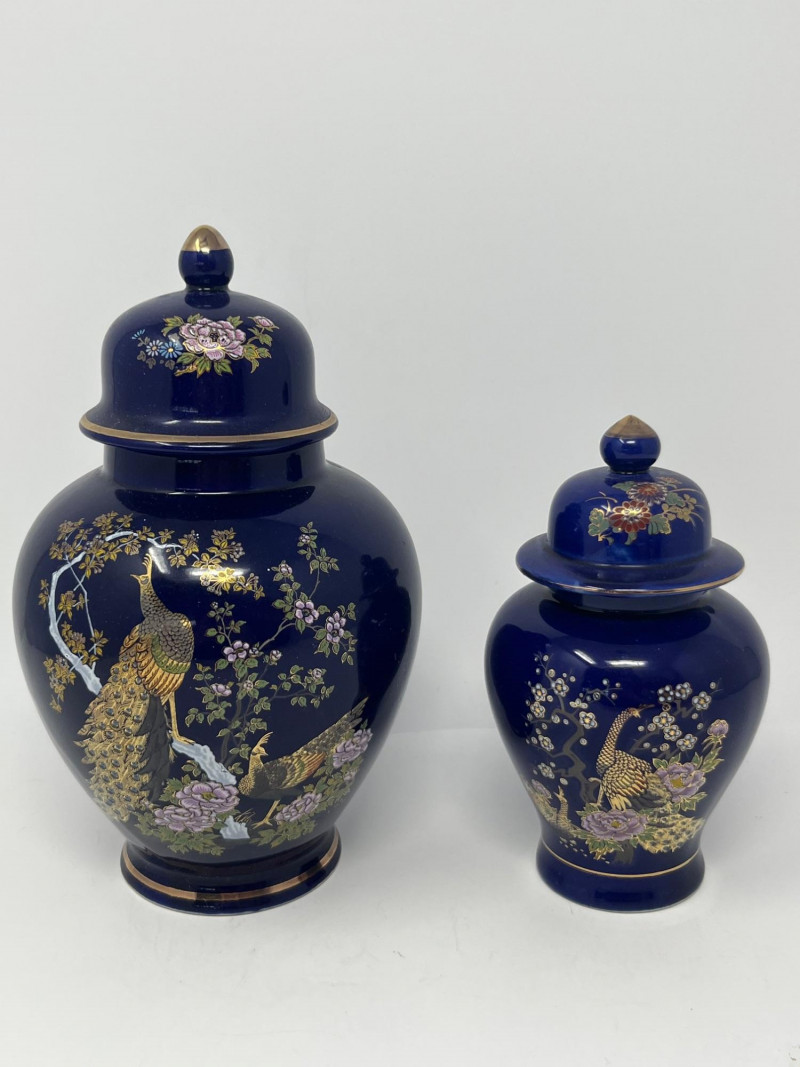 Pair of Japanese porcelain lidded jars featuring a deep cobalt blue ground with gilt and multicolor enamel decoration. Each jar displays a finely rendered peacock among flowering branches, with raised enamel accents and crisp linework. Lids are decorated to match and finished with gold‑tipped finials. The larger jar retains its original Asahi Japan foil sticker on the underside. Both pieces also bear Japanese export marks, including a stamped mark and an applied “Japan” label, consistent with mid‑20th‑century production for the export market. Surfaces present well with vibrant color, detailed imagery, and strong decorative appeal. A refined decorative pair suitable for collectors of Japanese export porcelain, peacock motifs, or gilt enamelware.