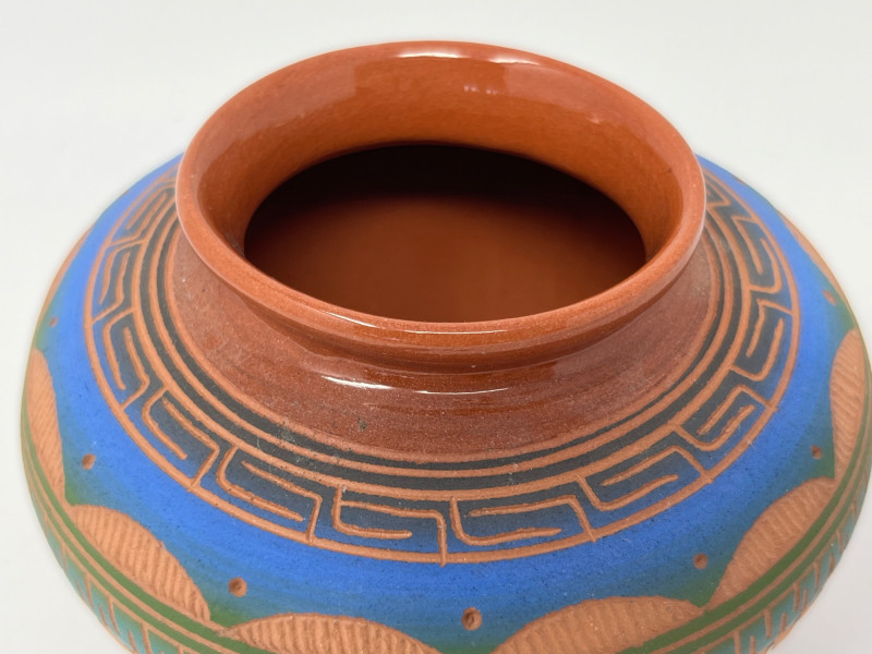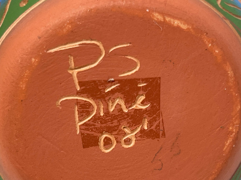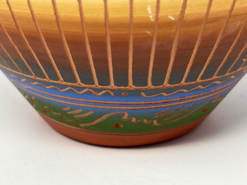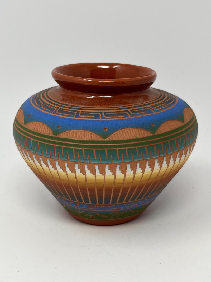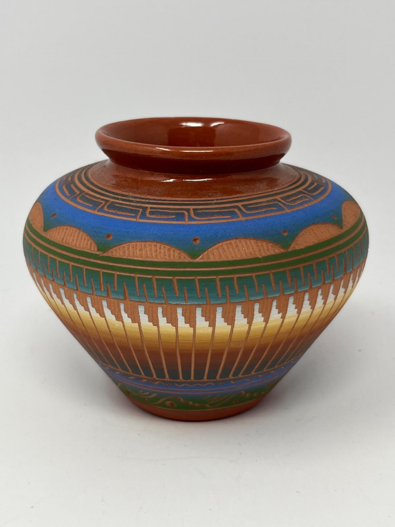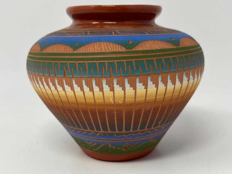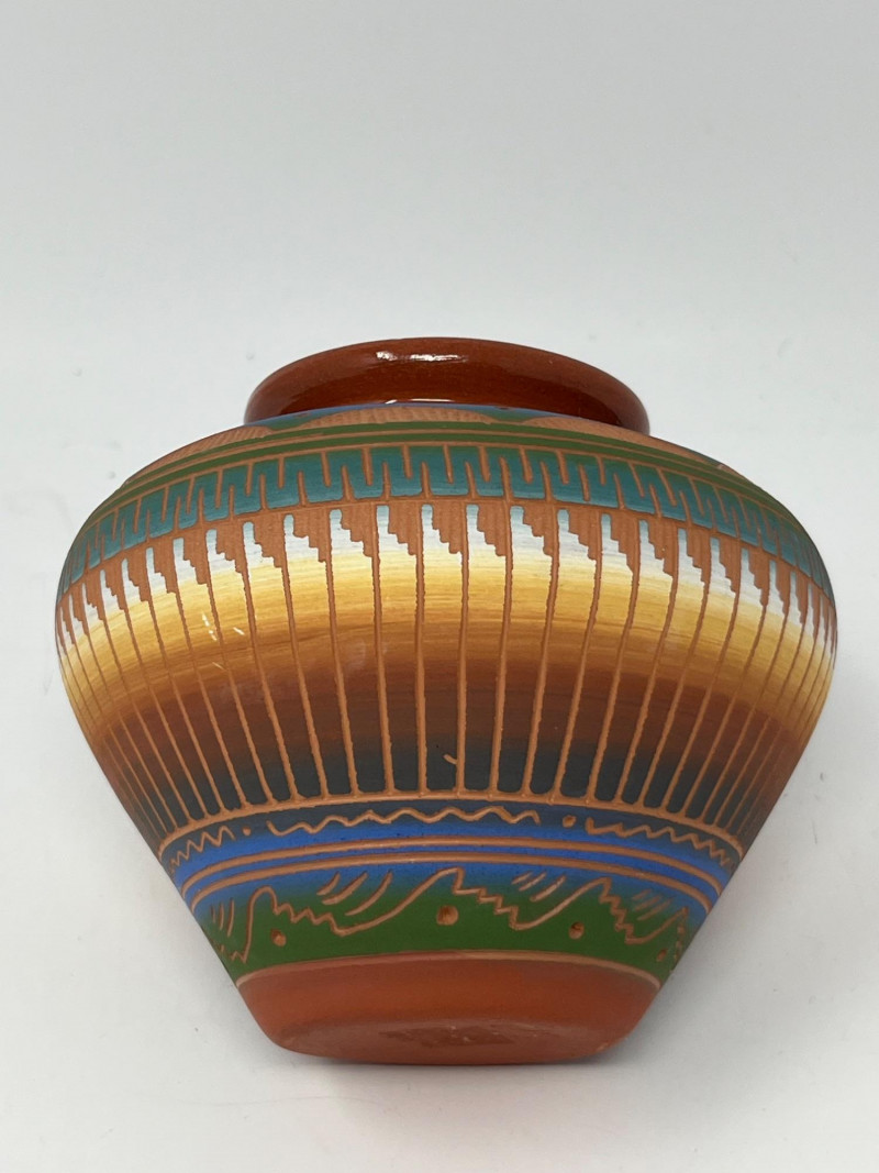 Handcrafted ceramic vessel featuring intricate painted geometric designs in blue, green, gold, and earth tones. The rounded form and narrow mouth highlight the artist’s emphasis on balanced proportion, while the surface decoration incorporates traditional Diné-inspired motifs arranged in horizontal bands, triangular elements, and vertical linework. The piece displays careful brushwork and a harmonious palette that enhances its visual rhythm. The underside is signed “PS Diné 08,” indicating the maker and year of creation. The pot presents well from all angles and reflects skilled craftsmanship rooted in cultural artistry. A strong addition for collectors of Native American pottery, Southwestern art, or hand-painted ceramics.
