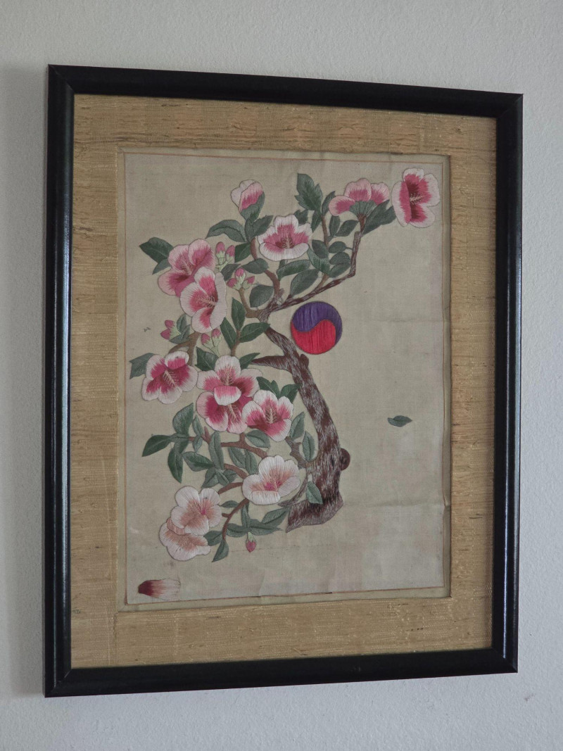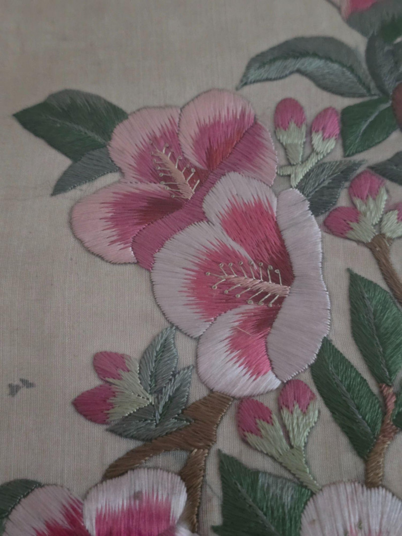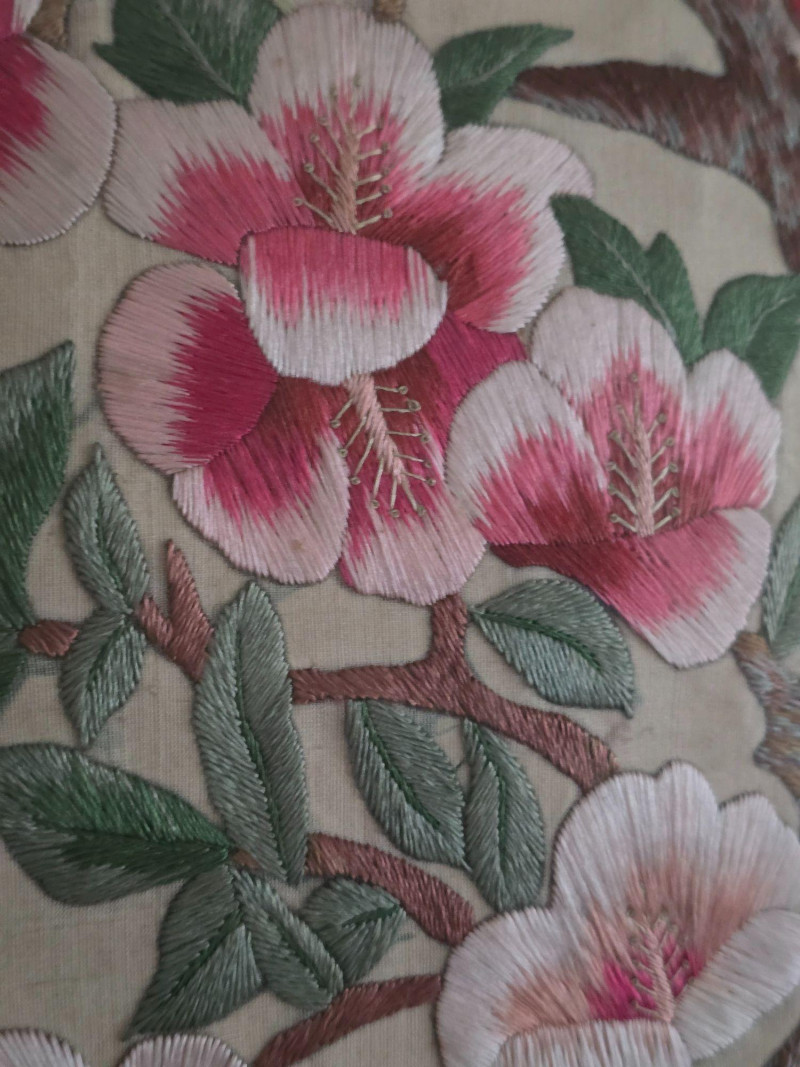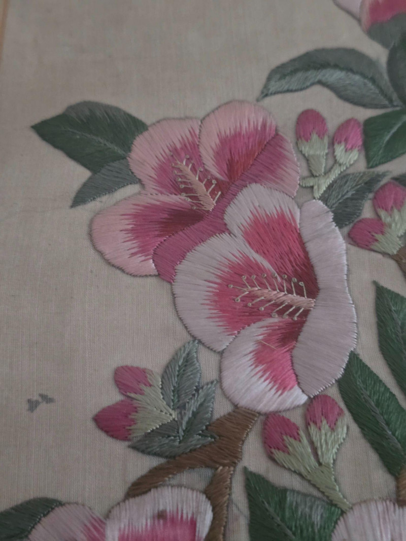 Finely worked embroidered textile depicting a flowering branch arranged in a traditional vase form. The composition features detailed pink blossoms, green foliage, and a central circular medallion rendered in red and purple tones. Close stitching and layered threadwork create depth and texture throughout the piece. Presented in a wood frame with fabric matting, this artwork blends decorative appeal with skilled needlework. Suitable for display in a variety of interiors, from traditional to eclectic. Condition