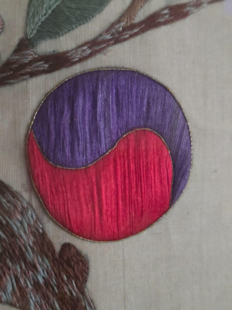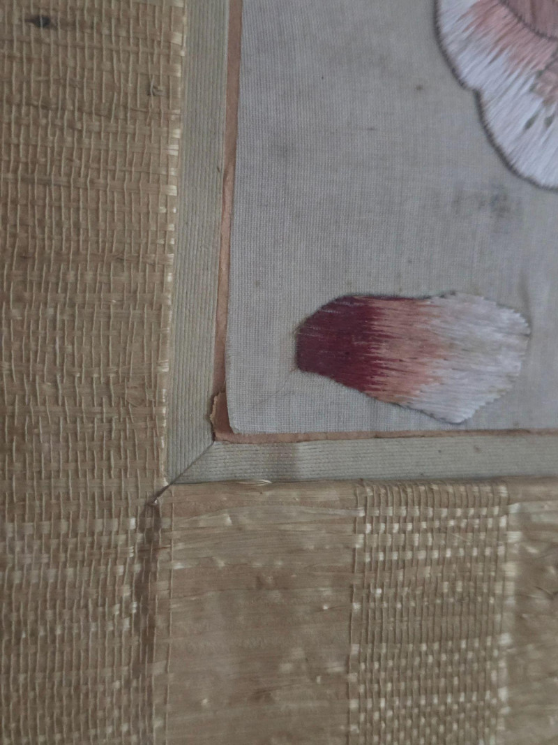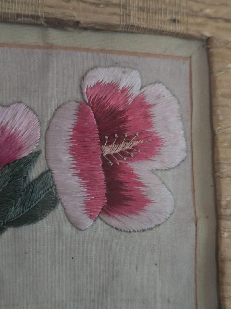 Textile and embroidery in good condition with expected variations consistent with handcrafted work. Frame shows light surface wear. Ready for wall display.