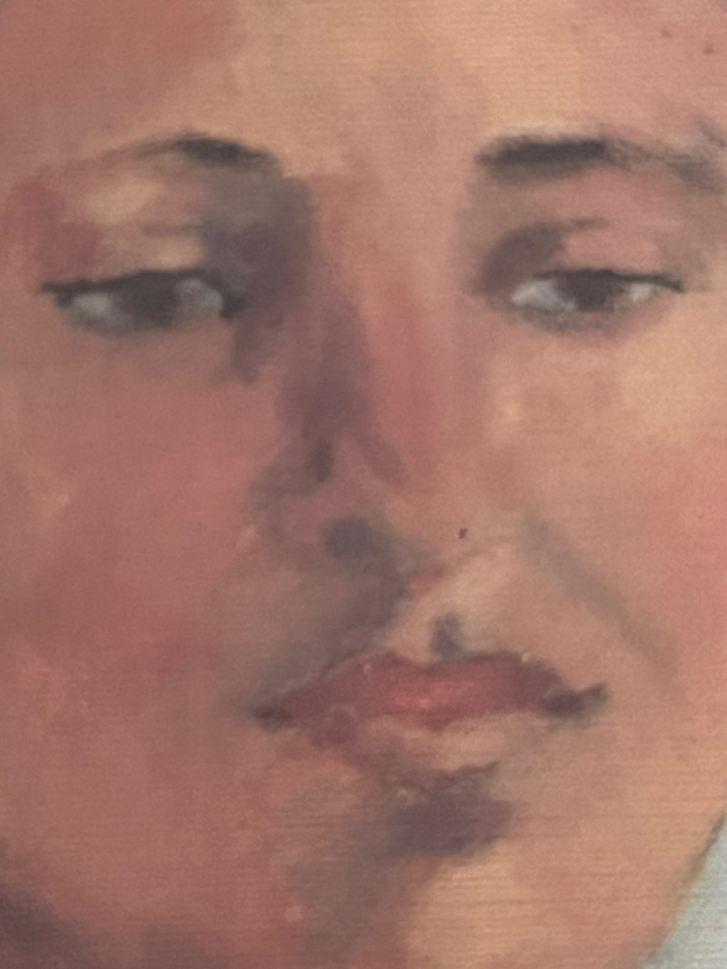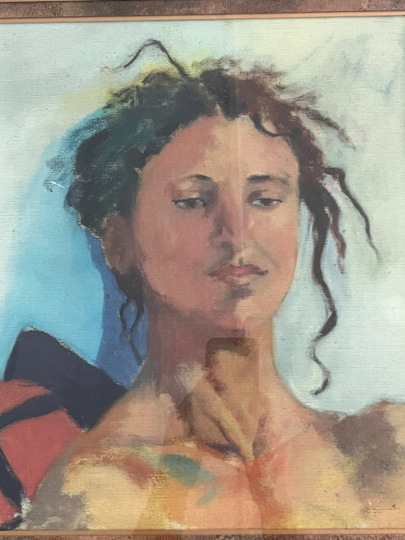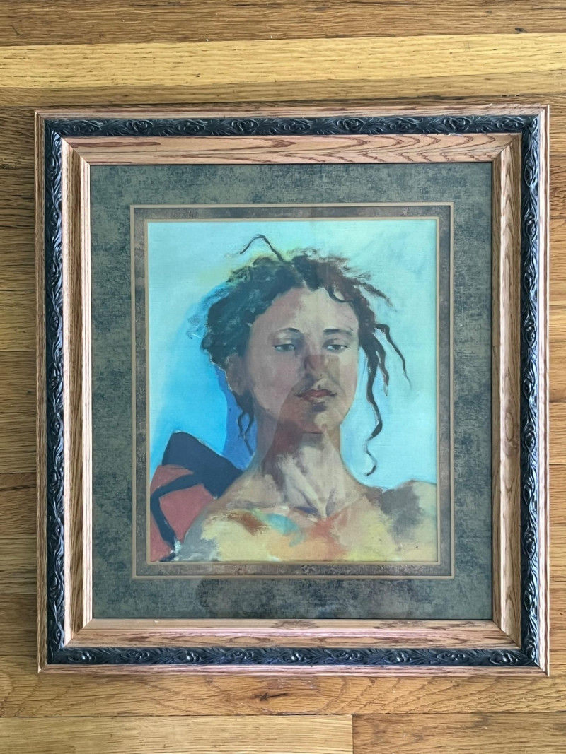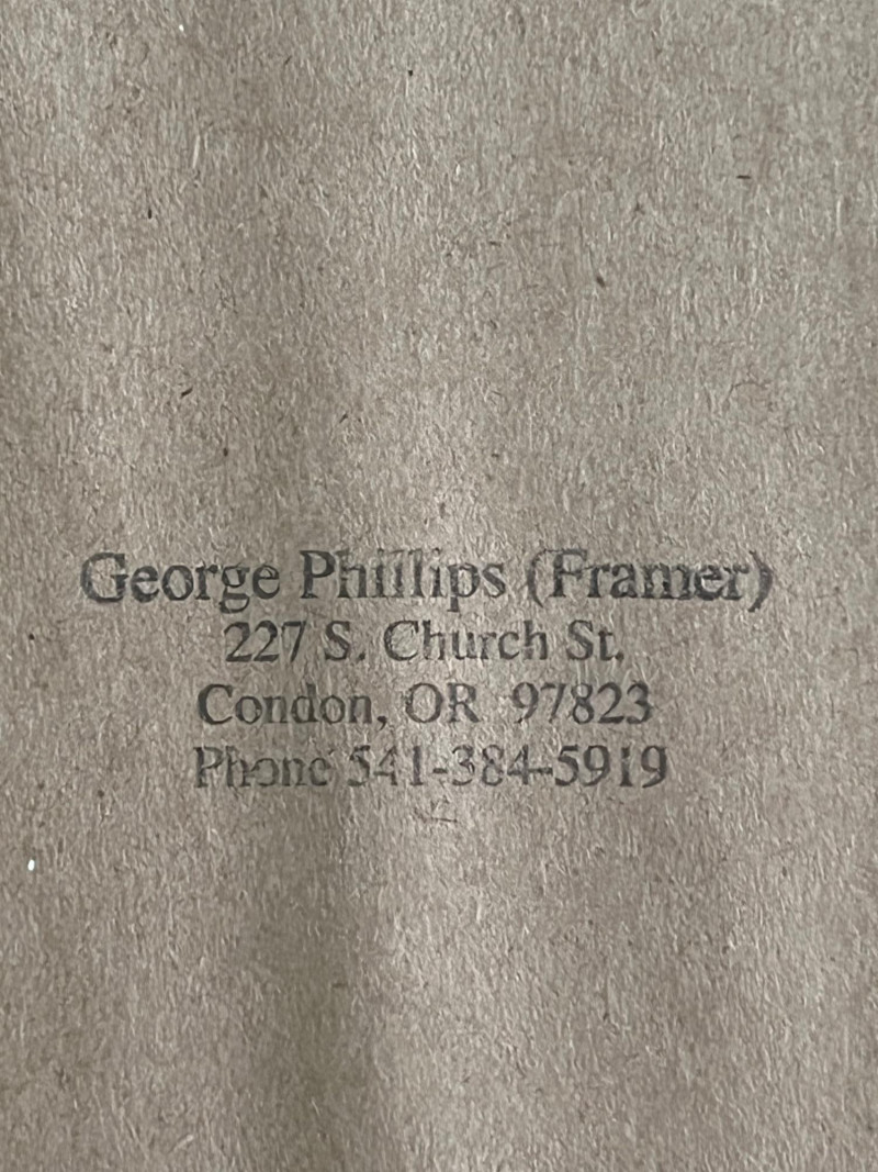 A framed portrait print depicting a seated figure rendered in a painterly, expressive style with soft brushwork and a muted palette of blues, browns, and warm tones. The artwork is presented in an ornate carved wood frame with layered molding and a traditional profile suited to classic or vintage décor. The reverse retains the original framer’s label from George Phillips, Condon, Oregon, along with the paper backing and hanging wire. No visible artist signature appears on the print. Details: Portrait print in expressive, painterly style Ornate carved wood frame with layered borders Paper‑backed reverse with hanging wire Framer label: George Phillips, Condon, Oregon Condition Notes: