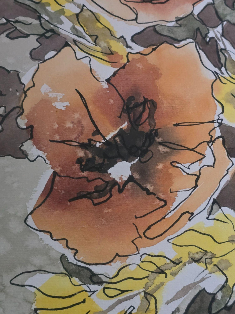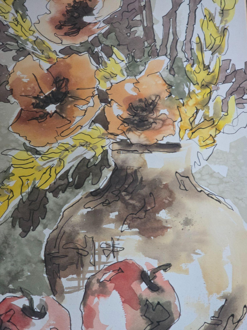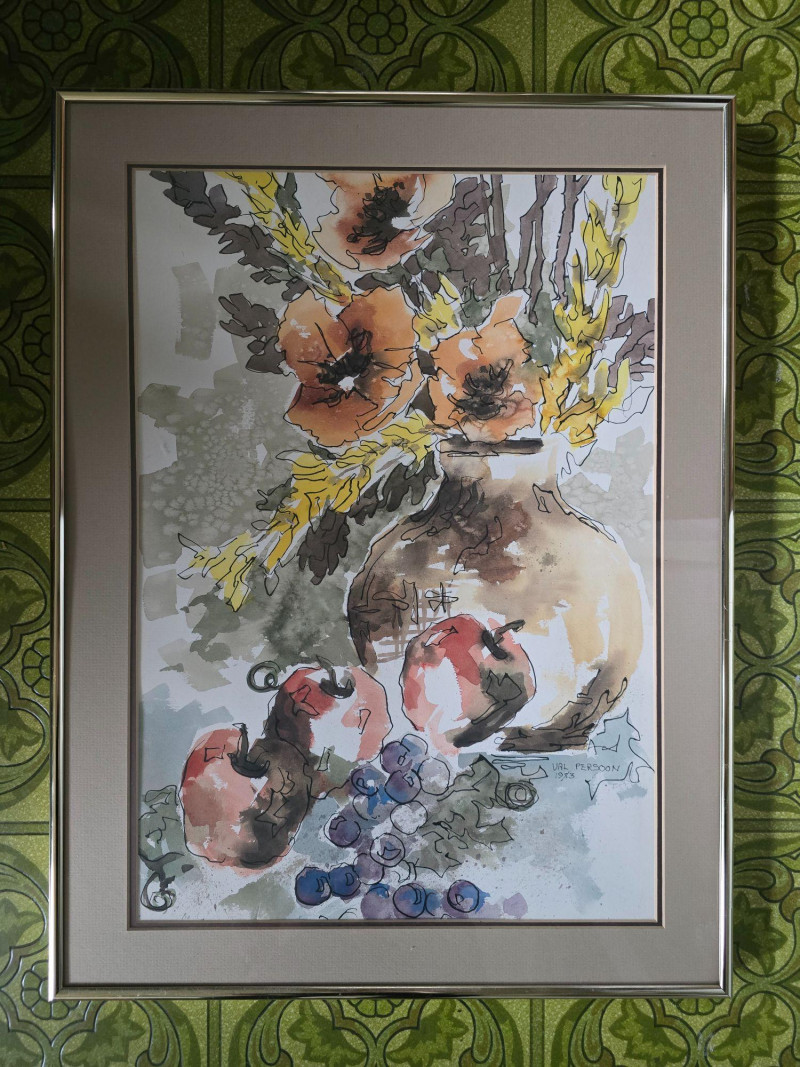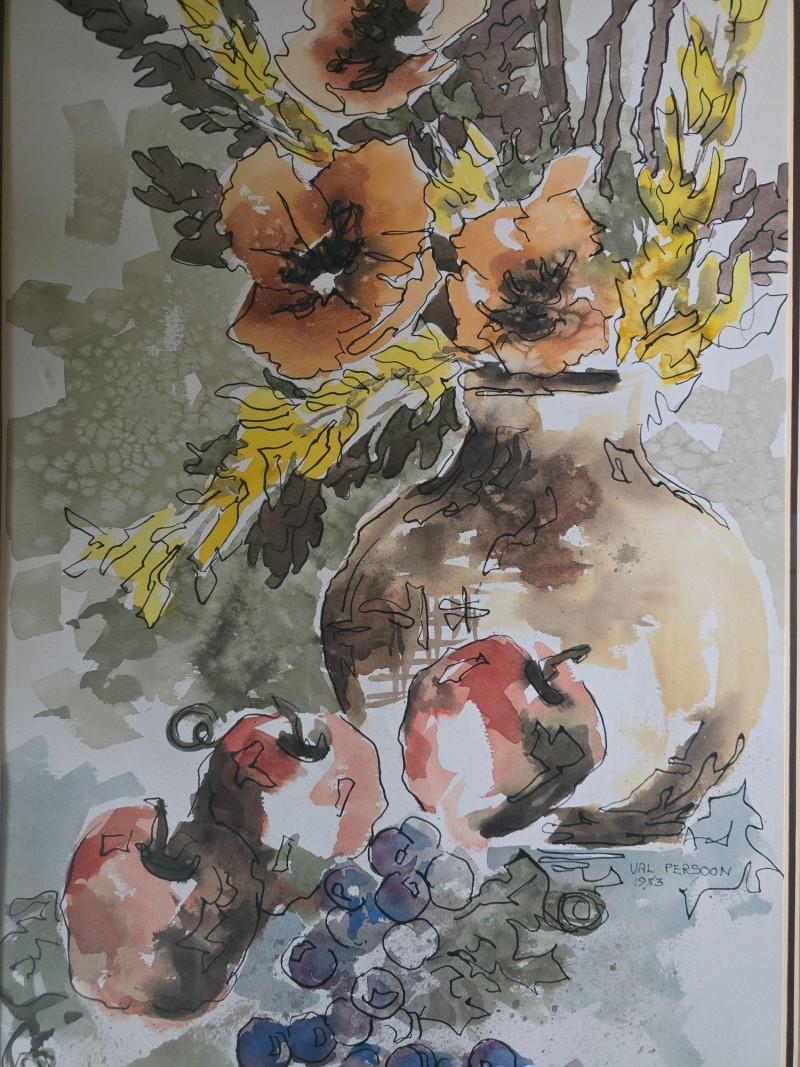 Expressive original watercolor still life by Val Persoon, signed and dated 1983. The composition centers on a vase of warm orange and yellow flowers surrounded by fruit, outlined in ink and finished with layered watercolor washes. Persoon’s loose, gestural linework and soft tonal transitions give the piece an inviting, atmospheric quality that appeals to collectors of vintage and mid‑century watercolor work. Detail images show the signature, date, and characteristic brushwork, highlighting the artist’s confident handling of line and color. Artist Bio: