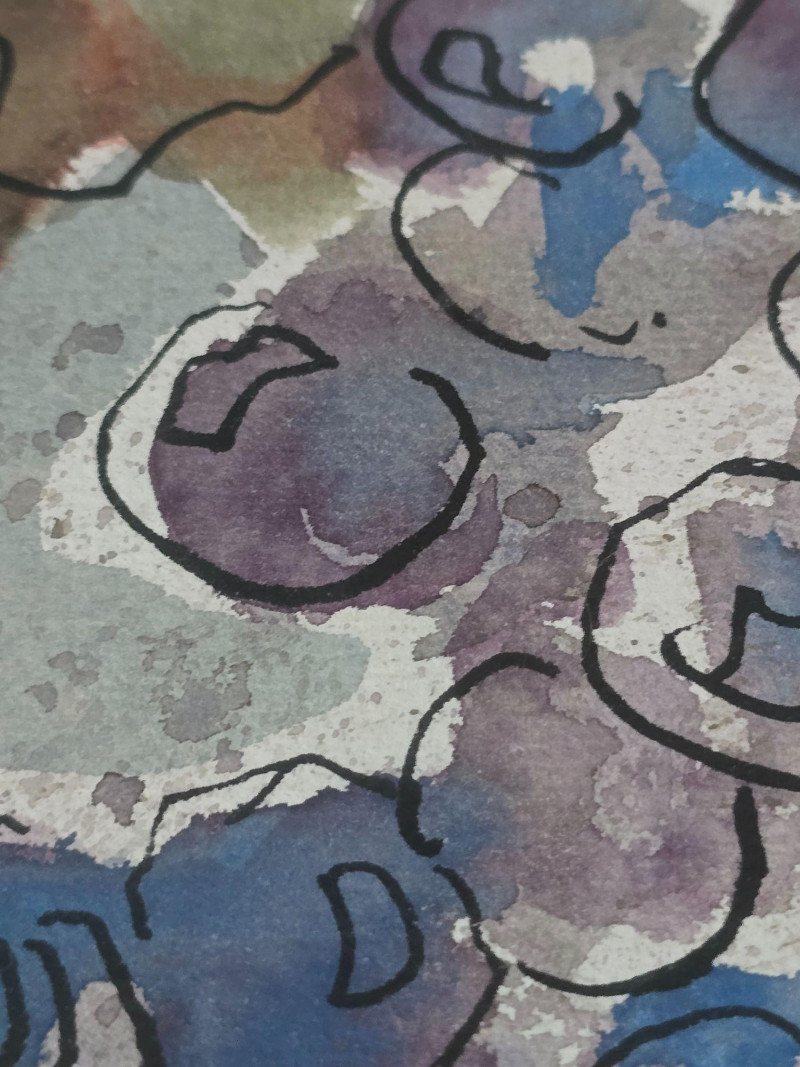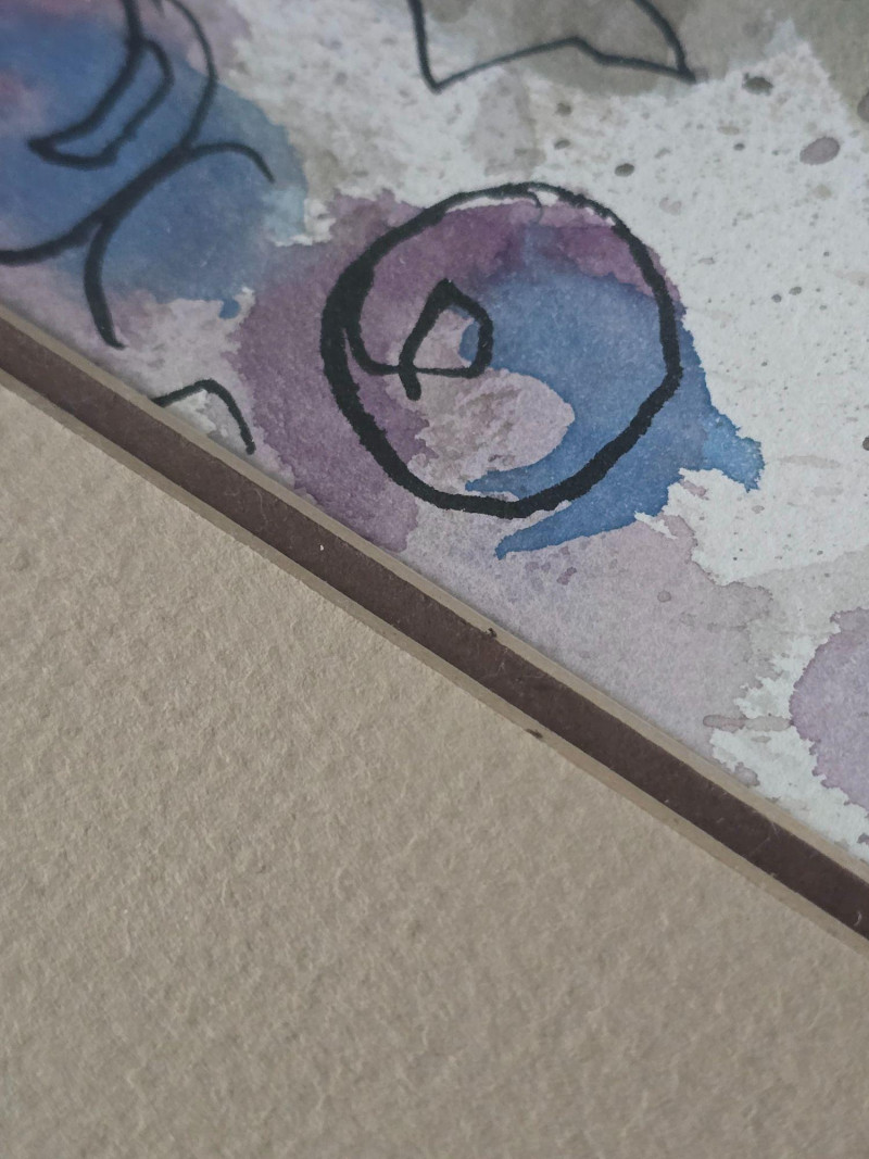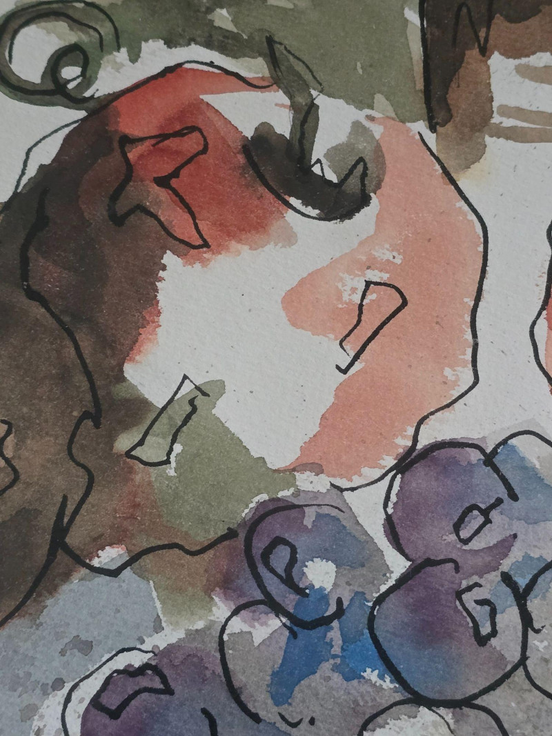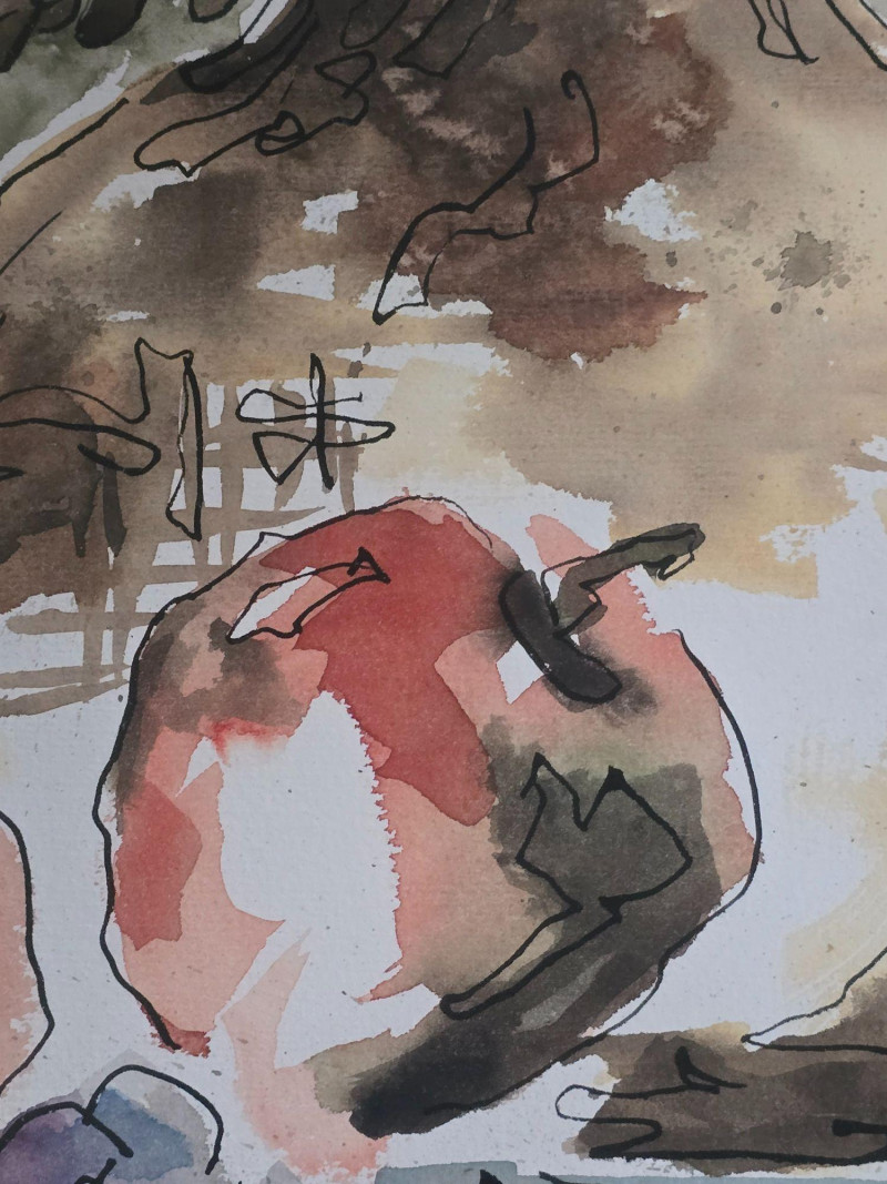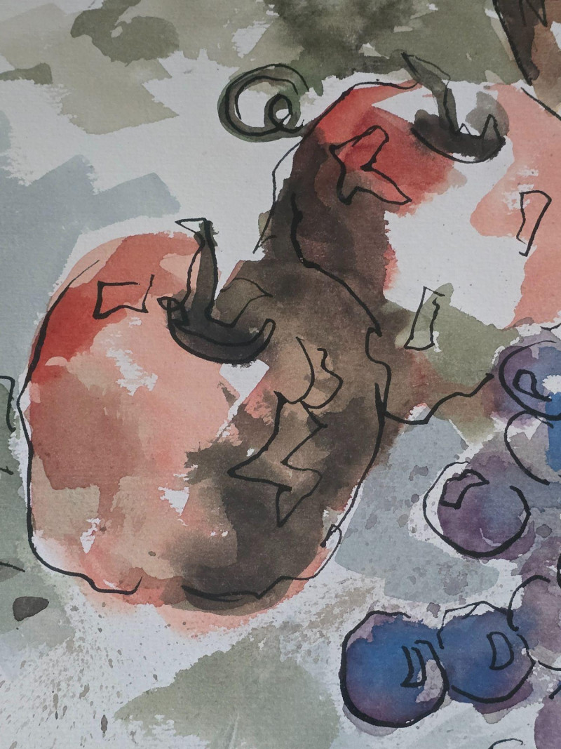 Expressive original watercolor still life by Val Persoon, signed and dated 1983. The composition centers on a vase of warm orange and yellow flowers surrounded by fruit, outlined in ink and finished with layered watercolor washes. Persoon’s loose, gestural linework and soft tonal transitions give the piece an inviting, atmospheric quality that appeals to collectors of vintage and mid‑century watercolor work. Detail images show the signature, date, and characteristic brushwork, highlighting the artist’s confident handling of line and color. Artist Bio: