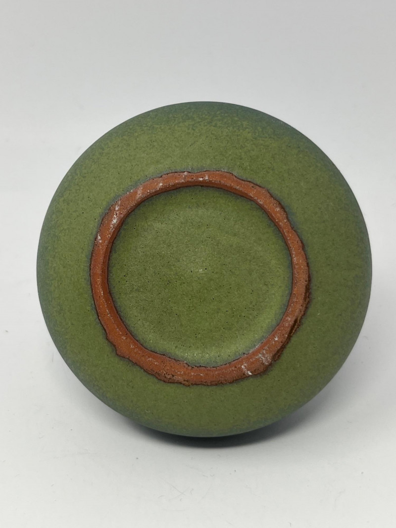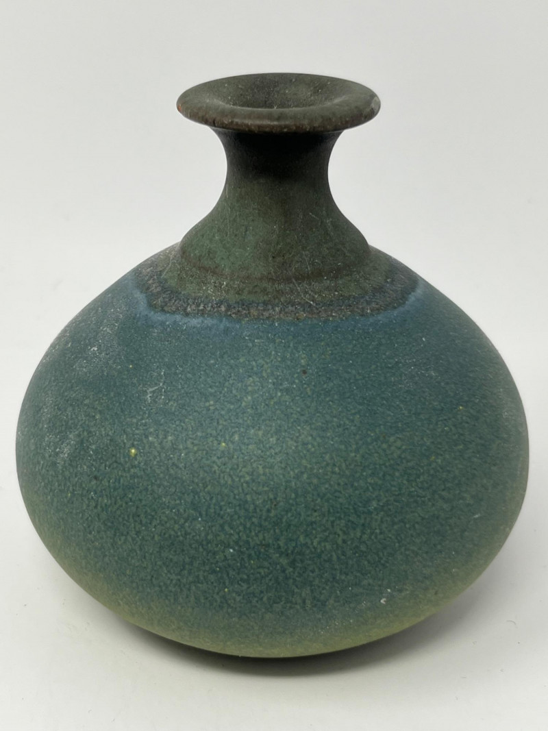 Rounded vase with a narrow neck and a matte teal glaze showing subtle tonal shifts. No maker’s mark observed. A versatile decorative piece with a soft, organic presence that pairs naturally with the bowl. Notes