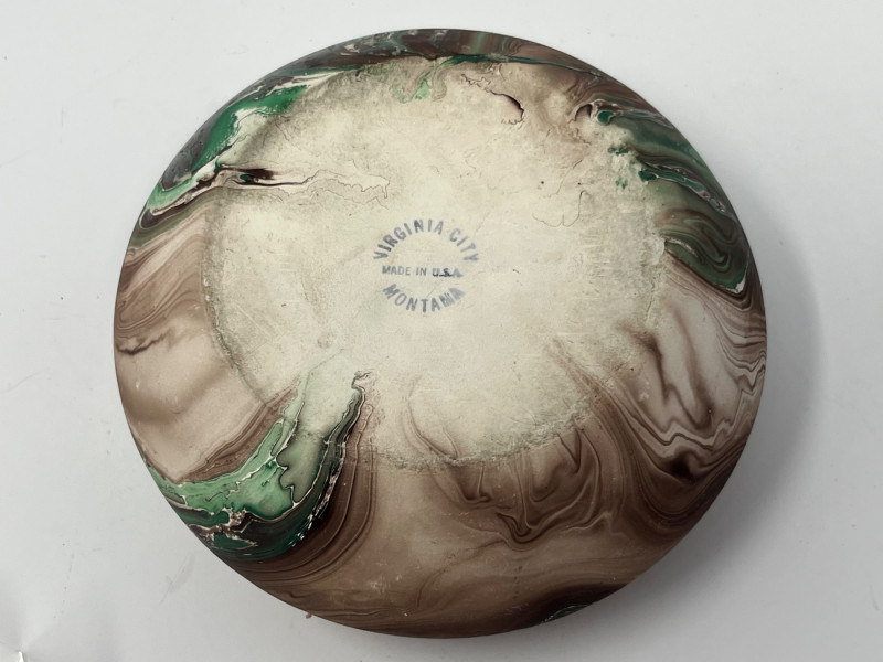 Hand‑formed bowl with a marbled exterior in swirling earth‑tone patterns and a contrasting glossy turquoise interior. The underside is clearly marked Virginia City Montana. Distinctive surface movement and glaze variation highlight its artisan production. Teal Studio Pottery Vase