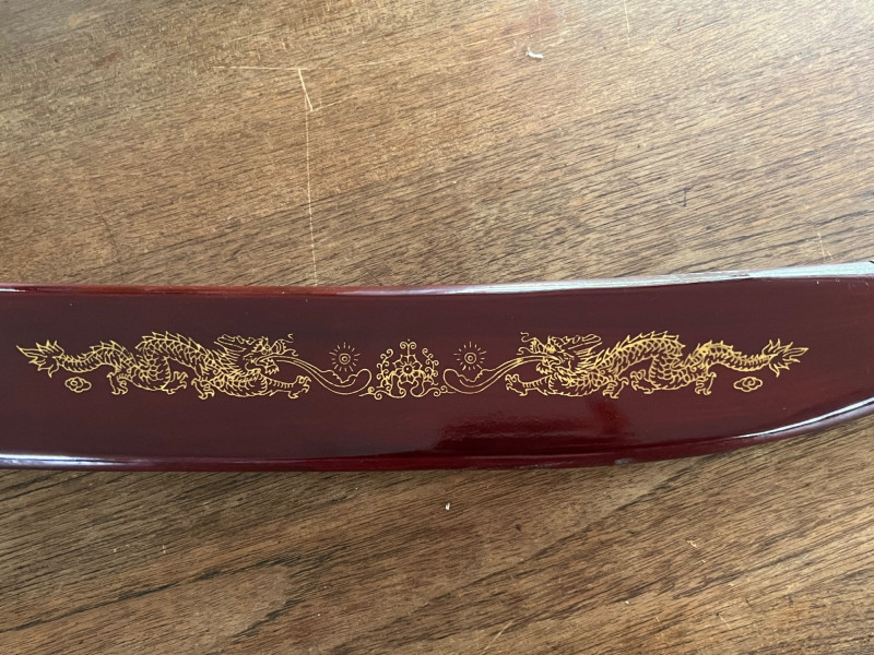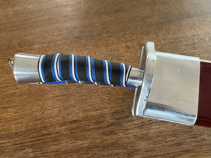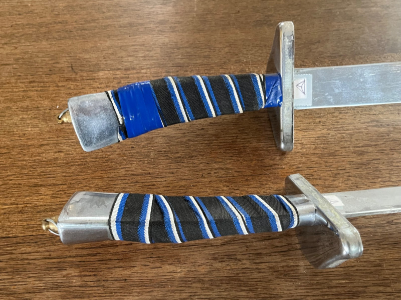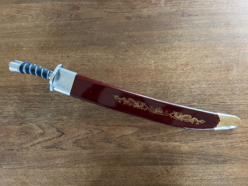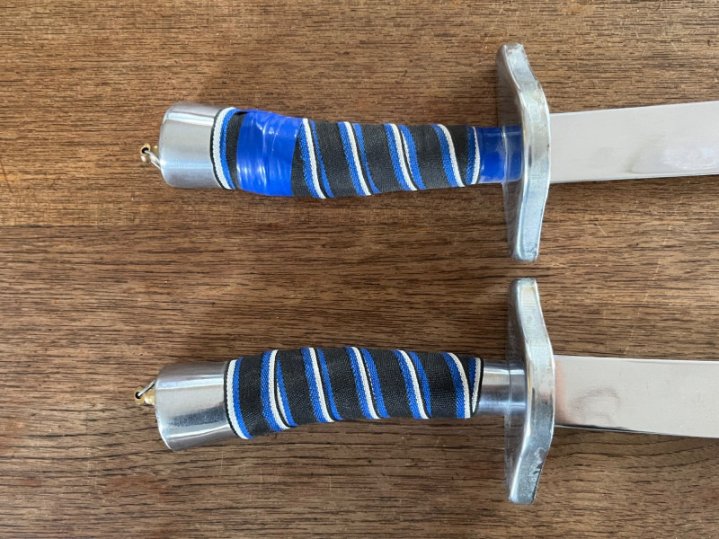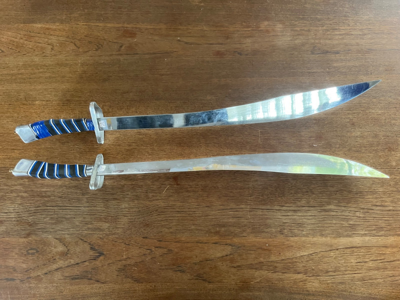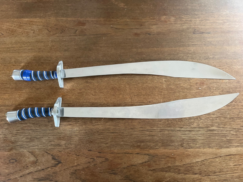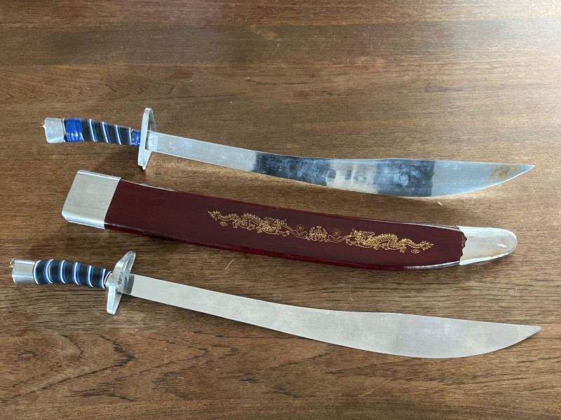 Pair of decorative display swords featuring polished metal blades and blue‑and‑silver wrapped handles. One sword includes a red scabbard with gold ornamental motifs and a shaped metal end cap. The set presents well as wall décor or thematic display pieces. Both swords show consistent finish with matching handle construction and coordinated styling. The scabbard displays raised decorative elements and traditional patterning. Blades and fittings appear intact with no noted structural issues. Suitable for collectors of fantasy‑style décor, stage props, or themed interior accents.