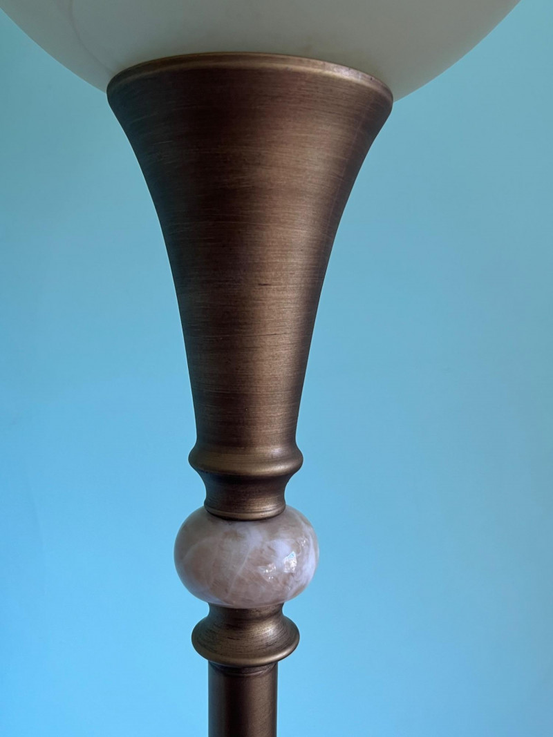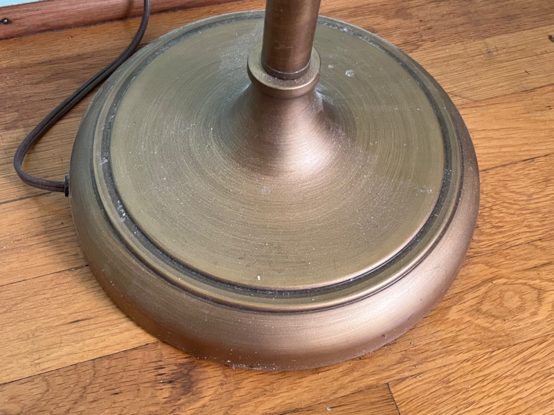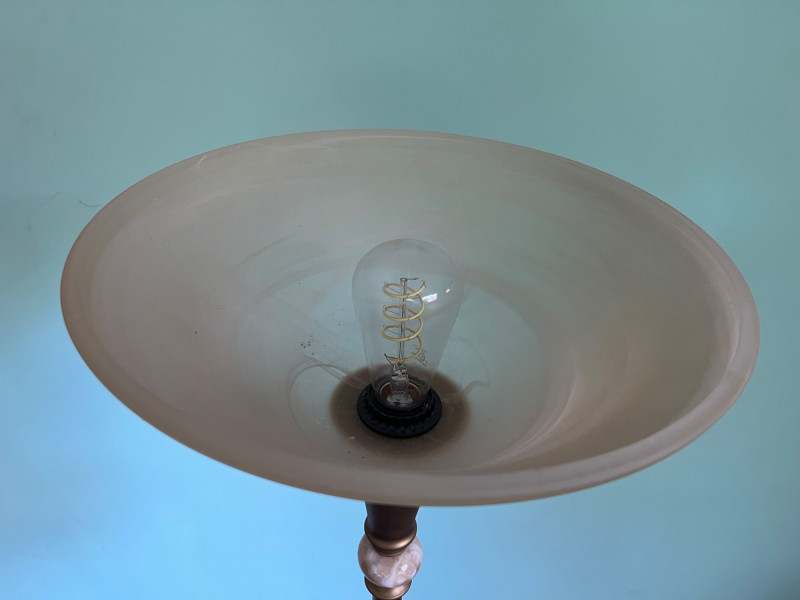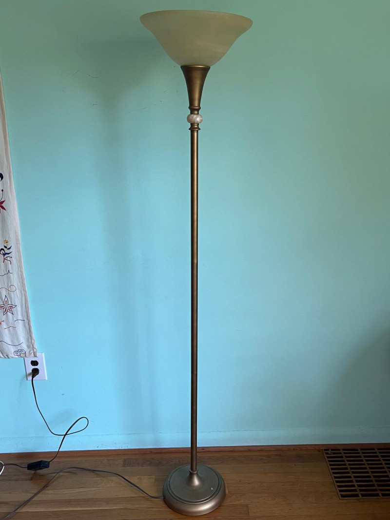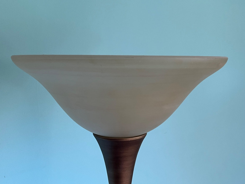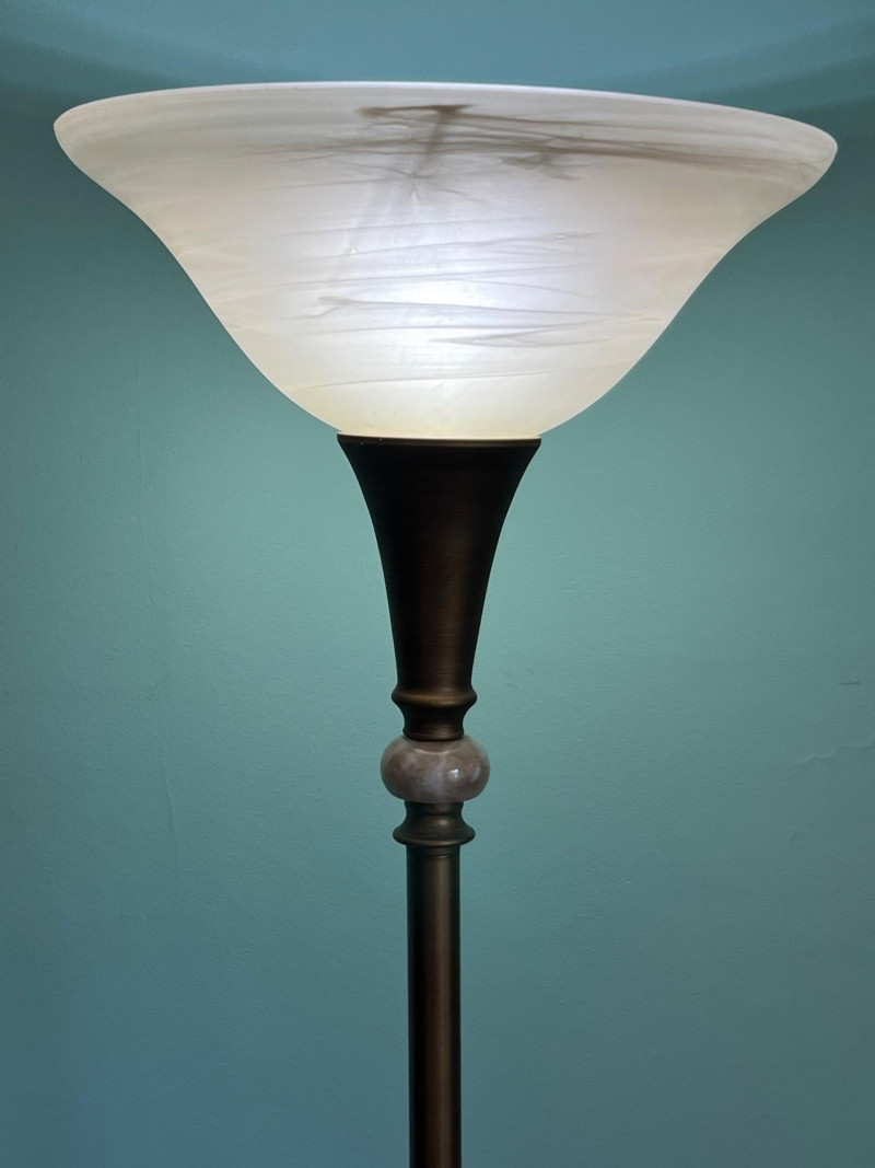 A tall metal floor lamp featuring a classic torchiere-style design with an upward-facing frosted glass shade. The lamp presents a warm, diffused light and includes decorative metal accents along the upper column. The lot includes multiple angles documenting the condition, including the shade, socket, pole, and base. The lamp shows surface wear consistent with age and use, including scuffs, finish wear, and areas of discoloration. The glass shade is intact. The electrical cord and socket are present; operational status is untested by Sound Estate Company. A functional and neutral lighting piece suitable for living rooms, offices, or staging, with a traditional profile that blends easily with a range of décor styles.