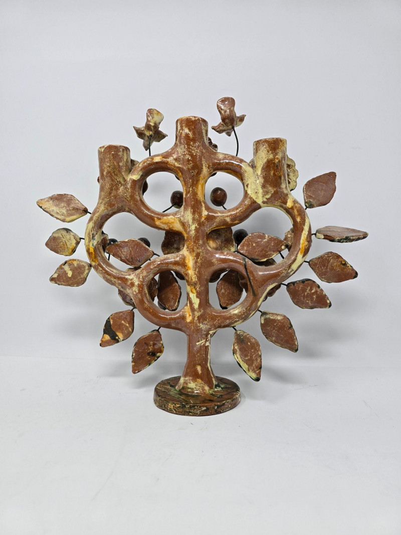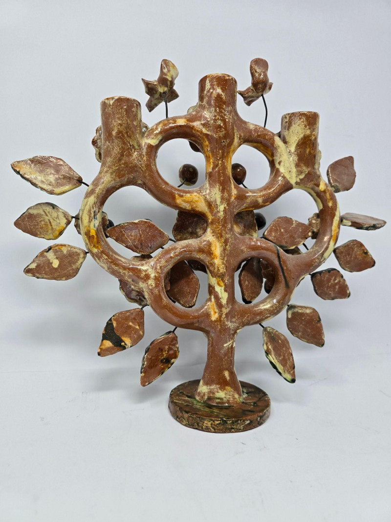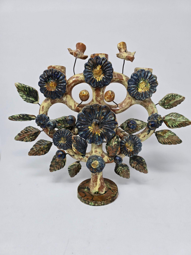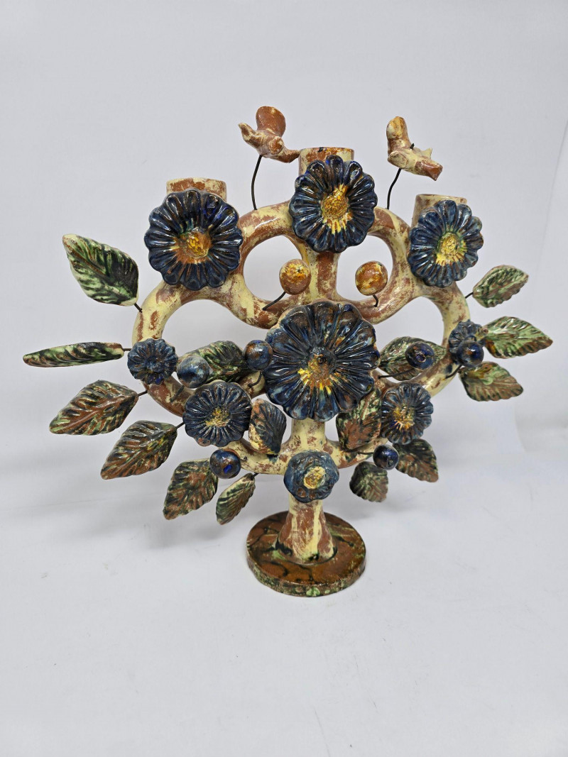 Hand‑built ceramic “Tree of Life” candelabra rooted in traditional folk art motifs. The sculptural form rises from a central trunk, branching outward into applied flowers, leaves, and small perched birds, all modeled and painted by hand. Deep blue florals, warm earth‑tone glazes, and organic surface textures highlight the expressive, handcrafted character associated with regional folk ceramics. The piece reflects the symbolic language of Tree of Life traditions—growth, continuity, and interconnected natural forms—interpreted through an artisan’s individual style. A single candle cup is integrated at the top, maintaining the sculptural rhythm of the branches. Ideal for collectors of folk art, narrative ceramics, and handcrafted devotional or symbolic forms. Strong presence as a standalone display piece. Condition Good condition with light surface wear and typical handmade irregularities. No major losses observed.