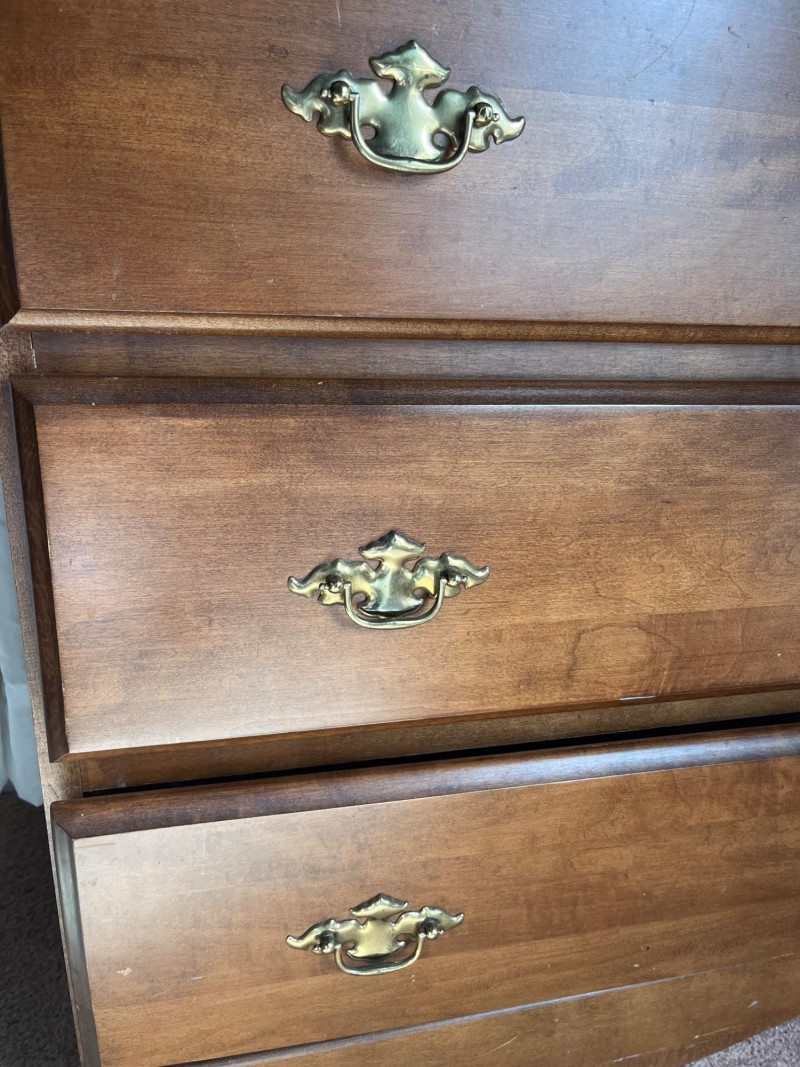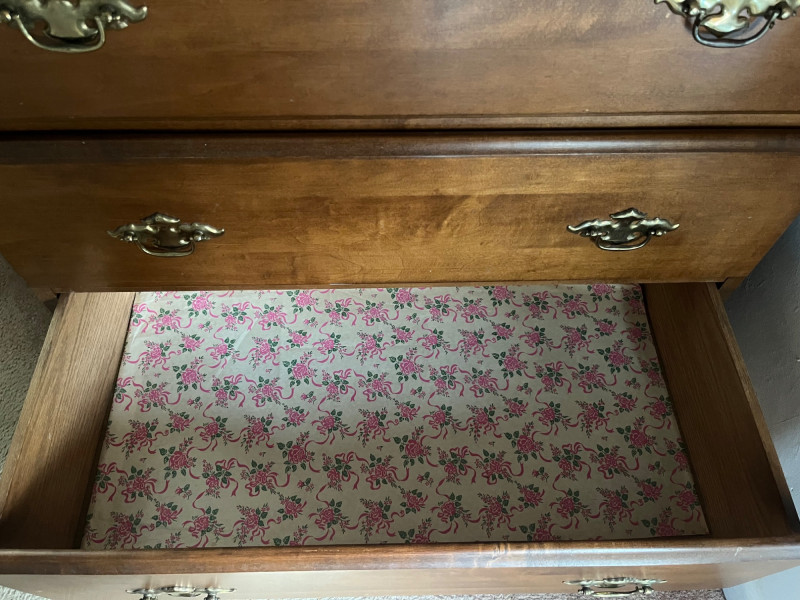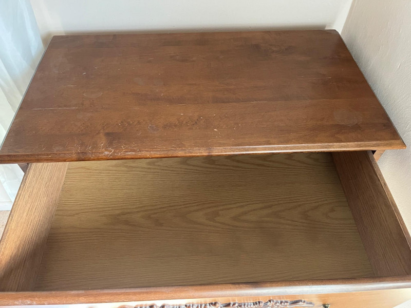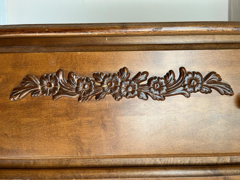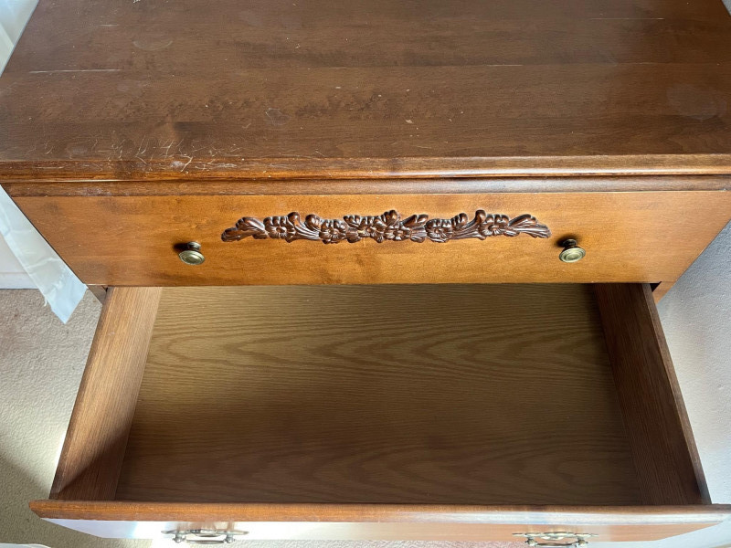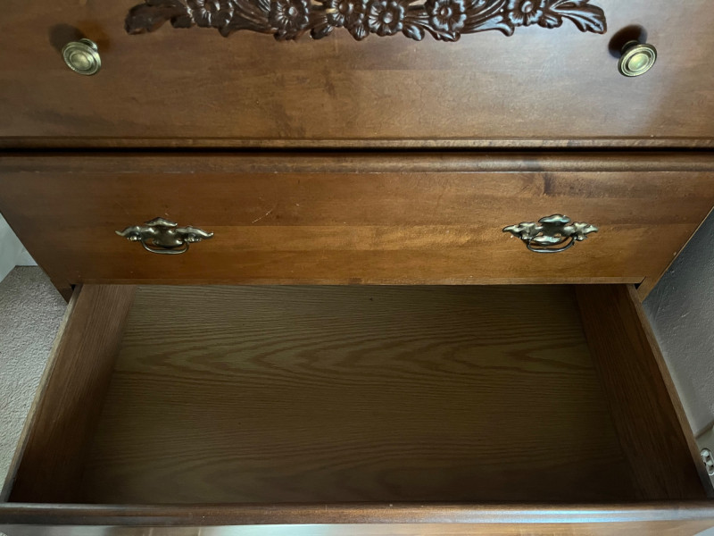 Classic wooden dresser featuring four smoothly operating drawers and a warm medium‑brown finish. The top drawer displays an ornate carved floral motif, adding decorative character to the piece. Each drawer is fitted with traditional brass‑tone hardware, and interiors show natural wood grain; one drawer includes patterned paper lining. The dresser presents well with age‑appropriate wear consistent with use. Drawers open and close properly, and the piece offers sturdy, functional storage with vintage charm suitable for bedroom, hallway, or decor‑focused settings.