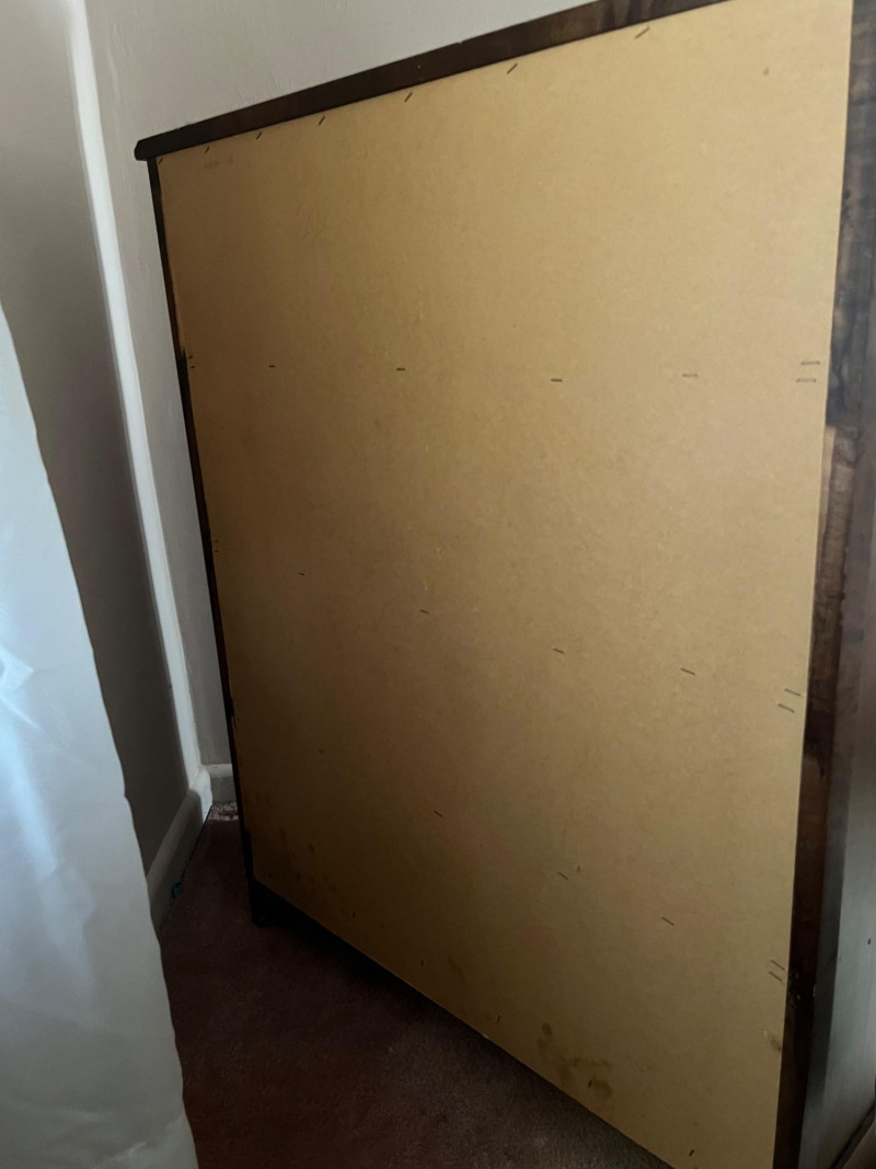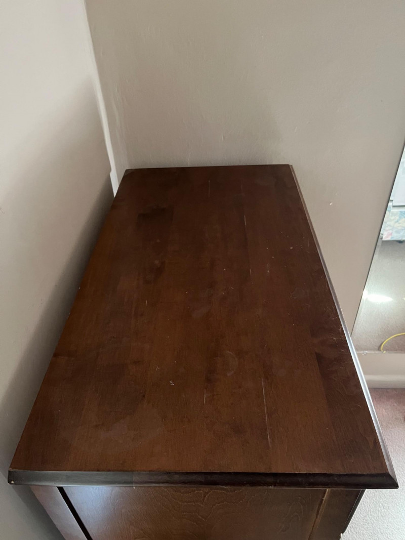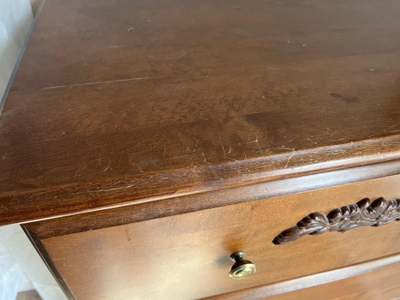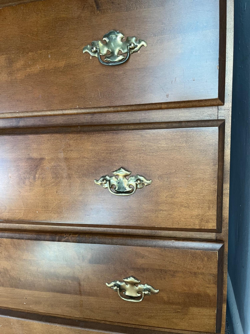Classic wooden dresser featuring four smoothly operating drawers and a warm medium‑brown finish. The top drawer displays an ornate carved floral motif, adding decorative character to the piece. Each drawer is fitted with traditional brass‑tone hardware, and interiors show natural wood grain; one drawer includes patterned paper lining. The dresser presents well with age‑appropriate wear consistent with use. Drawers open and close properly, and the piece offers sturdy, functional storage with vintage charm suitable for bedroom, hallway, or decor‑focused settings.