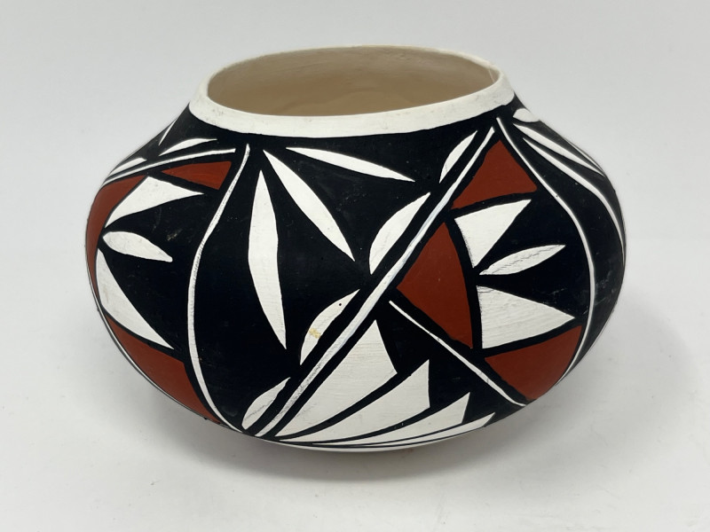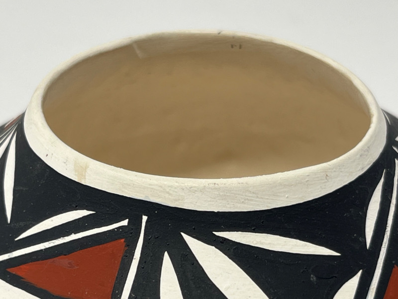 Hand‑crafted Acoma Pueblo pottery jar featuring traditional geometric and leaf‑form painted motifs in black, white, and red‑brown. The design displays the fine linework, symmetry, and balanced patterning associated with Acoma ceramic artistry. The vessel has a rounded form with a narrow mouth and an unpainted natural‑clay interior. The underside is signed “Acoma New Mexico, Z G” indicating cultural origin and maker’s hand. Surfaces show strong visual clarity with well‑preserved painted elements. A classic example of Acoma Pueblo pottery suitable for collectors of Southwestern ceramics, Native American art, and hand‑painted traditional forms.