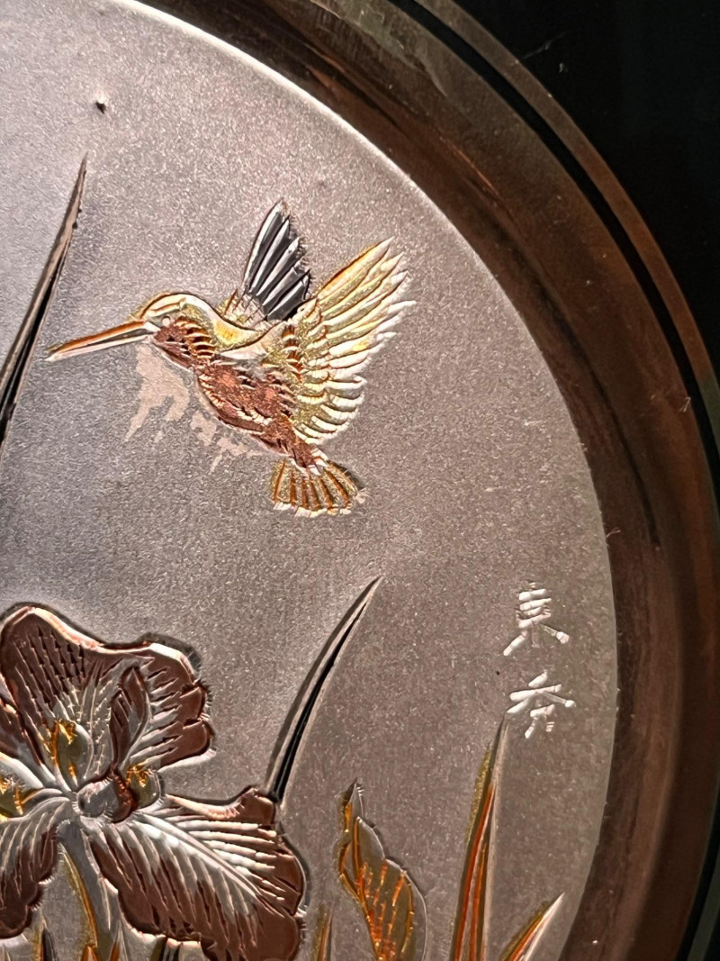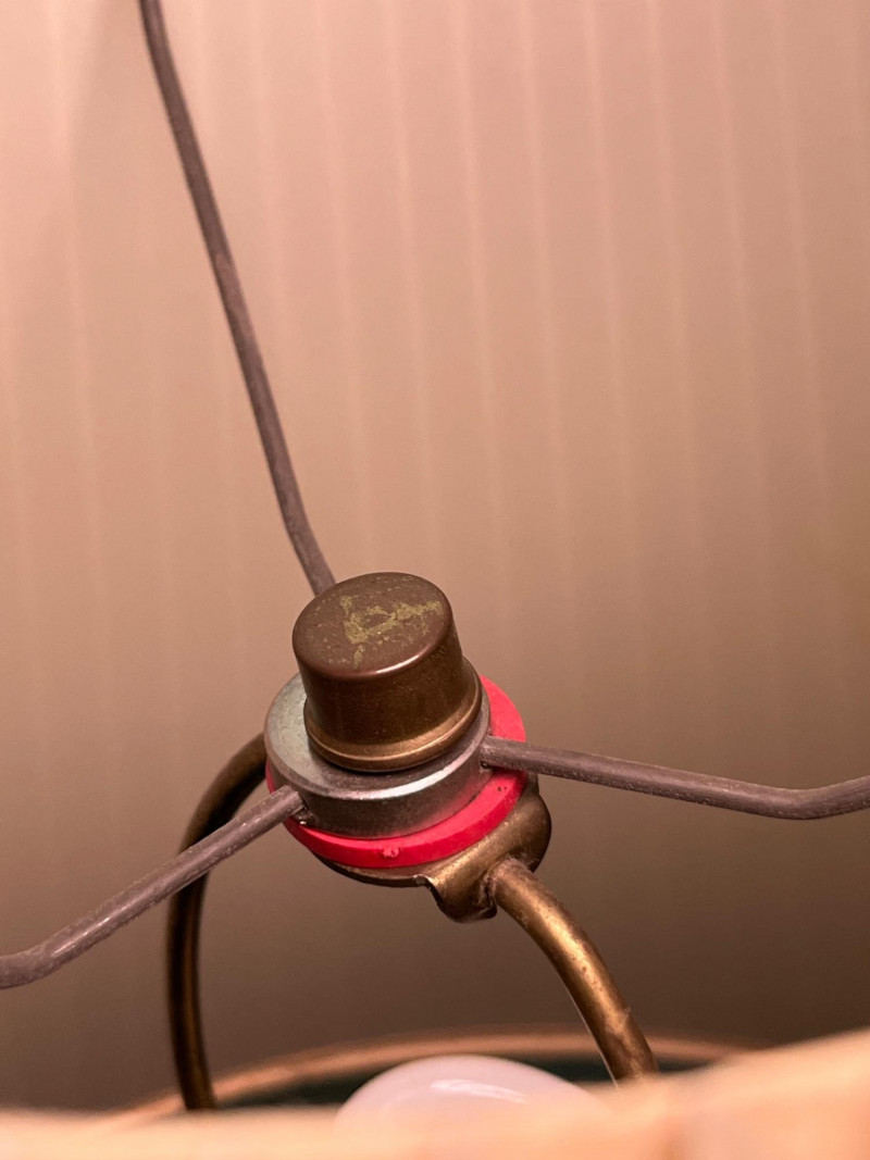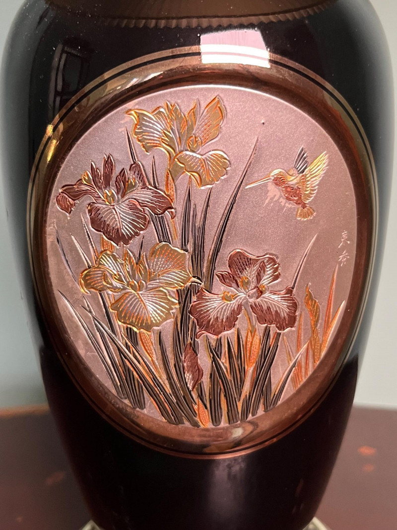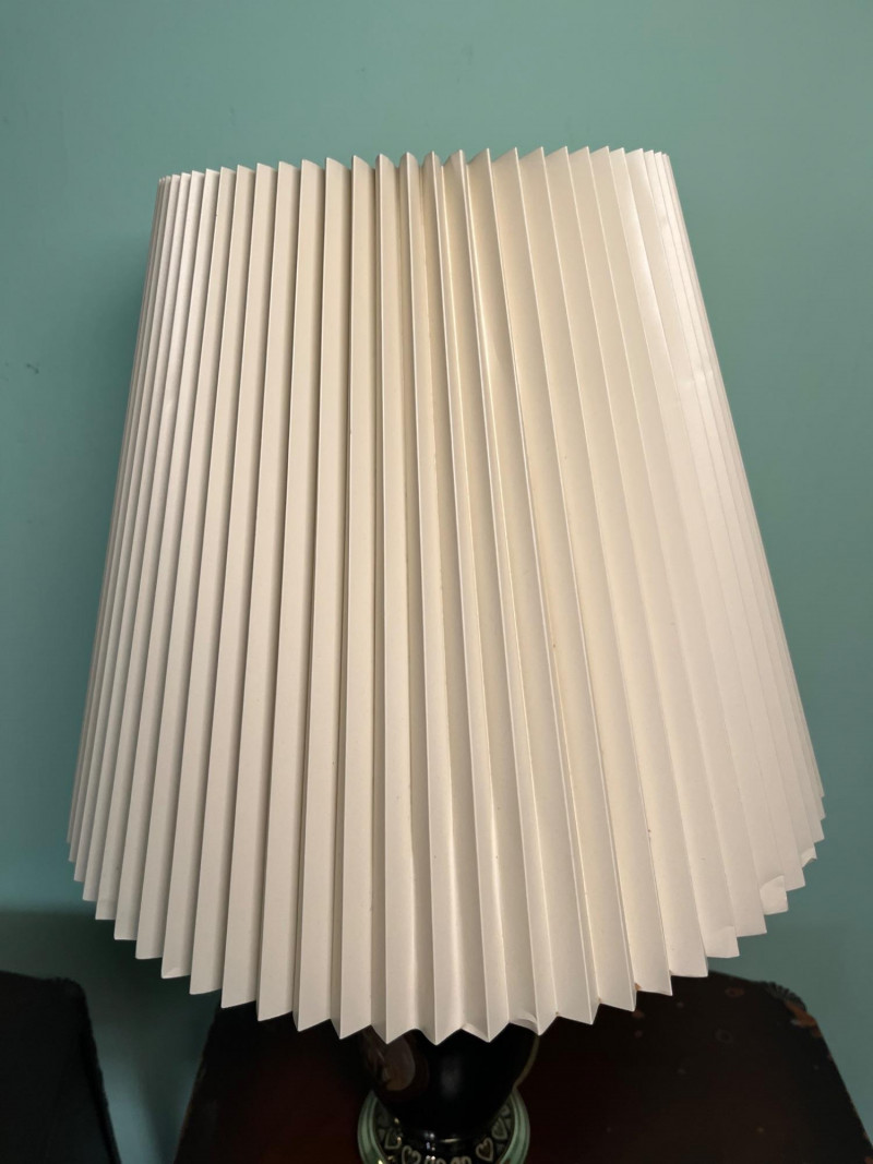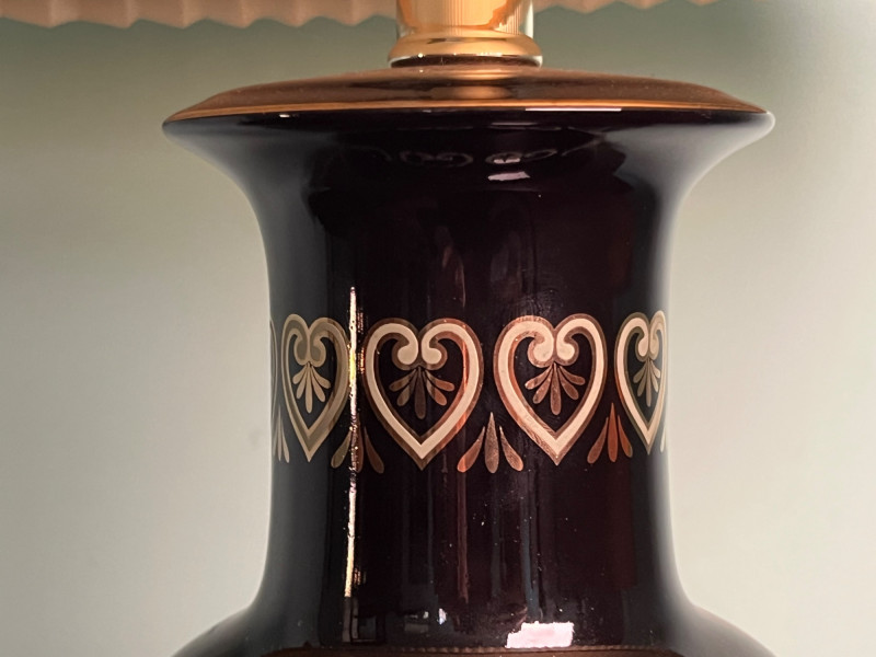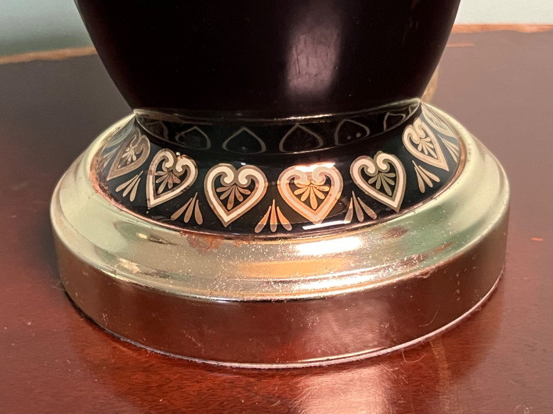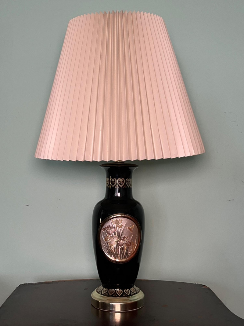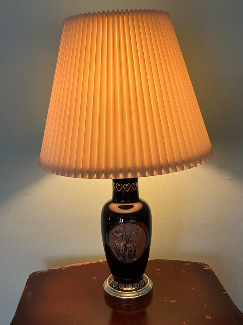 A traditional porcelain table lamp featuring a dark, high‑gloss body with ornate gilt detailing and an oval hand‑painted floral panel. The artwork depicts blooming flowers with a butterfly motif, framed by raised gold embellishment. The lamp includes a pleated cream shade that provides a warm, even glow when illuminated. The base displays classic scrollwork and gold trim, with hardware consistent with mid‑century decorative lighting. The socket bears the Underwriters Laboratories (UL) safety certification, marked for indoor use only (660W / 250V), indicating it met UL’s electrical safety standards at the time of manufacture. Condition is consistent with age and use, with typical surface wear. Tested and powers on. Includes: Lamp base and pleated shade as shown.