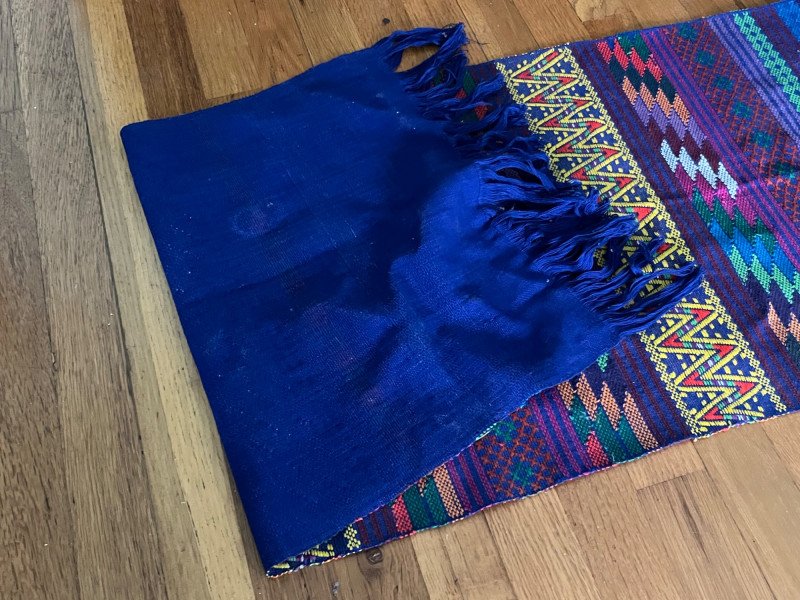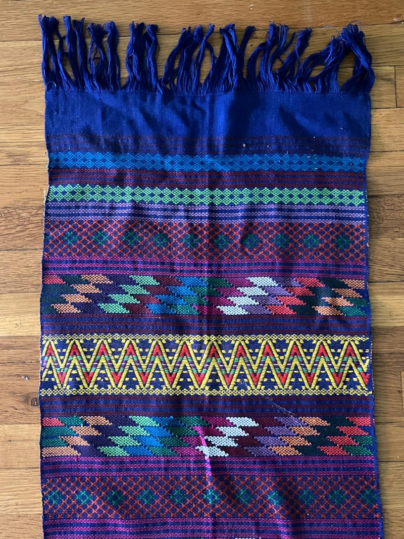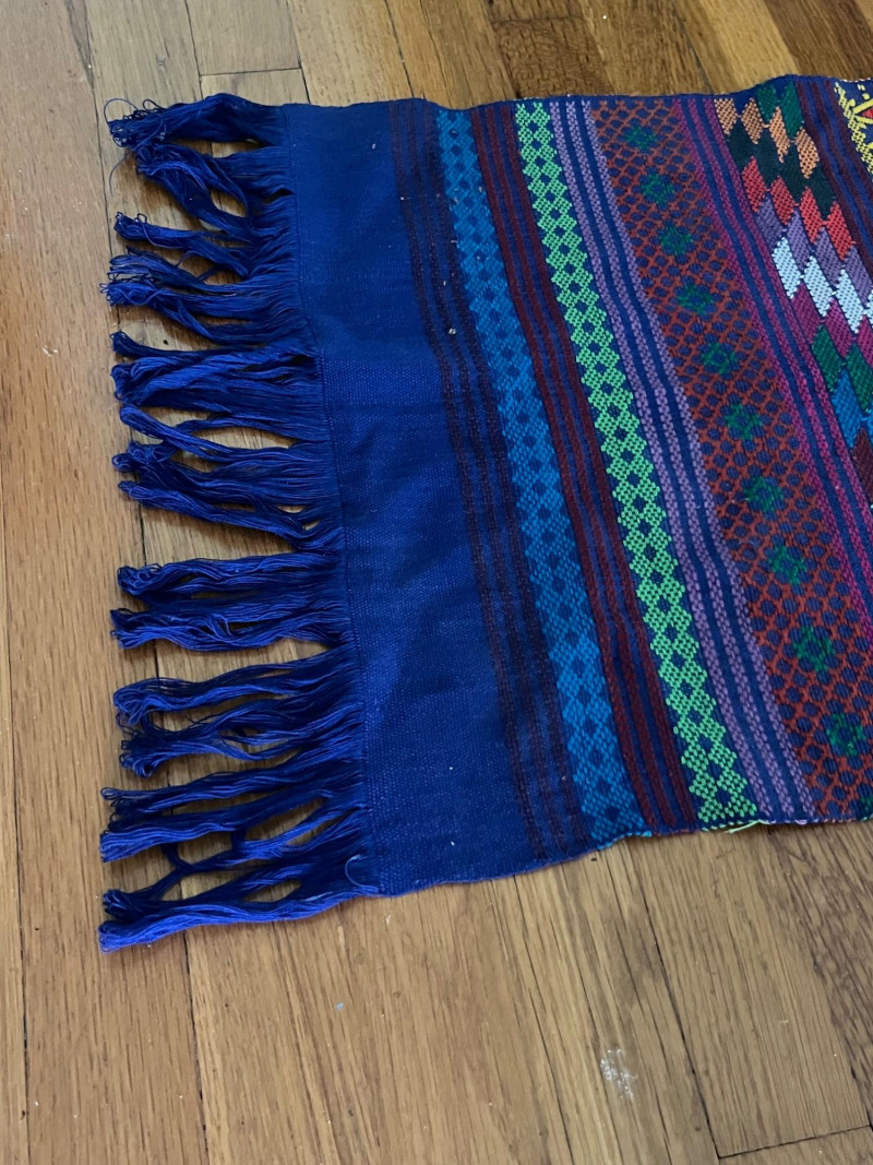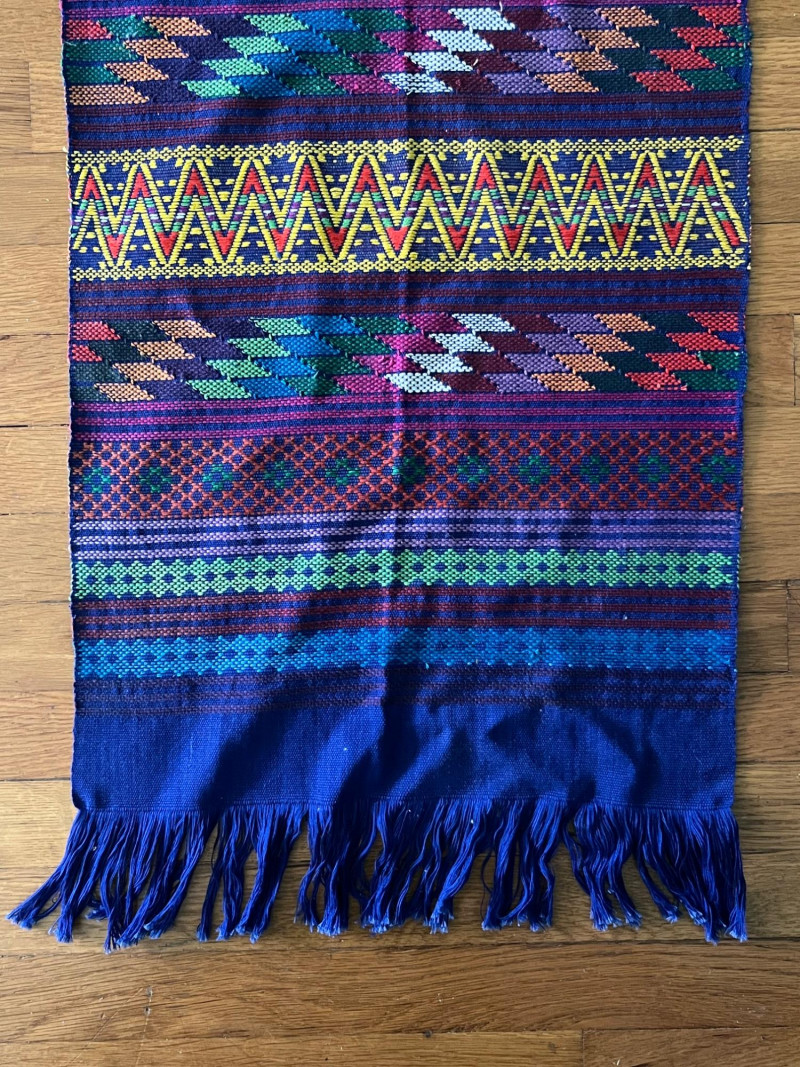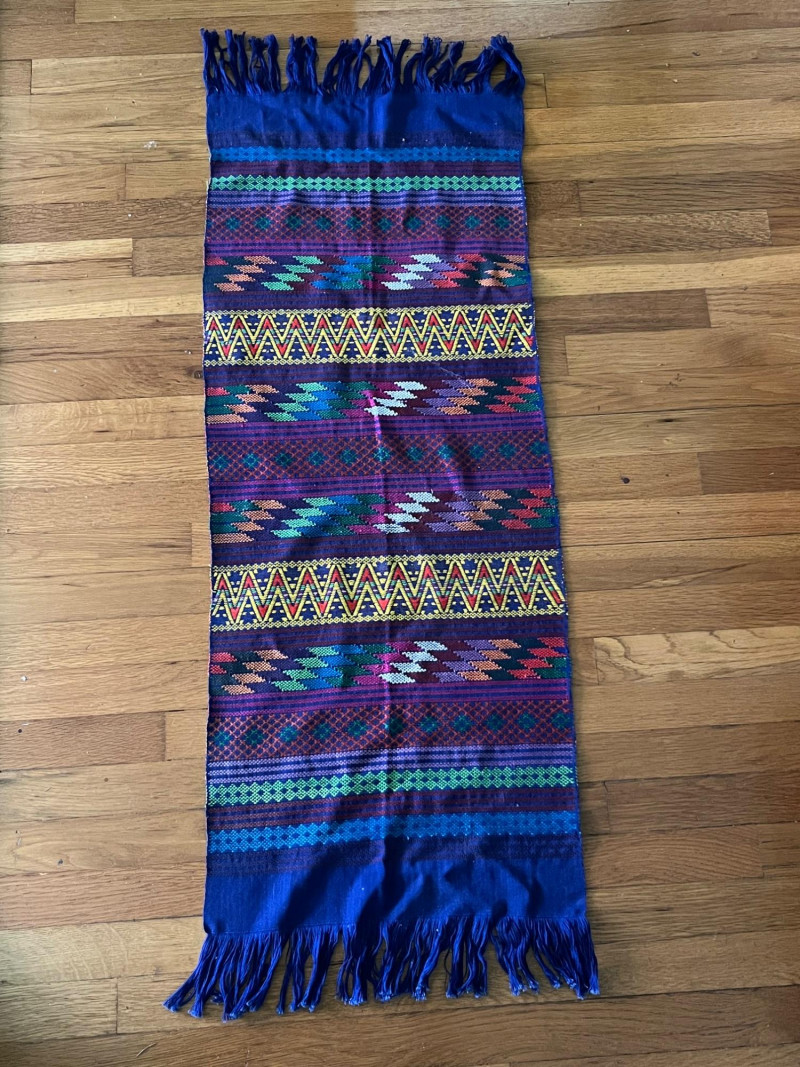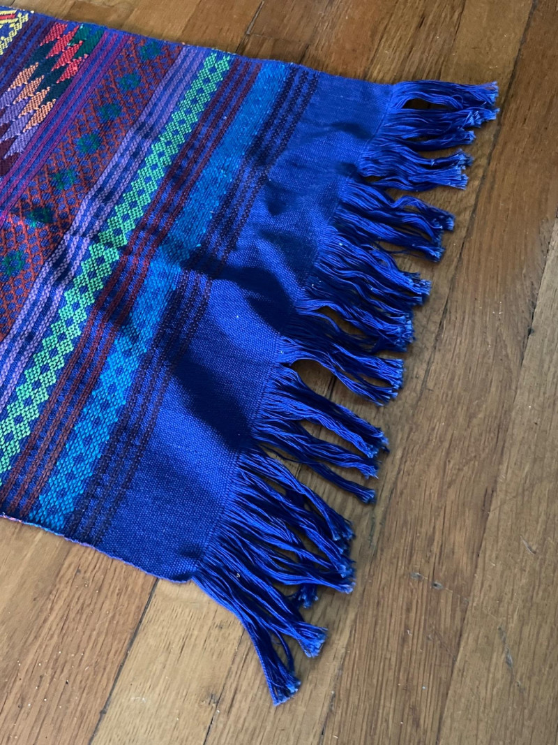 Vibrant Guatemalan handwoven table runner featuring deep blue, purple, green, orange, and earth‑toned accents arranged in repeating geometric and zigzag motifs. The symmetrical patterning and rich color transitions reflect traditional Mayan weaving techniques, with fringed ends completing the artisan finish. The runner lays flat with a consistent weave structure and strong visual rhythm. Close inspection shows detailed pattern work and intentional color placement characteristic of handcrafted Guatemalan textiles. A striking décor piece suitable for table display, layering, or inclusion in a textile or folk‑art collection. Condition: