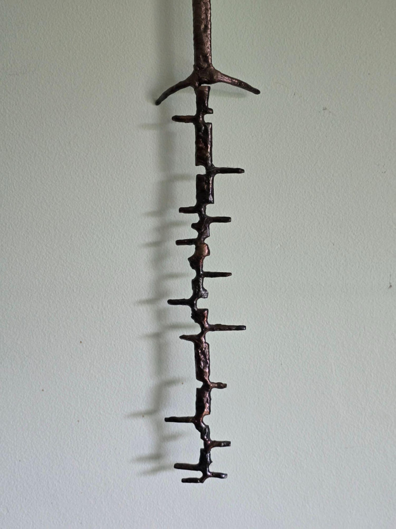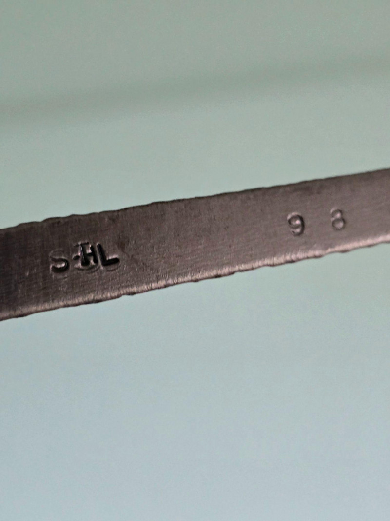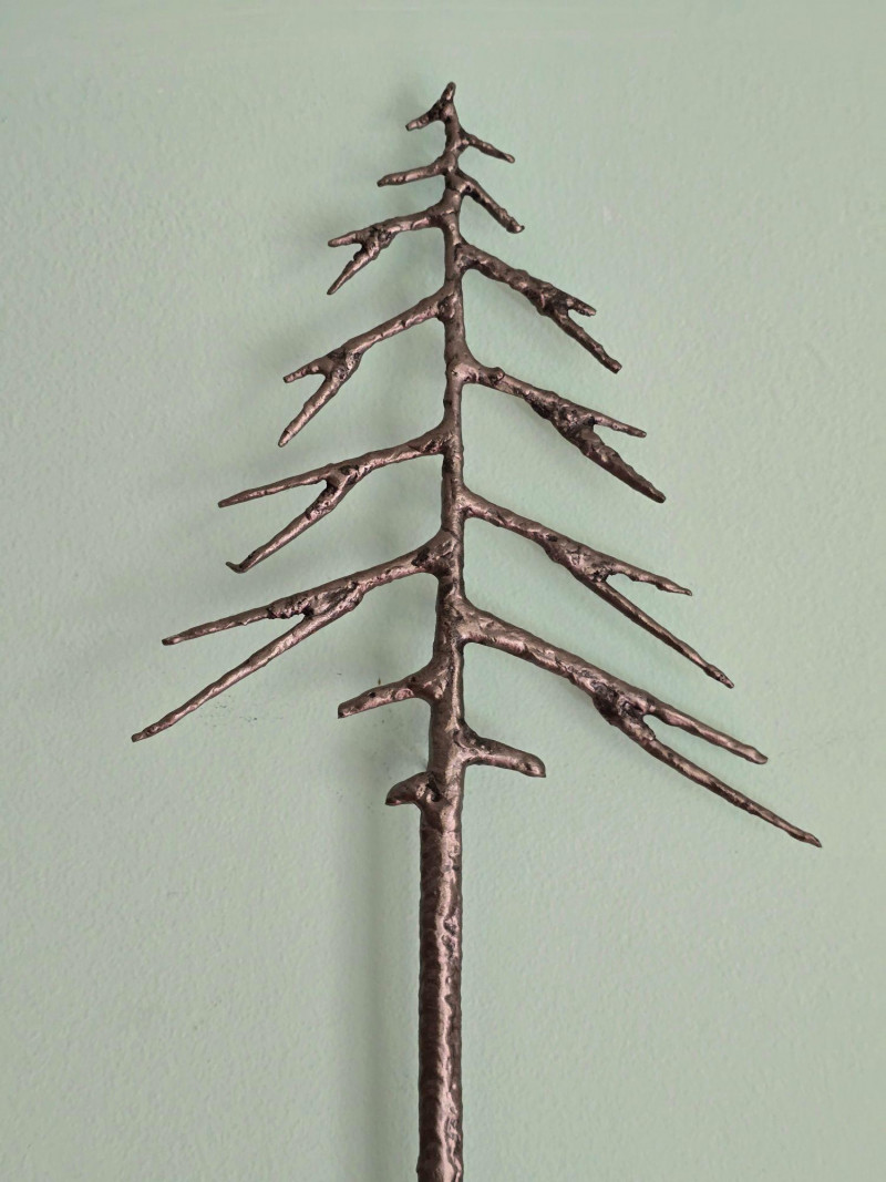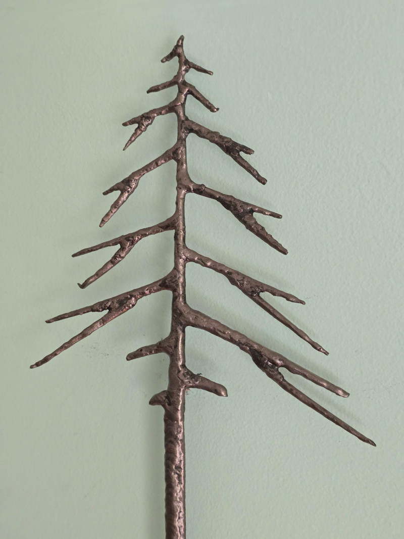 Striking hand‑forged metal sculpture featuring a stylized evergreen form with ascending, tapered branch tiers. The piece is constructed from welded steel elements, each intentionally textured to highlight the maker’s craftsmanship and the organic irregularities of hand‑worked metal. The vertical trunk rises from a sturdy base, supporting horizontal branch plates that create a sculptural silhouette reminiscent of mid‑century decorative ironwork and rustic artisan metalcraft. A stamped mark reading “S‑HL 98” appears on the underside, suggesting either a maker’s code, workshop designation, or date notation. The sculpture presents well from all angles and offers strong decorative presence for industrial, lodge, cabin, or minimalist interiors. Ideal as a standalone art object, mantel accent, or addition to a curated metalwork collection.