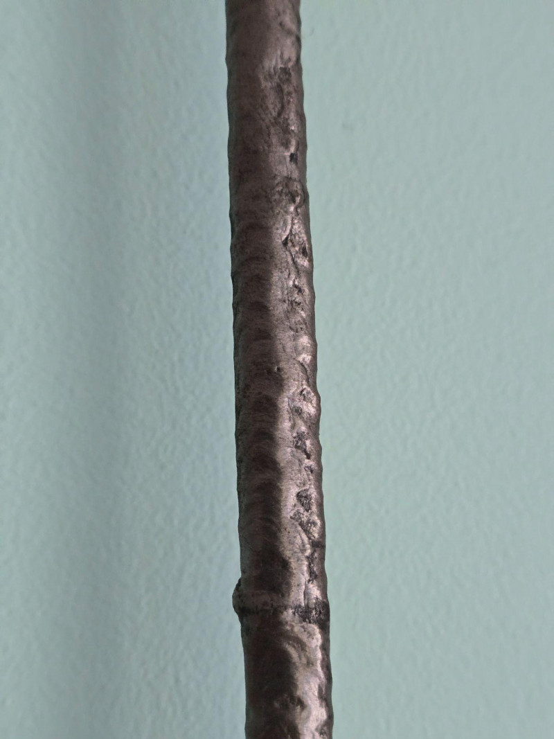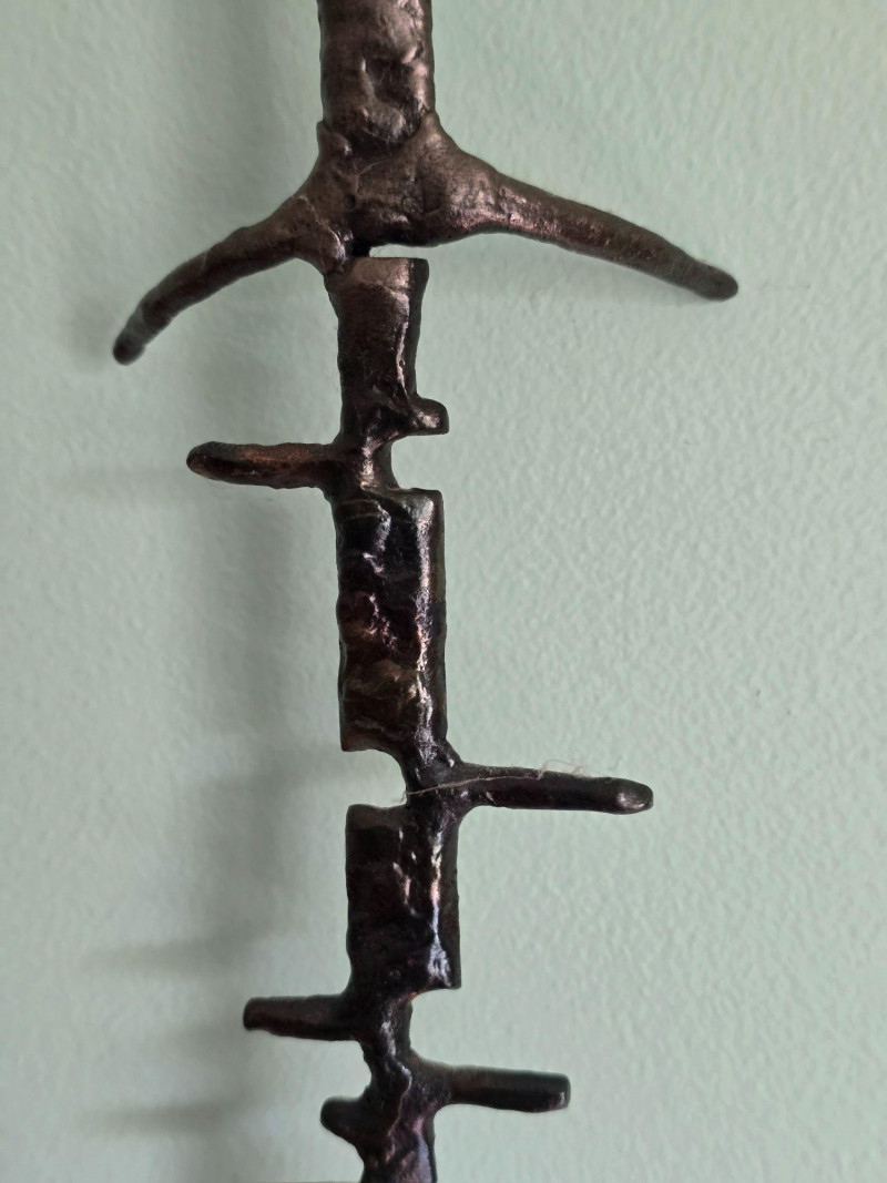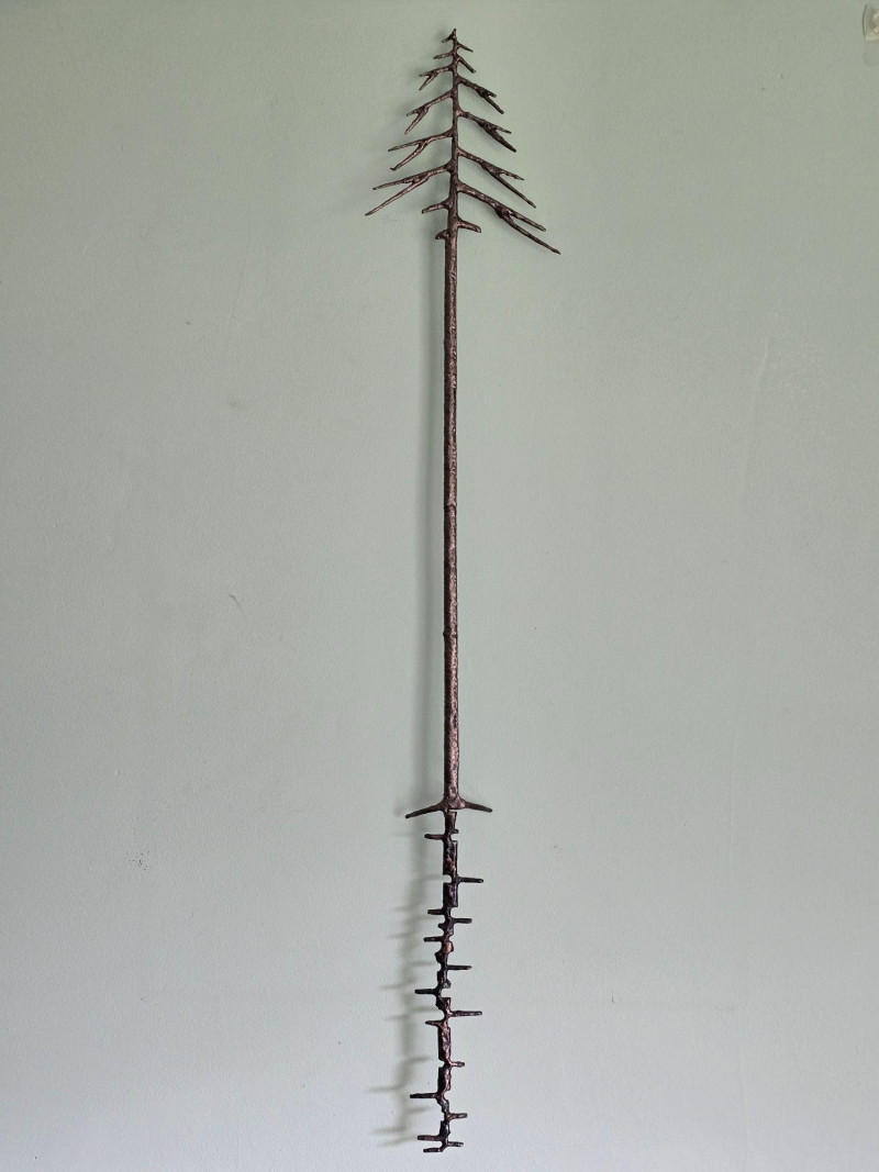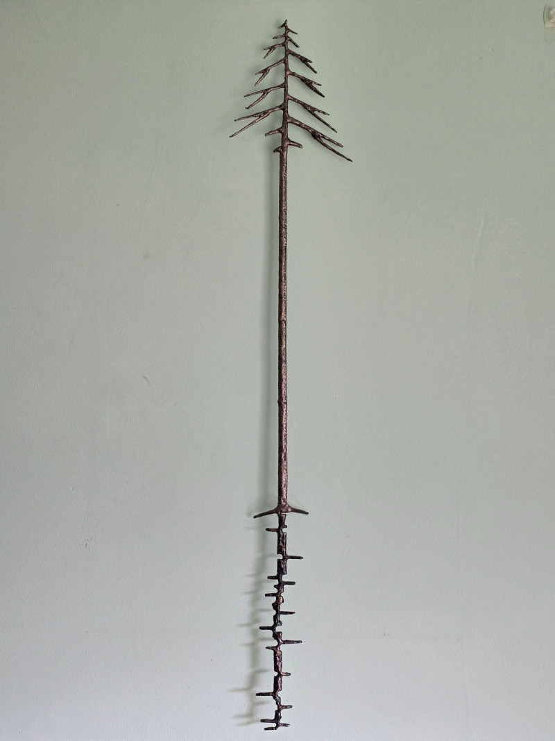 Striking hand‑forged metal sculpture featuring a stylized evergreen form with ascending, tapered branch tiers. The piece is constructed from welded steel elements, each intentionally textured to highlight the maker’s craftsmanship and the organic irregularities of hand‑worked metal. The vertical trunk rises from a sturdy base, supporting horizontal branch plates that create a sculptural silhouette reminiscent of mid‑century decorative ironwork and rustic artisan metalcraft. A stamped mark reading “S‑HL 98” appears on the underside, suggesting either a maker’s code, workshop designation, or date notation. The sculpture presents well from all angles and offers strong decorative presence for industrial, lodge, cabin, or minimalist interiors. Ideal as a standalone art object, mantel accent, or addition to a curated metalwork collection.
