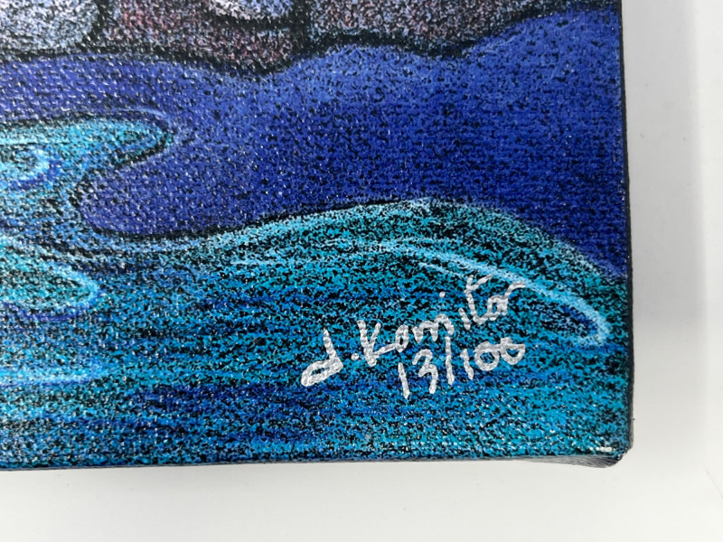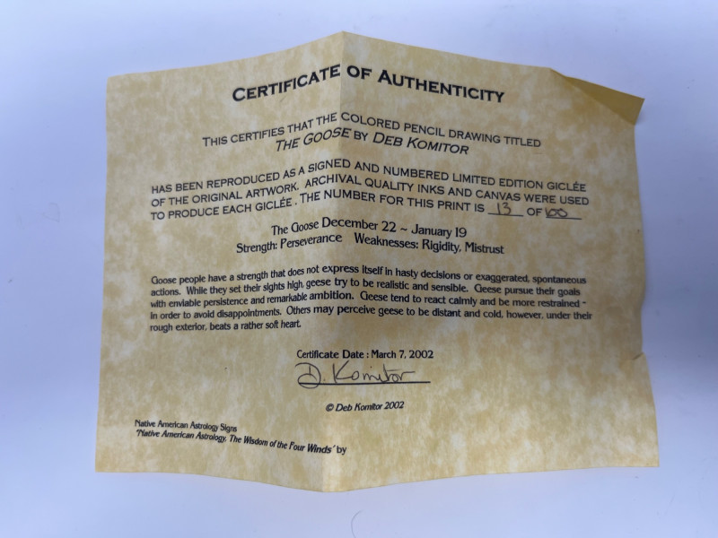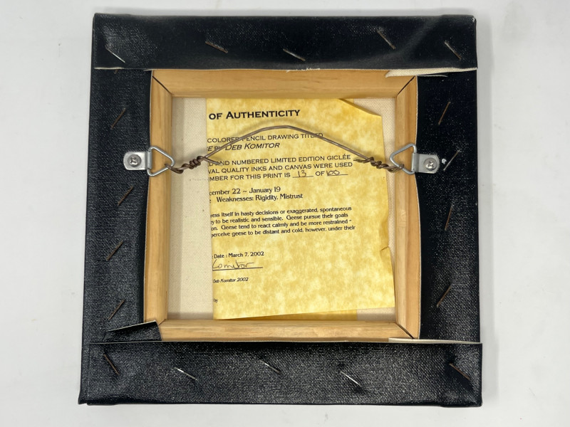 Limited edition giclée print titled The Goose by contemporary artist Deb Komitor, hand‑signed and numbered 13/100. This edition was produced in a run of only 100 and includes its original certificate of authenticity. Komitor’s work is known for its expressive brushwork, layered color fields, and nature‑driven themes. This piece features a stylized goose rendered with her characteristic blend of movement, texture, and atmospheric depth. The print is presented in a frame with hanging hardware attached. A strong offering for collectors of modern wildlife art and limited edition contemporary prints. Includes: