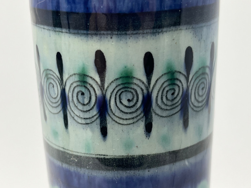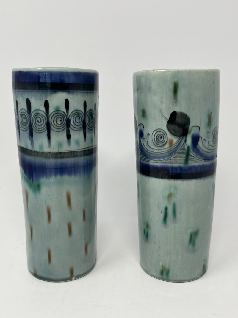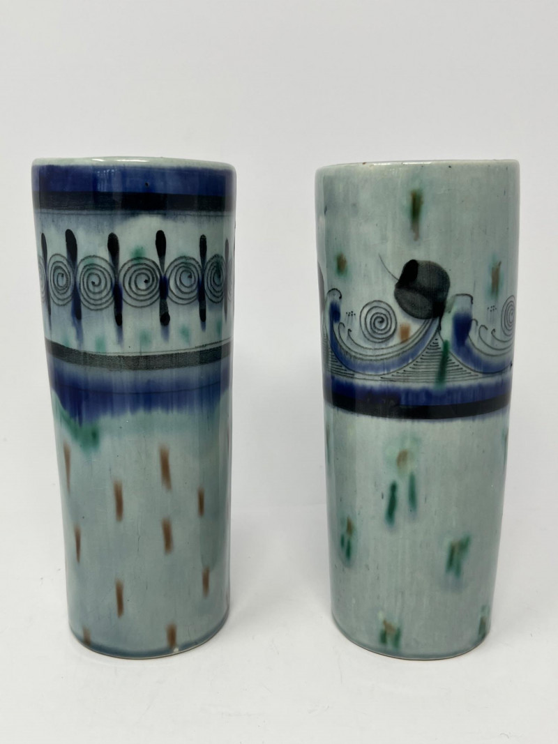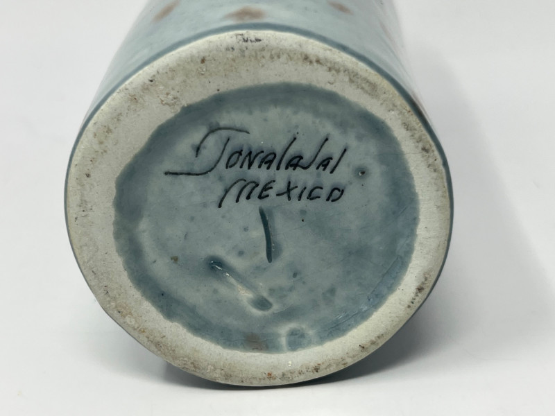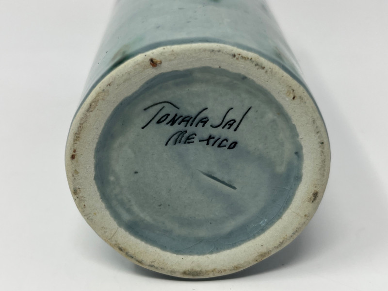 A matched pair of hand‑crafted ceramic tumblers from Tonalá, Jalisco, Mexico, known for its long tradition of regional folk pottery. Each piece features a cylindrical form with a soft gray‑blue ground and layered hand‑painted decoration in deep blue, green, and earthy brown tones. The upper band shows stylized brushwork, spirals, and abstract floral motifs, while the lower section carries scattered vertical accent marks characteristic of Tonalá studio work. Both bases are signed “Tonala Jal Mexico”, confirming origin and handmade production. Details & Notes