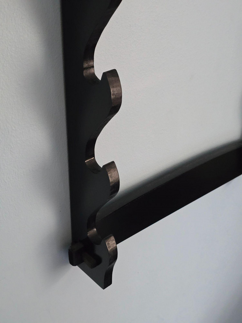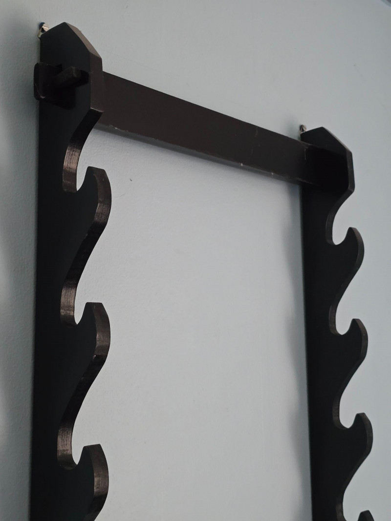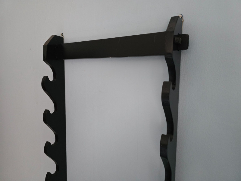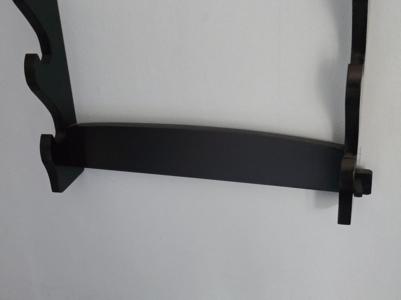 Sturdy wall‑mounted rack designed to hold and display swords horizontally. The lot includes the paired side panels with curved slots and the connecting bars shown. Dark finish with a simple, functional profile suitable for collectors, martial arts enthusiasts, or decorative display. Photos show the current condition and the various incorrect assembly attempts for clarity. The rack components are offered exactly as found from the estate, with visible surface wear and handling marks consistent with prior use. A practical display solution ready for reassembly and mounting.