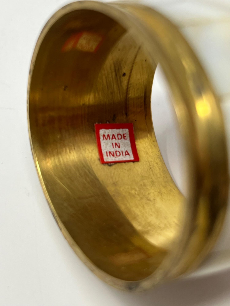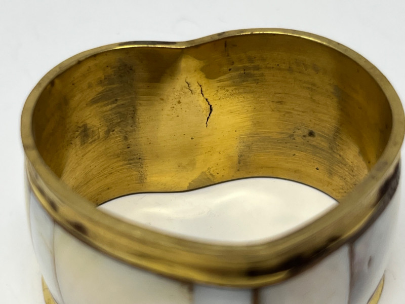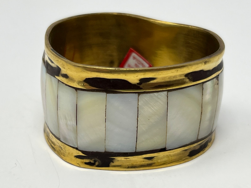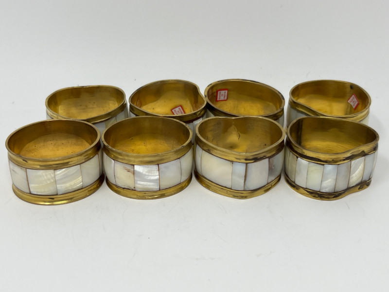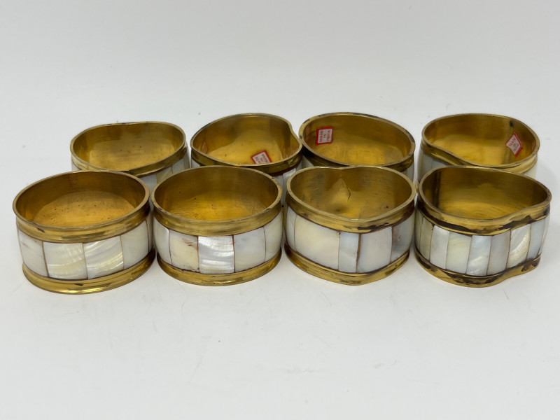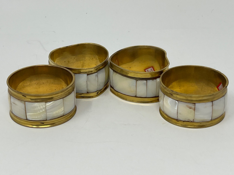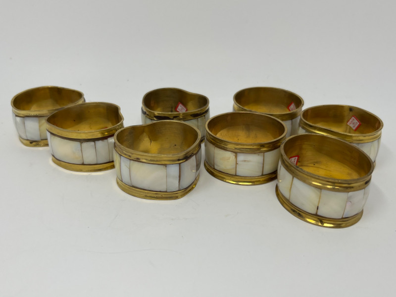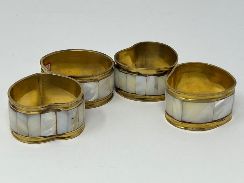 A coordinated group of handcrafted napkin rings featuring a warm gold‑tone interior and rim paired with rectangular white inlay panels along the exterior. The inlay presents a mother‑of‑pearl look, giving the set a refined, luminous finish suited for both everyday table settings and formal dining. The pieces show consistent craftsmanship with smooth edges, clean inlay placement, and a polished metallic interior. One ring retains its original “Made in India” label, confirming origin and typical of artisan tableware produced for export. Offered as a single lot of matching rings. A versatile decorative set for entertaining, staging, or elevating a dining display.