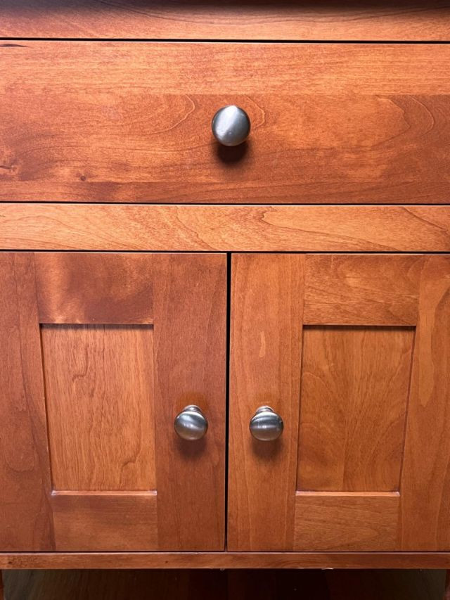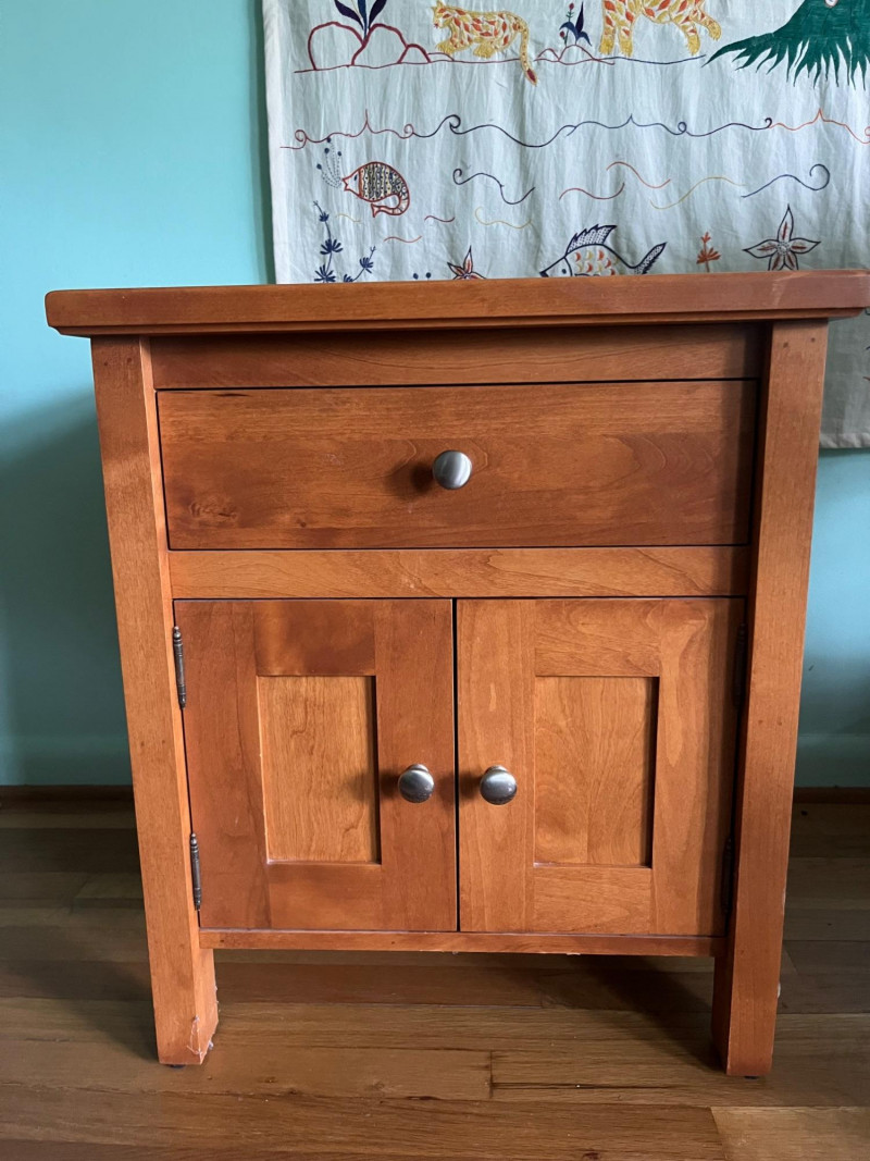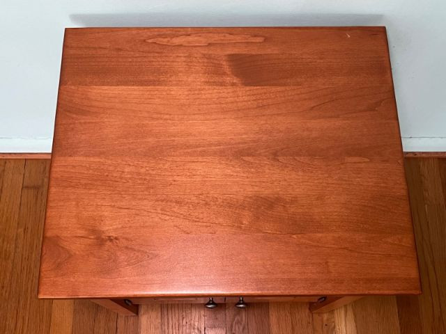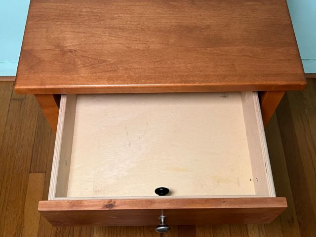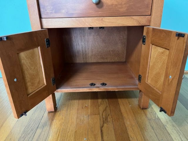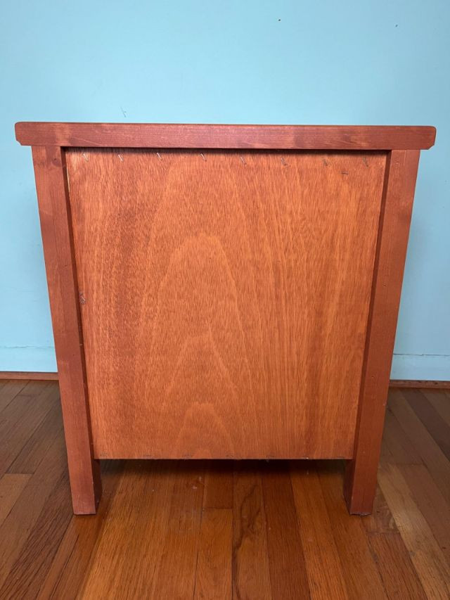A classic wooden nightstand featuring a warm, reddish‑brown finish and straightforward, functional design. The piece includes a smooth‑gliding upper drawer with a round metal pull and a two‑door lower cabinet with matching hardware. Interior storage is clean and well‑kept, offering practical space for bedside or living‑room use. The top surface shows light, expected wear from normal use, and the finish remains even and attractive throughout. Doors and drawer operate properly, and the piece stands solidly on four straight legs. A versatile, traditional style suitable for bedroom, office, or accent use.