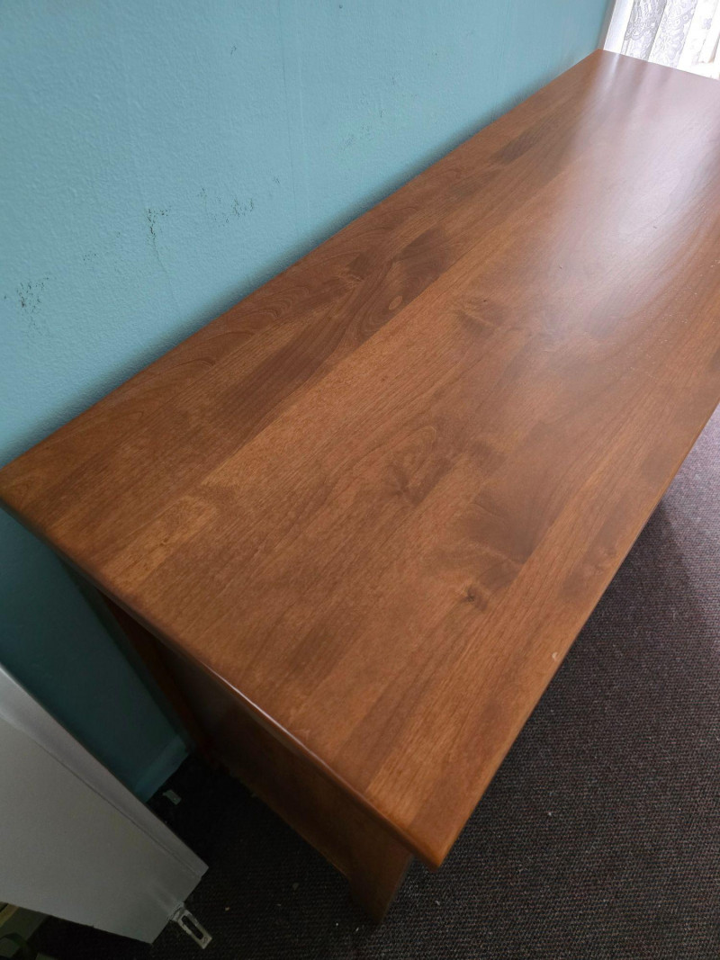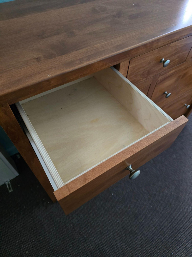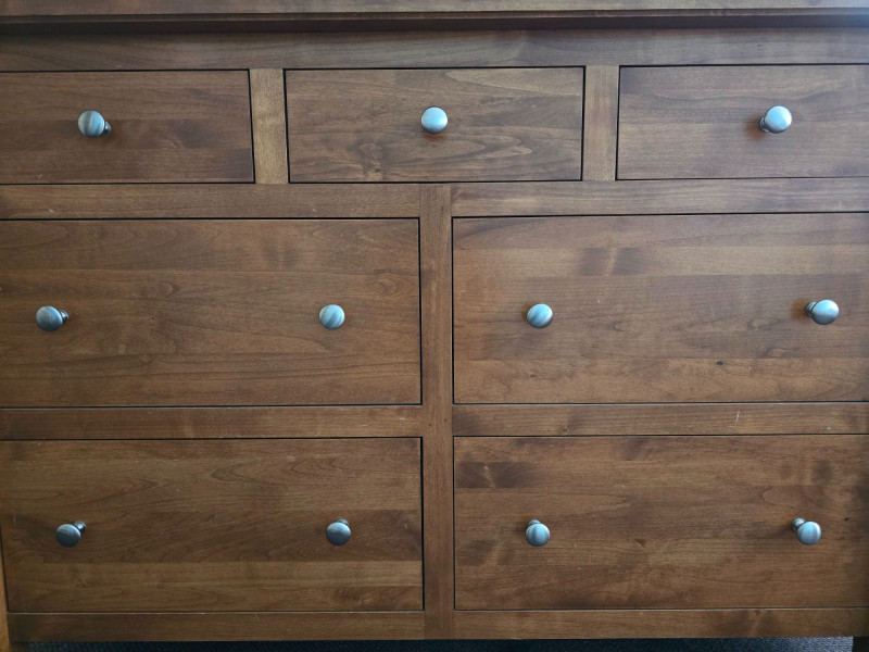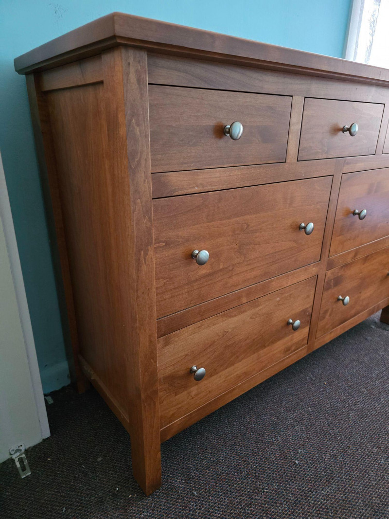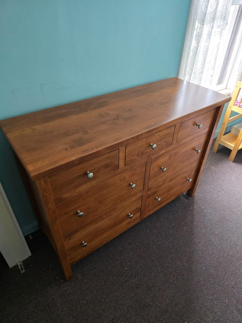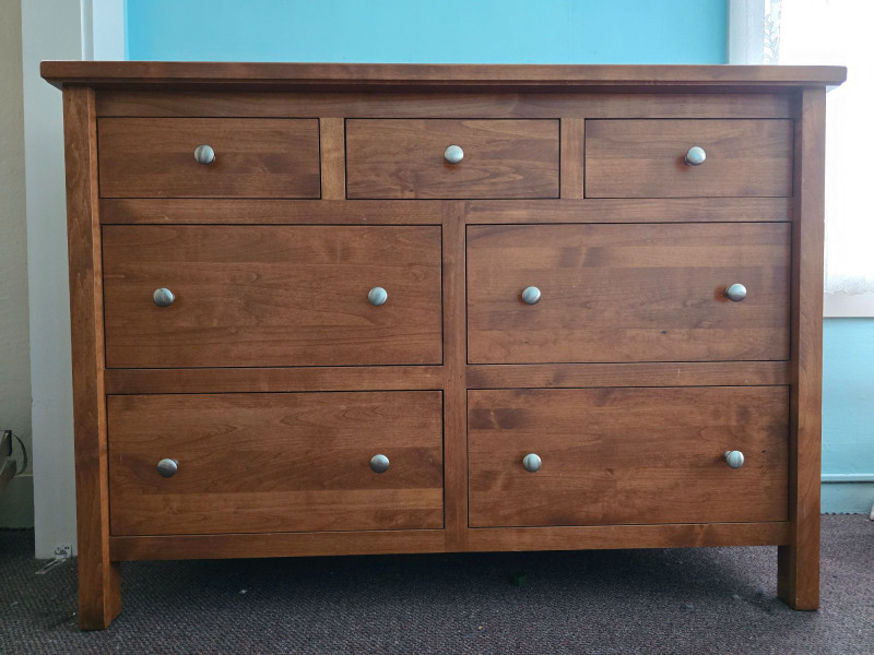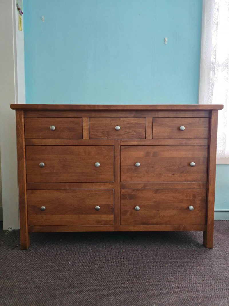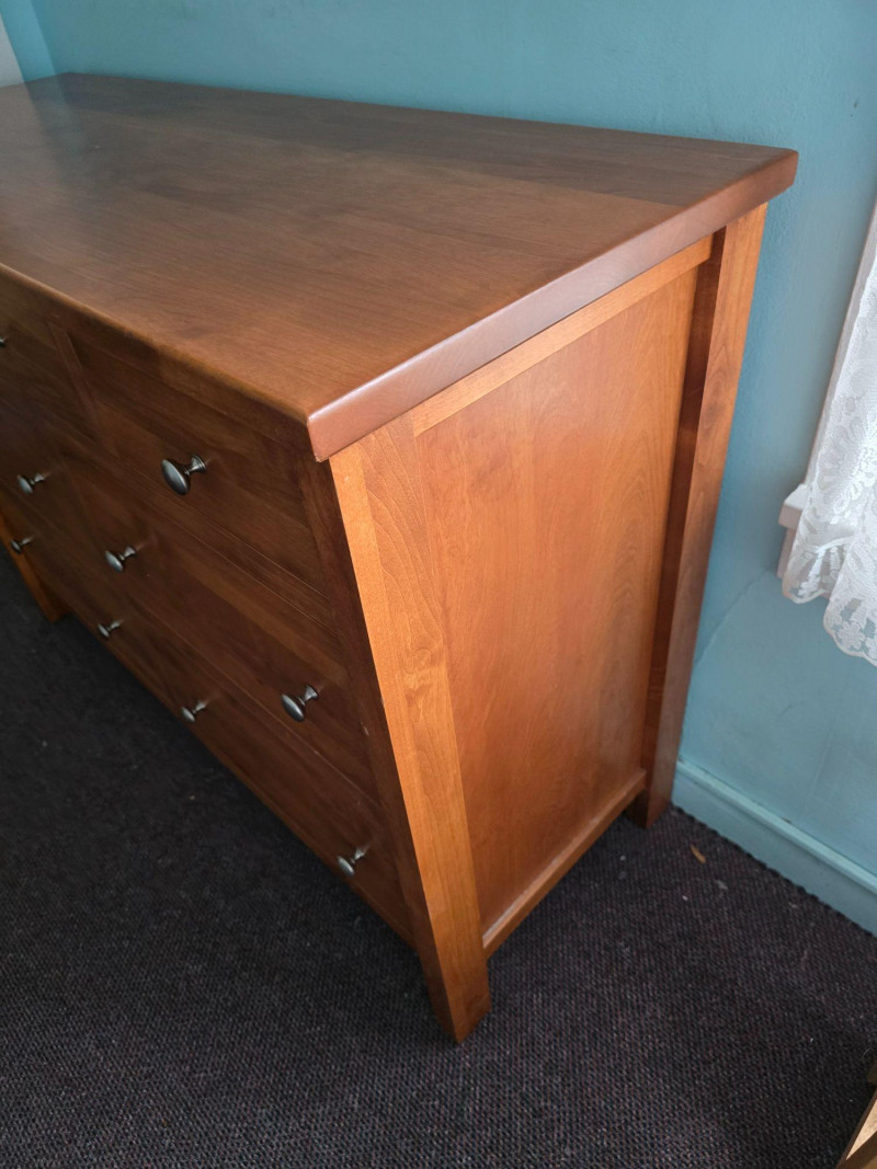 Classic wooden dresser in a warm medium‑tone finish, built with a straightforward, functional silhouette. The piece reflects a traditional American utilitarian style, emphasizing durability, simple lines, and practical storage capacity. Its flat front profile, metal knobs, and unembellished surfaces align with mid‑to‑late 20th‑century everyday furniture design, where emphasis was placed on reliability and ease of use rather than decorative ornamentation. The dresser’s construction details are visible in the photos, including drawer interiors, hardware, and joinery. Surfaces show light wear consistent with age and household use, including minor scuffs and finish variations. Drawers open and close smoothly, and the piece sits evenly. A versatile storage option suitable for bedrooms, guest rooms, or general household organization. Its clean, unfussy form also adapts well to rustic, minimalist, or transitional interiors.