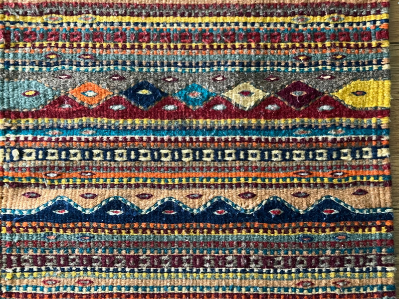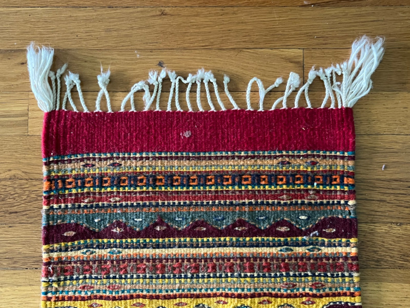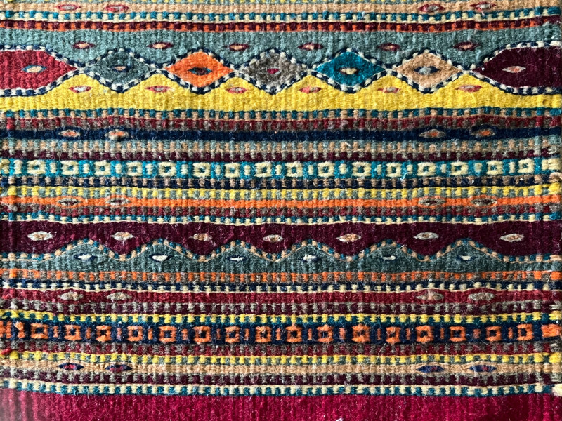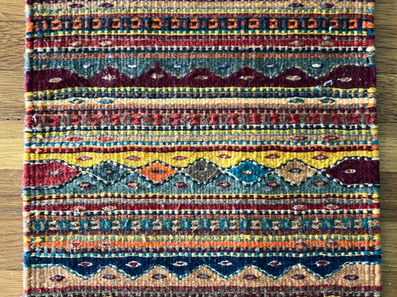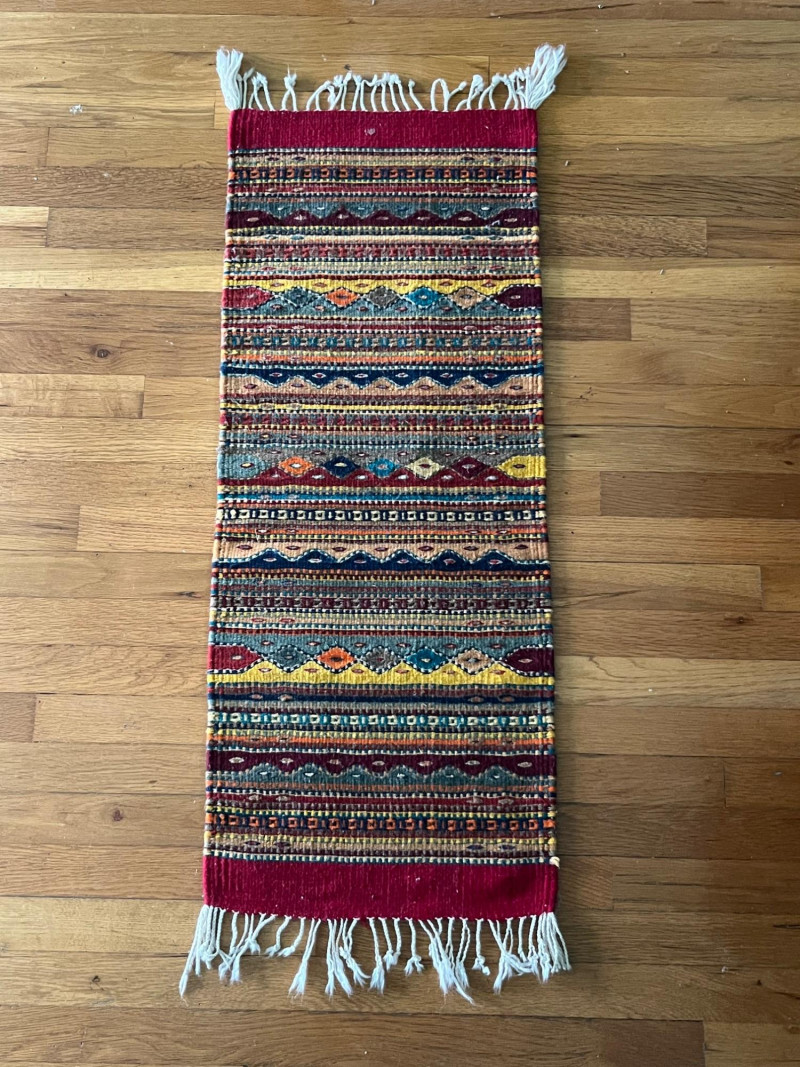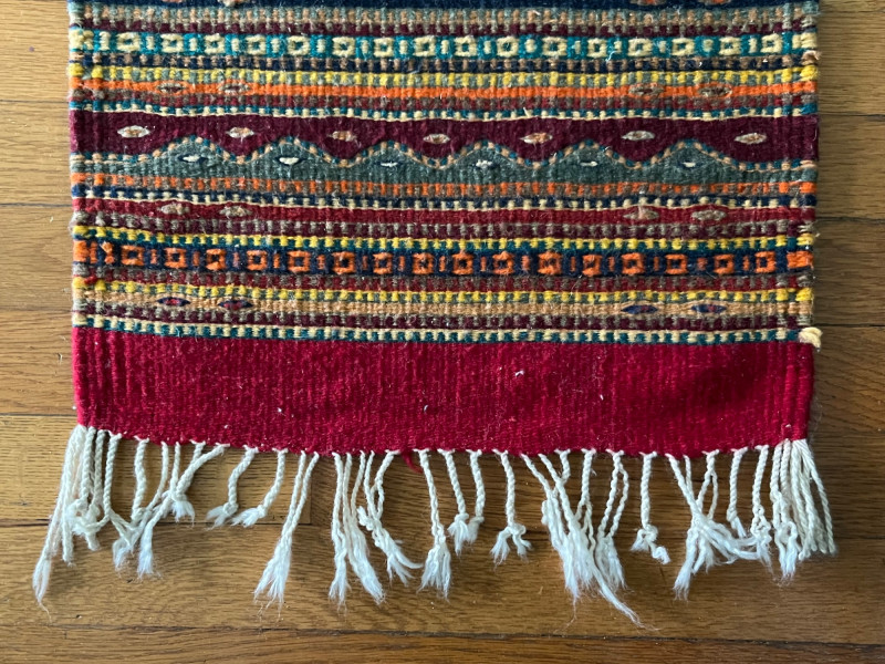Handwoven kilim runner rug featuring horizontal geometric bands in red, yellow, blue, green, and natural tones. The flatweave construction highlights traditional kilim techniques, with crisp pattern transitions and varied motif work across the length of the textile. Both ends are finished with fringe. The runner presents well overall, with consistent weaving and strong visual appeal. Multiple images show pattern details and areas of interest. Suitable for use as a hallway runner, layered textile accent, or decorative wall display.